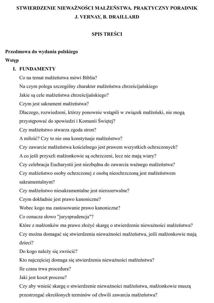 STWIERDZENIE NIEWAŻNOŚCI MAŁŻEŃSTWA. PRAKTYCZNY PORADNIK J. VERNAY, B. DRAILLARD SPIS TREŚCI Przedmowa do wydania polskiego Wstęp I. FUNDAMENTY Co na temat małżeństwa mówi Biblia? Na czym polega szczególny charakter małżeństwa chrześcijańskiego Jakie są cele małżeństwa chrześcijańskiego? Czym jest sakrament małżeństwa? Dlaczego, rozwiedzeni, którzy ponownie wstąpili w związek małżeński, nie mogą przystępować do spowiedzi i Komunii Świętej? Czy małżeństwo stwarza zgoda stron? A miłość? Czy to nie ona konstytuuje małżeństwo? Czy zawarcie małżeństwa kościelnego jest prawem wszystkich ochrzczonych? A co jeśli przyszli małżonkowie są ochrzczeni, lecz nie mają wiary? Czy celebracja Eucharystii jest niezbędna do zawarcia ważnego małżeństwa? Czy małżeństwo osoby ochrzczonej z osobą nieochrzczoną jest małżeństwem sakramentalnym? Czy małżeństwo niesakramentalne jest nierozerwalne? Czym dokładnie jest prawo kanoniczne? Wobec kogo ma zastosowanie prawo kanoniczne? Co oznacza słowo "jurysprudencja"? Które z małżonków ma prawo złożyć skargę o stwierdzenie nieważności małżeństwa? Czy można domagać się stwierdzenia nieważności małżeństwa, jeśli małżonkowie mają dzieci? Do kogo należy się zwrócić? Kto najczęściej domaga się stwierdzenia nieważności małżeństwa? Ile czasu trwa procedura? Jaki jest koszt procesu? Czy aby wnieść skargę o stwierdzenie nieważności małżeństwa, małżonkowie muszą przestrzegać określonych terminów od chwili zawarcia małżeństwa? Czy aby rozpoczać proces o stwierdzenie nieważności małżeństwa, trzeba najpierw posiadac orzeczenie rozwodowe z sądu cywilnego? Orzeczenie nieważności małżeństwa w liczbach Czy można przeprowadzić proces o stwierdzenie nieważności małżeństwa, nie ponosząc przy tym żadnej moralnej szkody? II. Wady zgody małżeńskiej 1. Niezdolność do zawarcia małżeństwa: najczęstsza przyczyna stwierdzania nieważności małżeństwa na świecie (kan. 1095) Osoby, które sąpozbawione wystarczającego używania rozumu (kan. 1095, 1º) Osoby, które mają poważny brak rozeznania oceniającego co do istotnych praw i obowiązków małżeńskich wzajemnie przekazywanych i przyjmowanych (kan. 1095, 2º) Osoby, który z przyczyn natury psychicznej nie są zdolne podjąc istotnych obowiązków małżeńskich (kan. 1095, 3º) 2. Brak minimum wiedzy o małżeństwie 3. Błąd, podstęp, symulacja małżeństwa, symulacja częściowa Błąd co do osoby Błąd co do przymiotu osoby Podstęp Błąd doktrynalny Symulacja całkowita Symulacja częściowa Wykluczenie jedności Wykluczenie potomstwa Wykluczenie nierozerwalności małżeństwa 4. Małżeństwo warunkowe 5. Przymus i bojaźń III. Przeszkody małżeńskie Małżeństwo osoby ochrzczonej z osobą nieochrzczoną – przeszkoda różnicy religii Przeszkoda wieku: 16 lat dla mężczyzny i 14 dla kobiety Przeszkoda niemocy płciowej: niemoc uprzednia i trwała Przeszkoda węzła małżeńskiego Przeszkoda uprowadzenia Przeszkoda występku (małżonkobójstwa) Przeszkoda pokrewieństwa (w lini prostej i do czwartego stopnia linii bocznej) Przeszkoda powinowactwa (w lini prostej) Przeszkoda pokrewieństwa prawnego (powstałego z adopcji) Przeszkoda przyzwoitości publicznej Przeszkoda święceń Przeszkoda profesji zakonnej IV. Braki dotyczace formy kanonicznej Co to jest forma kanoniczna? Kto jest zobowiązany do zachowania formy kanonicznej? Kto jest szafarzem sakramentu małżeństwa? Do kogo się zwrócić? Czy istnieją wyjątki od wymaganej formy? Kiedy ślub cywilny zawarty z dyspensą od formy kanonicznej jest ważny? Uważnienie małżeństwa nieważnego na skutek braku formy Forma kanoniczna a forma liturgiczna V. Proces 1. Właściwy trubunał 2. Pierwsze kroki 3. Instrukcja sprawy (czyli proces dowodzenia nieważności małżeństwa przed sądem) Przesłuchania 4. Dyskusja sprawy i wyrok 5. Apelacja Zakończenie