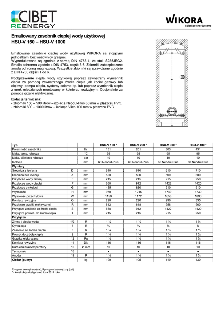 ________________________________________________________________________________________________ Emaliowany zasobnik ciep ej wody u ytkowej HSU-V 150 – HSU-V 1000 Emaliowane zasobniki ciep ej wody u ytkowej WIKORA s stoj cymi jednostkami bez w ownicy grzejnej. Wyprodukowane s zgodnie z norm DIN 4753-1, ze stali S235JRG2. Emalia ochronna zgodnie z DIN 4753, cz 3-6. Zbiorniki zabezpieczone anod ochronn magnezow . Wszystkie zbiorniki s sprawdzane zgodnie z DIN 4753 cz ci 1 do 6. Podgrzewanie ciep ej wody u ytkowej poprzez zewn trzny wymiennik ciep a za pomoc zewn trznego ród a ciep a jak kocio gazowy lub olejowy, pompa ciep a, systemy solarne itp. lub poprzez wymiennik ciep a z rurek miedzianych montowany w ko nierzu rewizyjnym. Opcjonalnie za pomoc grza ki elektrycznej. Izolacja termiczna: - zbiorniki 150 – 500 litrów – izolacja Neodul-Plus 60 mm w p aszczu PVC. - zbiorniki 800 – 1000 litrów – izolacja Vlies 100 mm w p aszczu PVC. Typ Pojemno zasobnika Maks. temp. robocza Maks. ci nienie robocze Izolacja Wymiary rednica z izolacj rednica bez izolacji Przy cze wody zimnej Przy cze wody ciep ej Przy cze cyrkulacji Wysoko Wysoko przechy owa Ko nierz rewizyjny Przy cze grza ki elektrycznej Przy cze zasilenia ze ród a ciep a Przy cze powrotu do ród a ciep a Przy cza Zimna / ciep a woda Cyrkulacja Zasilenie ze ród a ciep a Powrót do ród a ciep a Grza ka elektryczna Ko nierz rewizyjny Rura czujnika temperatury Termometr Anoda Ci ar (pusty) litr °C bar mm HSU-V 150 * 151 95 10 60 Neodul-Plus HSU-V 200 * 201 95 10 60 Neodul-Plus HSU-V 300 * 303 95 10 60 Neodul-Plus HSU-V 400 * 431 95 10 60 Neodul-Plus D d E F G H W O R S T mm mm mm mm mm mm mm mm mm mm mm 610 500 215 668 465 970 1150 290 612 668 215 610 500 215 912 620 1215 1172 290 648 912 215 610 500 215 1422 910 1740 1650 290 958 1422 215 710 600 250 1420 910 1730 1696 335 960 1420 250 1/2 3 8 9 12 14 15 16 19 R R R R Rp Dia Ø mm 1¼ ¾ 1¼ 1¼ 1½ 116 10 1¼ ¾ 1¼ 1¼ 1½ 116 10 1¼ ¾ 1¼ 1¼ 1½ 116 10 1½ ¾ 1½ 1½ 1½ 116 10 R kg 1¼ 100 1¼ 105 1¼ 110 1¼ 130 R = gwint zewn trzny (cal), Rp = gwint wewn trzny (cal) * - konstrukcja dost pna od lipca 2014 roku. ________________________________________________________________________________________________ HSU-V 300/400/500 Typ Pojemno zasobnika Maks. temp. robocza Maks. ci nienie robocze Izolacja Wymiary rednica z izolacj rednica bez izolacji Przy cze wody zimnej Przy cze wody ciep ej Przy cze cyrkulacji Wysoko Wysoko przechy owa Ko nierz rewizyjny Przy cze grza ki elektrycznej Przy cze zasilenia ze ród a ciep a Przy cze powrotu ze ród a ciep a Przy cza Zimna / ciep a woda Cyrkulacja Zasilenie ze ród a ciep a Powrót do ród a ciep a Grza ka elektryczna Odpowietrzenie Ko nierz rewizyjny Rura czujnika temperatury Listwa przy czeniowa czujnika Termometr Anoda Ci ar (pusty) HSU-V 800/1000 litr °C bar mm HSU-V 500 * 507 95 10 60 Neodul-Plus HSU-V 800 * 830 95 10 100-Vlies HSU-V 1000 * 990 95 10 100-Vlies D d E F G H W O R S T mm mm mm mm mm mm mm mm mm mm mm 710 600 250 1690 1121 1990 1946 335 650 1690 250 990 790 266 1540 1209 1880 1891 405 995 1540 266 990 790 266 1855 1446 2195 2227 405 1135 1855 266 1/2 3 8 9 12 13 14 15 15 16 19 R R R R Rp Rp Dia Ø mm 1½ ¾ 1½ 1½ 1½ 116 10 - 1½ ¾ 1½ 1½ 2 1¼ 205 - 1½ ¾ 1½ 1½ 2 1¼ 205 - R kg 1¼ 160 1¼ 218 1¼ 252 R = gwint zewn trzny (cal), Rp = gwint wewn trzny (cal) * - konstrukcja dost pna od lipca 2014 roku. Wersja 07/2014