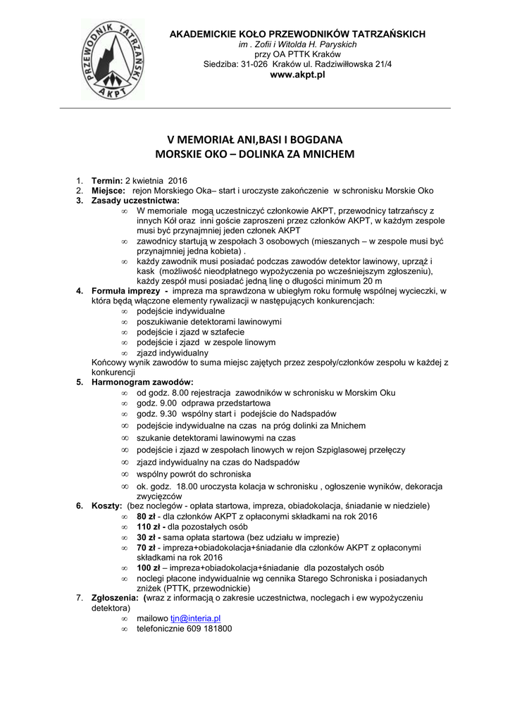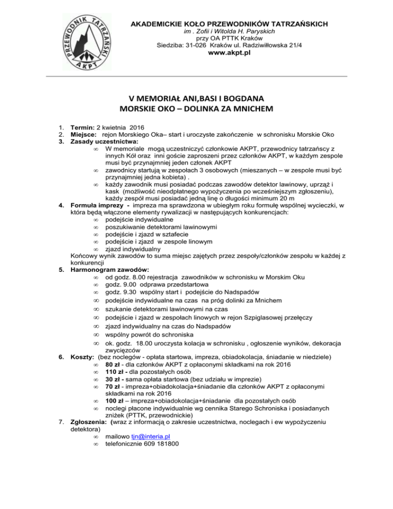 AKADEMICKIE KOŁO PRZEWODNIKÓW TATRZAŃSKICH im . Zofii i Witolda H. Paryskich przy OA PTTK Kraków Siedziba: 31-026 Kraków ul. Radziwiłłowska 21/4 www.akpt.pl V MEMORIAŁ ANI,BASI I BOGDANA MORSKIE OKO – DOLINKA ZA MNICHEM 1. Termin: 2 kwietnia 2016 2. Miejsce: rejon Morskiego Oka– start i uroczyste zakończenie w schronisku Morskie Oko 3. Zasady uczestnictwa: • W memoriale mogą uczestniczyć członkowie AKPT, przewodnicy tatrzańscy z innych Kół oraz inni goście zaproszeni przez członków AKPT, w każdym zespole musi być przynajmniej jeden członek AKPT • zawodnicy startują w zespołach 3 osobowych (mieszanych – w zespole musi być przynajmniej jedna kobieta) . • każdy zawodnik musi posiadać podczas zawodów detektor lawinowy, uprząż i kask (możliwość nieodpłatnego wypożyczenia po wcześniejszym zgłoszeniu), każdy zespół musi posiadać jedną linę o długości minimum 20 m 4. Formuła imprezy - impreza ma sprawdzona w ubiegłym roku formułę wspólnej wycieczki, w która będą włączone elementy rywalizacji w następujących konkurencjach: • podejście indywidualne • poszukiwanie detektorami lawinowymi • podejście i zjazd w sztafecie • podejście i zjazd w zespole linowym • zjazd indywidualny Końcowy wynik zawodów to suma miejsc zajętych przez zespoły/członków zespołu w każdej z konkurencji 5. Harmonogram zawodów: • od godz. 8.00 rejestracja zawodników w schronisku w Morskim Oku • godz. 9.00 odprawa przedstartowa • godz. 9.30 wspólny start i podejście do Nadspadów • podejście indywidualne na czas na próg dolinki za Mnichem • szukanie detektorami lawinowymi na czas • podejście i zjazd w zespołach linowych w rejon Szpiglasowej przełęczy • zjazd indywidualny na czas do Nadspadów • wspólny powrót do schroniska • ok. godz. 18.00 uroczysta kolacja w schronisku , ogłoszenie wyników, dekoracja zwycięzców 6. Koszty: (bez noclegów - opłata startowa, impreza, obiadokolacja, śniadanie w niedziele) • 80 zł - dla członków AKPT z opłaconymi składkami na rok 2016 • 110 zł - dla pozostałych osób • 30 zł - sama opłata startowa (bez udziału w imprezie) • 70 zł - impreza+obiadokolacja+śniadanie dla członków AKPT z opłaconymi składkami na rok 2016 • 100 zł – impreza+obiadokolacja+śniadanie dla pozostałych osób • noclegi płacone indywidualnie wg cennika Starego Schroniska i posiadanych zniżek (PTTK, przewodnickie) 7. Zgłoszenia: (wraz z informacją o zakresie uczestnictwa, noclegach i ew wypożyczeniu detektora) • mailowo [email protected] • telefonicznie 609 181800