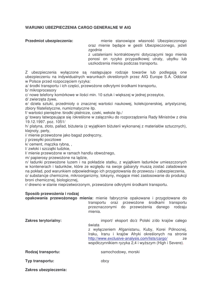WARUNKI UBEZPIECZENIA CARGO GENERALNE W AIG Przedmiot ubezpieczenia: mienie stanowi ce własno Ubezpieczonego oraz mienie b d ce w gestii Ubezpieczonego, je eli zgodnie z ustaleniami kontraktowymi dotycz cymi tego mienia ponosi on ryzyko przypadkowej utraty, ubytku lub uszkodzenia mienia podczas transportu. Z ubezpieczenia wył czone s nast puj ce rodzaje towarów lub podlegaj one ubezpieczeniu na indywidualnych warunkach okre lonych przez AIG Europe S.A. Oddział w Polsce przed rozpocz ciem ryzyka: a/ rodki transportu i ich cz ci, przewo one odkrytymi rodkami transportu, b/ mikroprocesory c/ nowe telefony komórkowe w ilo ci min. 10 sztuk i wi kszej w jednej przesyłce, d/ zwierz ta ywe, e/ dzieła sztuki, przedmioty o znacznej warto ci naukowej, kolekcjonerskiej, artystycznej, zbiory filatelistyczne, numizmatyczne itp. f/ warto ci pieni ne / rodki płatnicze, czeki, weksle itp./ g/ towary łatwopsuj ce si /okre lone w zał czniku do rozporz dzenia Rady Ministrów z dnia 19.12.1997. poz. 1051/ h/ platyna, złoto, pallad, bi uteria (z wyj tkiem bi uterii wykonanej z materiałów sztucznych), klejnoty, perły, i/ mienie przewo one jako baga podr czny, j/ przesyłki pocztowe k/ cement, m czka rybna, , l/ zwłoki i szcz tki ludzkie, ł/ mienie przewo one w ramach handlu obwo nego, m/ papierosy przewo one na l dzie, n/ ładunki przewo one luzem i na pokładzie statku, z wyj tkiem ładunków umieszczonych w kontenerach i ładunków, które ze wzgl du na swoje gabaryty musz zosta załadowane na pokład, pod warunkiem odpowiedniego ich przygotowania do przewozu i zabezpieczenia, o/ substancje chemiczne, mikroorganizmy, toksyny, mog ce mie zastosowanie do produkcji broni chemicznej, biologicznej, r/ drewno w stanie nieprzetworzonym, przewo one odkrytymi rodkami transportu. Sposób przewo enia i rodzaj opakowania przewo onego mienia: mienie fabrycznie opakowane i przygotowane do transportu oraz przewo one rodkami transportu przeznaczonymi do przewo enia danego rodzaju mienia. Zakres terytorialny: import/ eksport do/z Polski z/do krajów całego wiata z wył czeniem Afganistanu, Kuby, Korei Północnej, Iraku, Iranu i krajów Afryki okre lonych na stronie http://www.exclusive-analysis.com/lists/cargo/ ze współczynnikiem ryzyka 2,4 i wy szym (High i Severe). Rodzaj transportu: samochodowy, morski Typ transportu: obcy Zakres ubezpieczenia: transport morski: zakres pełny - Institute Cargo Clauses (A) 1/1/82 + Institute Classification Clause 01/01/2001, + Institute War Clauses1/1/82, + Institute War Cancellation Clause (Cargo) 1/12/82 zakres pełny - Institute Cargo Clauses (A) 1/1/82 transport samochodowy: Stosuje si do wszystkich rodzajów transportów: + załadunek, rozładunek, przeładunek i składowanie wynikaj ce ze zwykłego przebiegu transportu, + Institute Strike Clauses 1/1/82, + War&Strikes Risk Premium Clause, + ISM Endorsement Clause, + Institute Replacement Clause 1/1/34, + Institute Extended Radioactive Contamination Exclusion Clause 1/11/02, + Institute Radioactive Contamination, Chemical, Bio, Bio-Chemical, Electromagnetic Weapons Exclusion Clause 10/11/03, + Termination of Transit Clause (Terrorism), + postanowienia dodatkowe, + klauzule dodatkowe okre lone poni ej. W sprawach nieuregulowanych powy szymi klauzulami zastosowanie maj w transporcie (cargo) AlG Europe S.A. Oddział w Polsce. OWU mienia Maksymalna warto przewo onego mienia na 1 rodek transportu (limit odpowiedzialno ci)/ TRANSPORT KRAJOWY Limit odpowiedzialno ci 5 000 PLN TRANSPORT MI DZYNARODOWY Rodzaj przesyłki Limit odpowiedzialno ci Franszyza integralna: całokontenerowa 50 000 USD drobnicowa 8 000 USD 100,- PLN w ka dej szkodzie Klauzule dodatkowe: Klauzula ubezpieczenia mienia u ywanego Je eli nie umówiono si inaczej, mienie u ywane podlega ubezpieczeniu w takim samym zakresie jak mienie nowe, jednak e z ubezpieczenia wył czone s wszelkie szkody polegaj ce na ubytku lub uszkodzeniu mienia powstałych na skutek zwykłego u ytkowania ubezpieczonego mienia podczas prowadzonej przez Ubezpieczonego działalno ci gospodarczej. Postanowienia dodatkowe: Art. VI ust. 3.2. OWU mienia w transporcie (cargo) AlG Europe S.A. Oddział w Polsce zostaje wykre lony. Definicja „przesyłki” Przesyłka – ubezpieczony ładunek uj ty na li cie ładunkowej, przedło ony do przyj cia lub przyj ty przez operatora w celu przemieszczenia i dor czenia adresatowi. W przypadku zbiegu roszcze z tytułu dwóch lub wi cej umów ubezpieczenia AIG Europe S.A. Oddział w Polsce odpowiada proporcjonalnie w takim stosunku, w jakim pozostaje limit odpowiedzialno ci wynikaj cy z niniejszej polisy do sumy limitów odpowiedzialno ci ze wszystkich umów ubezpieczenia obejmuj cych ochron przedmiot ubezpieczenia, który uległ szkodzie.