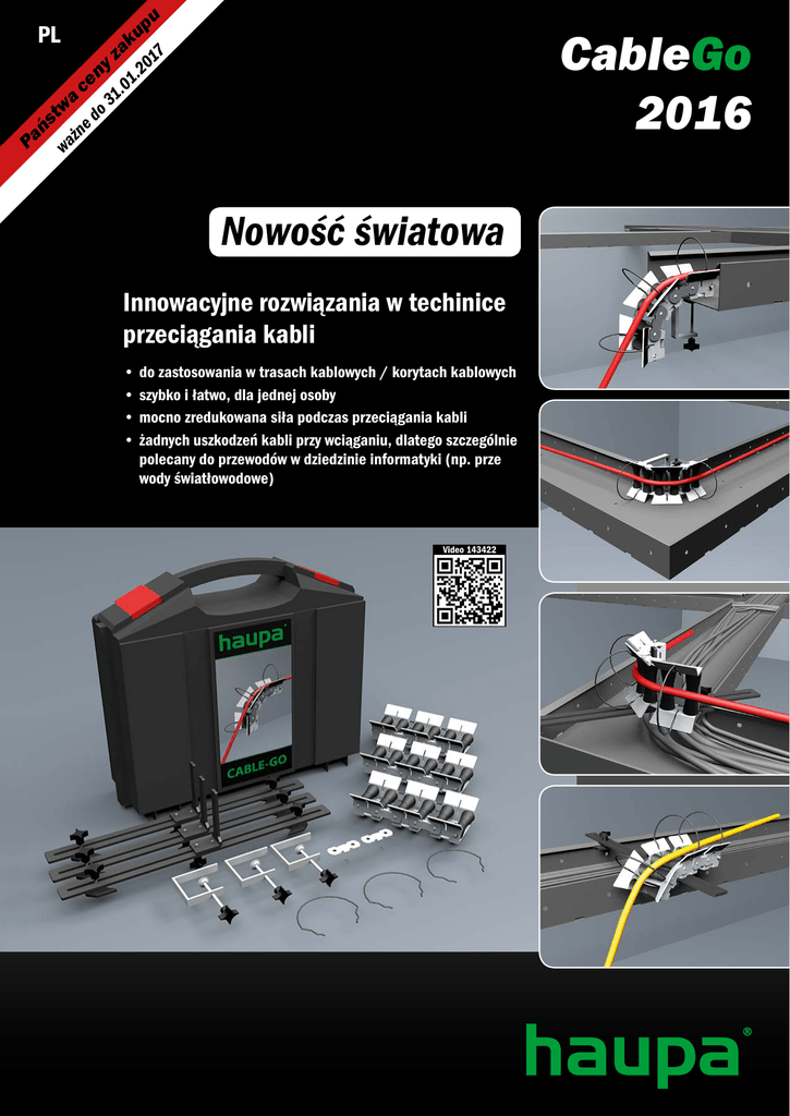 31 .0 zak 1. 20 up u 17 Weltneuheit! e do Pa ńs wa tw a żn ce ny PL Nowość światowa Innowacyjne rozwiązania w techinice przeciągania kabli •do zastosowania w trasach kablowych / korytach kablowych •szybko i łatwo, dla jednej osoby •mocno zredukowana siła podczas przeciągania kabli •żadnych uszkodzeń kabli przy wciąganiu, dlatego szczególnie polecany do przewodów w dziedzinie informatyki (np. prze wody światłowodowe) Video 143422 CableGo 2016 System wciągania „CableGo“ starter Zawartość w walizce z tworzywa: 1 x Moduł podstawowy „CableGo“ + 3 obręcze zabezpieczające 1 x Klamra mocująca „CableGo“ 1 x Listwa mocująca „CableGo“ System wciągania „CableGo“ profi Art. nr. 143420 6-elem. Netto Zł 508,- Art. nr. 143422 14-elem. Zawartość w walizce z tworzywa: 3 x Moduł podstawowy „CableGo“ + 3 obręcze zabezpieczające 3 x Klamra mocująca „CableGo“ 3 x Listwa mocująca „CableGo“ 1 x Złączki modułu podstawowego „CableGo“ 1040,- System wciągania „CableGo“ master Art. nr. 143424 17-elem. Netto Zł Zawartość w walizce z tworzywa: 5 x Moduł podstawowy „CableGo“ + 3 obręcze zabezpieczające 5 x Klamra mocująca „CableGo“ 5 x Listwa mocująca „CableGo“ 1 x Złączki modułu podstawowego „CableGo“ 1548,- SysCon System wciągania „CableGo“ starter Art. nr. 143430 6-elem. Zawartość w SysCon box systemowy art. 220372: 1 x Moduł podstawowy „CableGo“ + 3 obręcze zabezpieczające 1 x Klamra mocująca „CableGo“ 1 x Listwa mocująca „CableGo“ Netto Zł Netto Zł 684,- Art. nr. 143432 14-elem. SysCon System wciągania „CableGo“ profi Zawartość w SysCon box systemowy art. 220372: 3 x Moduł podstawowy „CableGo“ + 3 obręcze zabezpieczające 3 x Klamra mocująca „CableGo“ 3 x Listwa mocująca „CableGo“ 1 x Złączki modułu podstawowego „CableGo“ SysCon System wciągania „CableGo“ master Zawartość w SysCon box systemowy art. 220372: 5 x Moduł podstawowy „CableGo“ + 3 obręcze zabezpieczające 5 x Klamra mocująca „CableGo“ 5 x Listwa mocująca „CableGo“ 1 x Złączki modułu podstawowego „CableGo“ Netto Zł 1210,- Art. nr. 143434 17-elem. Netto Zł 1728,- 04.2016 6 Moduł podstawowy „CableGo“ + 3 obręcze zabezpieczające Moduł podstawowy ułatwiający wciaganie kabli w kątach i zagieciach. Klamra mocująca „CableGo“ Klamra do mocowania modułu podstawowego. Art. nr. 143440 4-elem. Netto Zł 226,- Art. nr. 143441 1-elem. Netto Zł 42,- Listwa mocująca „CableGo“ Listwa do zamocowania modułu podstawowego. Art. nr. 143442 7-elem. Netto Zł 192,- Złączki modułu podstawowego „CableGo“ Złączka do łączenie kilku modułów podstawowyche. Art. nr. 143443 2-elem. Netto Zł 35,- Zestaw 3 obręczy zabezpieczających „CableGo“ Obręcz zabezpieczająca do modułu podstawowego. Art. nr. 143444 3-elem. Netto Zł 46,- ... rozwiązania, które przekonują HAUPA POLSKA Sp. z o.o., ul. Norwida 11, PL 55-100 Trzebnica, Tel.: +48 713874813, Fax: +48 713874814, [email protected]. Ceny obowiązują do 31.01.2017 i są promocyjnymi cenami netto. Zastrzega się możliwość zmian technicznych i błędów w druku. 7 ... rozwiązania, które przekonują HAUPA POLSKA Sp. z o.o., ul. Norwida 11, PL 55-100 Trzebnica, Tel.: +48 713874813, Fax: +48 713874814, [email protected]. Ceny obowiązują do 31.01.2017 i są promocyjnymi cenami netto. Zastrzega się możliwość zmian technicznych i błędów w druku.