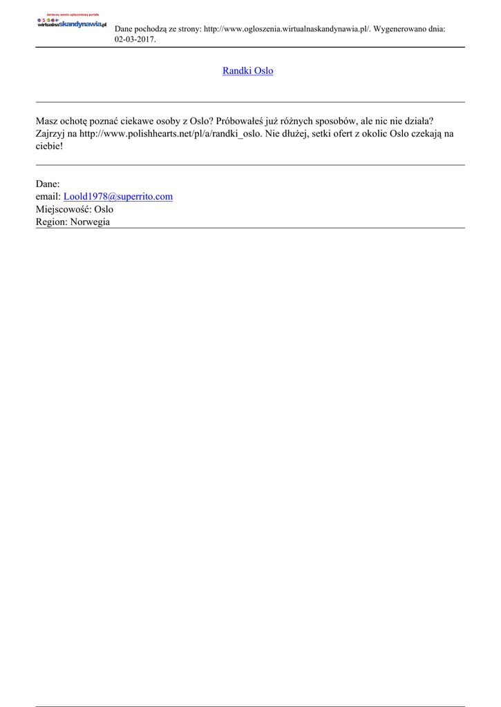 Dane pochodzą ze strony: http://www.ogloszenia.wirtualnaskandynawia.pl/. Wygenerowano dnia: 02-03-2017. Randki Oslo Masz ochotę poznać ciekawe osoby z Oslo? Próbowałeś już różnych sposobów, ale nic nie działa? Zajrzyj na http://www.polishhearts.net/pl/a/randki_oslo. Nie dłużej, setki ofert z okolic Oslo czekają na ciebie! Dane: email: [email protected] Miejscowość: Oslo Region: Norwegia