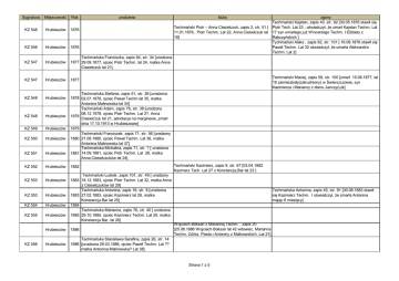 Sygnatura Miejscowość Rok KZ 546 Hrubieszów 1876 KZ 546 Hrubieszów 1876 KZ 547 Hrubieszów Techmańska Franciszka, zapis 64, str. 34 [urodzona 1877 29.09.1877, ojciec Piotr Techm. lat 24, matka Anna Ciesielczuk lat 21] KZ 547 Hrubieszów 1877 KZ 548 Hrubieszów KZ 548 Hrubieszów KZ 549 Hrubieszów KZ 550 Hrubieszów KZ 551 Hrubieszów KZ 552 Hrubieszów KZ 553 Hrubieszów KZ 553 Hrubieszów KZ 554 Hrubieszów KZ 555 Hrubieszów KZ 556 śluby urodzenia Techmański Piotr – Anna Ciesielczuk, zapis 2, str, 51 [ 11.01.1876, Piotr Techm. Lat 22, Anna Ciesielczuk lat 19] zgony Techmański Kajetan, zapis 43, str. 92 [30.05.1876 stawił się Piotr Tech. Lat 23 , oświadczył, że zmarł Kajetan Techm. Lat 17 syn umarłego już Wincentego Techm. I Elżbiety z Rabczyńskich ] Tychmański Aleks , zapis 62, str. 101 [ 16.09.1876 stawił się Paweł Techm. Lat 32 oświadczył, że umarła Aleksandra Techm. Lat 2] Techmański Maciej, zapis 58, str. 100 [zmarł 15.08.1877, lat 18 zamieszkały(zatrudniony) w Świerszczowie, syn Kazimierza i Marianny z domu Janczy(u)k] Techmańska Stefania, zapis 51, str. 26 [urodzona 1878 02.07.1878, ojciec Paweł Techm lat 35, matka Antonina Malinowska lat 34] Techmański Adam, zapis 76, str. 38 [urodzony 08.12.1978, ojciec Piotr Techm. Lat 2?, Anna 1878 Ciesielczuk lat 21, adnotacja na marginesie „zmarł dnia 17.10.1913 w Hrubieszowie] 1879 Techmański Franciszek, zapis 71, str. 56 [urodzony 1880 21.09.1880, ojciec Paweł Techm. Lat 36, matka Antonina Malinowska lat 37] Techmańska Michalina, zapis 71, str. ? [ urodzona 1881 14.09.1881, ojciec Piotr Techm. Lat 28, matka Anna Ciesielczuków lat 24] 1882 Techmański Kazimierz, zapis 9, str. 67 [03.04.1882 Kazimerz Tech. Lat 27 z Konstancją Bar lat 23 ] Techmański Ludwik, zapis 101, str. 49 [ urodzony 1883 18.12.1883, ojciec Piotr Techm. Lat 32, matka Anna z Ciesielczuków lat 29] Techmańska Antonina, zapis 19, str. 8 [urodzona 1883 27.02.1883, ojciec Kazimierz lat 28, matka Konstancja Bar lat 25] 1884 Techmańska Marianna, zapis 76, str. 40 [ urodzona 1885 29.10.1885, ojciec Kazimierz Techm. Lat 29, matka Konstancja Bar, lat 26] Hrubieszów 1886 Hrubieszów Techmańska Stanisława Serafina, zapis 26, str. 14 1886 [urodzona 29.03.1886, ojciec Paweł Techm. Lat ?? matka Antonina Malinowska? Lat 38] Techmańska Antonina, zapis 45, str. 91 [30.08.1883 stawił się Kazimierz Techm. I oświadczył, że zmarła Antonina mając 6 miesięcy] Wojciech Boksan z Marianną Techm. , zapis 20 [25.08.1886 Wojciech Boksan lat 42 wdowiec, Marianna Techm. Córka Pawła i Antoniny z Malinowskich, Lat 21] Strona 1 z 5 Sygnatura Miejscowość Hrubieszów KZ 557 Hrubieszów KZ 558 Hrubieszów KZ 558 Hrubieszów Hrubieszów KZ 559 Hrubieszów KZ 560 Hrubieszów 2376 Hrubieszów 2625 Hrubieszów 18 Hrubieszów 19 Hrubieszów 20 Hrubieszów 21 Hrubieszów 22 Hrubieszów 22 Hrubieszów 24 Hrubieszów 25 Hrubieszów śluby Rok urodzenia Techmańska Teresa, zapis 101, str. 57 [ urodzona 1886 27.09.1886, ojciec Piotr. Lat 33, matka Anna z Ciesielczuków lat 30] zgony Techmański Fr., zapis 53, str. 87 [20.08.1887 zmarł Franciszek Techm. Lat 7 syn Pawła i Antoniny ] 1887 Techmańska Anna, zapis 66, str. 35 [ urodzona 1888 17.06.1888, ojciec Kazimierz Techm. Lat 3?, matka Konstancja z Barów lat 28] Techmańska Stefania, zapis 104, str. 44 [urodzona 1888 15.12.1888, ojciec Piotr Techmański, lat 35, matka Anna z Ciesielczuków lat 32] Techmańska Anna, zapis 75, str. 116 [ 25.11.1888 zmarła Anna Techm. 5 miesięcy mająca, córka Kazimierza i Konstancji] 1888 Techmański Jan, zapis 108, str. 54 [ urodzony 1889 17.12.1889, ojciec Kazimierz Techm. Lat 34, matka Konstancja Bar, lat 30] 1890 Techmańska Julia, zapis 17, str. 10 i 11 [urodzona 1891 2?.02.1891, ojciec Piotr Techm. lat 38, Anna Techmański Florian i Fran. Danilewicz, zapis 11 str. 131 Ciesielczuk lat 31] [ 18.10.1891 Fl. Techm. Lat 28, Fr. Danilewicz lat 33 Techmański Władysław, zapis 45 [urodzony 1892 20.07.1892, ojciec Florian Techm. Lat 28, matka Franciszka z Danilewiczów lat 30] Techmańska Zofia, zapis 39 [urodzona 13.07.1893, 1893 ojciec Kaimierz Techm. lat 40, matka Konstancja Bar, lat 35] Techmański Antoni, zapis 45 [orodzony 24.05.1894, 1894 ojciec Piotr Techm. lat 41, matka Anna Ciesielczuk lat 36] Techmańska Stefania, zapis 12 [05.02.1895 ojciec 1895 Kazimierz Techm. lat 38, matka Konstancja z Barów lat 34] Techmański Edward, zapis 78 [ urodzony 1896 15.11.1896, ojciec Piotr Techm. lat 44, matka Anna Ciesielczuk lat 40] Tychmański Wincenty, zapis 34 [urodzony 1897 07.04.1897 ojciec Florian Techm. lat 34, matka Franiciszka z Danilewiczów lat 33] Tychmański Franciszek, zapis 94 [urodzony 1897 23.11.1897, ojciec Kazimierz Techm. lat 42, matka Konstancja z Barów lat 37] Tychmańska Franciszka, zapis 24 [urodzona 1899 17.11.1899, ojciec Piotr Techm. lat 45, matka Anna z Ciesielczuków lat 42] Tychmańska Karolina, zapis 88 [urodzona 1900 18.12.1900, ojciec Kazimierz Techm. lat 44, matka Konstancja z Bał, lat 43] Strona 2 z 5 Sygnatura Miejscowość Rok 26 Hrubieszów 1901 29 Hrubieszów 1904 30 Hrubieszów 1905 33 Hrubieszów 1907 Hrubieszów 1894 Hrubieszów 1894 Hrubieszów 1901 Hrubieszów 1902 Hrubieszów 1902 Hrubieszów 1906 Hrubieszów 1902 Hrubieszów 1906 Hrubieszów 1903 Tarnogród 1777 Tarnogród śluby urodzenia Tychmańska Zofia, zapis 87 [urodzona 11.09.1901, ojciec Florian Tychm. Lat 35, matka Franciszka z Danilewiczów lat 35] Tychmański Antoni, zapis 47 [urodzony 23.04.1904, ojciec Florian Tychm. Lat 40, matka Franciszka z Danilewiczów, lat 44. Pod aktem zapis zmarł 01.04.1953 Hrubieszów. Dopisek z lewej strony "Wyrokiem Sądu Okręgowego w Zamościu nakazano by akcie urodzenia pod nr 47 w miejscu Tychmański wpisać Techmański"] Tychmański Romuald, zapis 69 [urodzony 20.07.1904, ojciec Adam Tychm. Lat 25, matka Marcelina z Hajniewiczów lat 23] Tychmański Wacław, zapis 129 [urodzony 14.04.1907 ojciec Adam Tychma, lat 28, matka Marcel