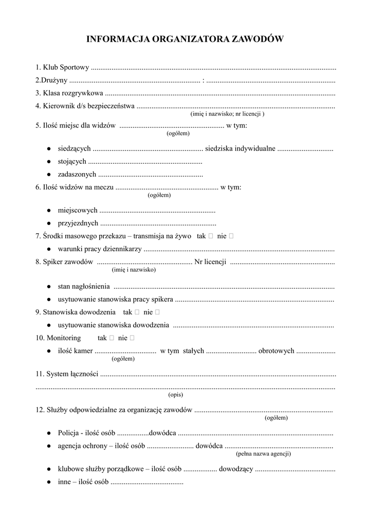 INFORMACJA ORGANIZATORA ZAWODÓW 1. Klub Sportowy ................................................................................................................................... 2.Drużyny ...................................................................... : ..................................................................... 3. Klasa rozgrywkowa ........................................................................................................................... 4. Kierownik d/s bezpieczeństwa .......................................................................................................... (imię i nazwisko; nr licencji ) 5. Ilość miejsc dla widzów ........................................................ w tym: (ogółem) siedzących ........................................................... siedziska indywidualne .............................. stojących ............................................................. zadaszonych ........................................................ 6. Ilość widzów na meczu ....................................................... w tym: (ogółem) miejscowych .............................................................. przyjezdnych .............................................................. 7. Środki masowego przekazu – transmisja na żywo tak nie warunki pracy dziennikarzy ...................................................................................................... 8. Spiker zawodów ................................................... Nr licencji ........................................................ (imię i nazwisko) stan nagłośnienia ...................................................................................................................... usytuowanie stanowiska pracy spikera ..................................................................................... 9. Stanowiska dowodzenia usytuowanie stanowiska dowodzenia ...................................................................................... 10. Monitoring tak nie tak nie ilość kamer ................................. w tym stałych ........................... obrotowych ..................... (ogółem) 11. System łączności .............................................................................................................................. ................................................................................................................................................................ (opis) 12. Służby odpowiedzialne za organizację zawodów .......................................................................... (ogółem) Policja - ilość osób .................dowódca ................................................................................... agencja ochrony – ilość osób ......................... dowódca .......................................................... (pełna nazwa agencji) klubowe służby porządkowe – ilość osób .................. dowodzący ........................................... inne – ilość osób ....................................... 13. służba medyczna ........................................................ w tym : karetki pogotowia ............................................... (ilość karetek) oznakowany punkt medyczny tak nie nosze i noszowi ........................................................................................................................ (ilość noszy, ilość noszowych, oznakowanie noszowych) .................................................................................................................................................... 14. Straż pożarna .................................................................................................................................. (ilość wozów i osób, nazwisko dowódcy) 15. Wejścia na stadion: bramy .......................................................................................... furtki ........................................................................................... wejścia na sektory .................................................. w tym sektor kibiców gości .................... ilość osób kontrolujących ...................................... w tym kobiet ............................................ 16. Ilość punktów depozytowych ......................................................................................................... Opis ........................................................................................................................................................ ................................................................................................................................................................ 17. Wydzielony i oznakowany pokój delegata tak nie 18. Wydzielony i oznakowany pokój kontroli antydopingowej tak nie wyposażenie .......................................................................................................................................... 19. Pomieszczenie lekarskie tak nie lokalizacja pokoju ...................................................................................................................... 20. Punkty gastronomiczne ilość ................................... w tym dla kibiców gości .............................. 21. Sanitariaty (wc) ilość ...................... w tym dla kobiet .................................................................. (ogółem) sanitariaty dla kibiców gości ................................................. 22. Ilość osób nie wpuszczonych na stadion ......................................................................................... ................................................................................................................................................................ (powód) 23. Ilość osób naruszających porządek ................................ w tym: ukarany