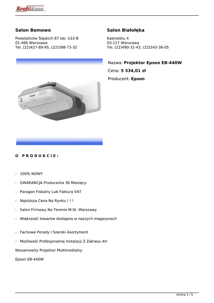 Salon Bemowo Salon Białołęka Powstańców Śląskich 87 lok. U10 B 01-466 Warszawa Tel. (22)427-89-95, (22)398-73-32 Kabrioletu 4 03-117 Warszawa Tel. (22)490-31-43, (22)243-36-05 Nazwa: Projektor Epson EB-440W Cena: 5 334,01 zł Producent: Epson O PRODUKCIE: - 100% NOWY - GWARANCJA Producenta 36 Miesięcy - Paragon Fiskalny Lub Faktura VAT - Najniższa Cena Na Rynku ! ! ! - Salon Firmowy Na Terenie M.St. Warszawy - Większość towarów dostępna w naszych magazynach - Fachowe Porady I Szeroki Asortyment - Możliwość Profesjonalnej Instalacji Z Zakresu AV Niesamowity Projektor Multimedialny Epson EB-440W strona 1 / 5 LCD / WXGA / 2200ANSI / 2000:1 / LAN / USB / Short-Throw 36 miesięczna gwarancja producenta 36 miesięczna gwarancja na lampę (door-to-door) Nowe innowacyjne projektory do zastosowa? edukacyjnych zosta?y zaprojektowane z my?l? o odtwarzaniu najwy?szej jako?ci obrazów w pomieszczeniu o dowolnej wielko?ci. Unikatowa technologia wirtualnego obrazu (mirror imaging technology) umo?liwia wy?wietlanie obrazów przy minimalnej odleg?o?ci projektora od ekranu; zapewnia ona równie? brak cieni i po?ysków. Nowe projektory Epson zosta?y wyposa?one w unikatowe funkcje zapewniaj?ce odpowiednie narz?dzia do prezentacji i nauczania w ?rodowiskach szkoleniowych. Nowa technologia obrazu lustrzanego firmy Epson (mirror imaging technology) umo?liwia wy?wietlanie niesamowitych obrazów panoramicznych w rozdzielczo?ci WXGA z bardzo ma?ej odleg?o?ci. Du?e obrazy nawet w niewielkim pomieszczeniu Nie trzeba ju? mie? du?ego pokoju do wy?wietlania du?ego obrazu. Nauczyciele i uczniowie mog? maksymalnie wykorzystywa? dost?pn? przestrze?. Projektory z obiektywami o ultrakrótkim rzucie umo?liwiaj? wy?wietlanie ostrego i jasnego obrazu panoramicznego o przek?tnej 70 cali w formacie 16:10 ju? z odleg?o?ci 16 cm. Wyeliminowany zosta? równie? efekt cienia powodowany przez osoby i przedmioty znajduj?ce si? przed ekranem. FUNKCJE ZAAWANSOWANE Przemy?lana konstrukcja naszych projektorów gwarantuje uzyskanie doskona?ych prezentacji przy u?yciu tylko jednego urz?dzenia. Prosta instalacja i konfiguracja, zaawansowane funkcje i przyst?pna cena powoduj?, ?e projektory te s? najlepszymi urz?dzeniami w swojej klasie. Prosta instalacja i ?atwa konfiguracja Dzi?ki p?ycie do monta?u na?ciennego instalacja i konserwacja s? niezwykle proste. Funkcja bezpo?redniego w??czania i wy??czania zasilania pozwala na automatyczne w??czanie projektora i natychmiastowe jego wy??czenie. Istnieje mo?liwo?? uzyskania kwadratowego obrazu przy wyj?tkowej jako?ci projekcji nawet na kraw?dzi obszaru wy?wietlania. Prezentacje typu "plug and play" Wy?wietlanie za pomoc? interfejsu USB "2 w 1" to najprostszy sposób na prezentacj? odtwarzan? z poziomu komputera, poniewa? za pomoc? jednego przewodu przesy?any jest sygna? obrazu i sygna? steruj?cy myszy. Natychmiastowe wy?wietlanie - wystarczy pod??czy? przewód USB do komputera. Nie trzeba stosowa? przewodów RGB ani wprowadza? innych ustawie?. Funkcje zabezpiecze? Bezpiecze?stwo projektora gwarantuje funkcja has?a, blokuj?cego panel sterowania i dost?p do g?ównych funkcji za pomoc? pilota zdalnego sterowania. Projektor jest równie? wyposa?ony w zabezpieczenie antykradzie?owe i naklejk? bezpiecze?stwa. Szybkie uruchomienie, natychmiastowe wy??czenie Projektory Epson o ultrakrótkim rzucie s? niezwykle szybkie, a uruchamianie trwa tylko kilka sekund. Funkcja natychmiastowego wy??czania projektora umo?liwia szybkie wy??czenie urz?dzenia po zako?czeniu prezentacji. U?ytkownik nie musi czeka?, a? urz?dzenie si? rozgrzeje lub sch?odzi. strona 2 / 5 Bezprzewodowa wygoda Jeszcze prostsz? opcj? po??czenia projektora z komputerem jest zastosowanie opcjonalnego modu?u bezprzewodowego. Modu? wystarczy po??czy? z komputerem i mo?na rozpocz?? prezentacj?. Prosta instalacja i ?atwa konfiguracja Prezentacje typu "plug and play" Funkcje zabezpiecze? Szybkie uruchomienie, natychmiastowe wy??czenie Bezprzewodowa wygoda Specyfikacja techniczna: Symbol producenta V11H318240 Nazwa produktu Projektor EPSON EB-440W Producent Epson Klasa produktu Projektor multimedialny LCD Przeznaczenie projektora biznesowy Rozdzielczość rzeczywista 1280 x 800 (WXGA) pikseli Typ matrycy LCD LCD 3 x 0,59 cali Ilość pikseli 1,024,000 pikseli Liczba wyświetlanych kolorów 16,7 mln Rzeczywisty współczynnik proporcji obrazu 16:10 Dołączony obiektyw Tak Ogniskowa obiektywu 4,68- mm Przesłona 1,8- Zoom Cyfrowy Współczynnik powiększenia (optyczny) 1,35 : 1 Automatyczne ustawianie ostrości (autofocus) Nie Korekcja zniekształceń trapezowych (Keystone) ± 5 (w pionie) stopni Cyfrowa korekcja Keystona Tak Źródło światła lampa rtęciowa (standardowa) Moc lampy 230 Wat Żywotność lampy (tryb normalny) 2500 godz. Żywotność lampy (tryb cichy) 3500 godz. Jasność (tryb normalny) 2200 ANSI Lum. Kontrast (tryb normalny) 2000:1 Poziom hałasu (tryb normalny) 35 dB Poziom hałasu (tryb cichy) 28 dB Odległość projekcji 0,46-0,76 metr Głośniki Tak Ilość wbudowanych głośników 1 szt. Moc głośnika 10 Wat Bezprzewodowa karta sieciowa Nie Zintegrowana karta sieciowa Tak Czytnik kart pamięci Nie Złącza (wejścia) • 1 x Mini DIN 4-pin (S-Video) • 1 x USB typ B • 1 x RS232 • 2 x RCA (audio LR) • 2 x stereo mini jack • 1 x RCA (wideo) • 2 x USB typ A • 2 x D-sub 15-pin • 1 x wejście na mikrofon • 1 x RJ45 Złącza (wyjścia) • 1 x D-sub 15-pin • 1 x stereo mini-jack Pobór mocy (praca/spoczynek) 338/1 Wat Pilot w zestawie Tak Wskaźnik laserowy (w pilocie) Nie Pilot z funkcją myszy (PC control) Nie Torba w zestawie Nie Zawartość opakowania • kabel zasilający • baterie do pilota • instrukcja • Płyta montażowa Szerokość 369 mm Wysokość 155 mm Głębokość 481 mm Masa netto 5,7 kg Gorąco zapraszamy po odbiór osobisty ! ! ! Wysyłamy również firmą kurierską ! ! ! UWAGA!!! strona 3 / 5 Dodatkowo RABAT na dowolny ekran 10%! > > KLIKNIJ < < i/lub RABAT na dowolny uchw