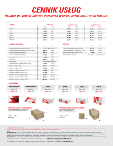 CENNIK USŁUG NADANIE W PUNKCIE OBSŁUGI PRZESYŁEK W SIECI PARTNERSKIEJ SIÓDEMKA S.A. PACZKI 7 STANDARD 7 NEXT DAY 12:00 7 NEXT DAY 10:00 NETTO BRUTTO NETTO BRUTTO NETTO BRUTTO Koperta 14,63 zł 18,00 zł 30,08 zł 37,00 zł 45,53 zł 56,00 zł Foliopak 15,45 zł 19,00 zł 30,89 zł 38,00 zł 46,34 zł 57,00 zł Do 5 kg 17,89 zł 22,00 zł 33,33 zł 41,00 zł 48,78 zł 60,00 zł Do 10 kg 20,33 zł 25,00 zł 35,77 zł 44,00 zł 51,22 zł 63,00 zł Do 20 kg 23,58 zł 29,00 zł 39,02 zł 48,00 zł 55,28 zł 68,00 zł Do 31,5 kg 27,64 zł 34,00 zł 43,09 zł 53,00 zł 58,54 zł 72,00 zł NETTO BRUTTO Paczka niestandardowa o wadze do 31,5 kg 24,39 zł 30,00 zł USŁUGI DODATKOWE DOPŁATY NETTO Ubezpieczenie przesyłki o wartości do 1000 zł BRUTTO w cenie usługi podstawowej Ubezpieczenie przesyłki o wartości od 1001 zł do 5000 zł 2,84 zł 3,50 zł Paczka niestandardowa o wadze powyżej 31,5 kg 81,30 zł 100,00 zł Pobranie standard do kwoty 5000 zł 4,07 zł 5,00 zł Waga paczki za każdy kg powyżej 31,5 kg 2,03 zł 2,50 zł Pobranie Next Day za każdy 1000 zł 23,58 zł 29,00 zł Zwrot przesyłki do Nadawcy Zwrot dokumentów 11,38 zł 14,00 zł Serwis SMS 0,49 zł 0,60 zł Serwis e-mail w cenie usługi podstawowej Skan potwierdzenia doręczenia przesyłki e-mail 10,57 zł 13,00 zł Doręczenie do godz. 9:00 138,21 zł 170,00 zł Doręczenie do godz. 11:00 48,78 zł 60,00 zł Doręczenie w godzinach 13:00 - 17:00 23,58 zł 29,00 zł Doręczenie w godzinach 18:00 - 22:00 34,15 zł 42,00 zł Doręczenie przesyłki w sobotę w strefie A 24,34 zł 30,00 zł Doręczenie przesyłki w sobotę w strefie B 122,00 zł 150,00 zł Doręczenie przesyłki w niedzielę i święta 203,25 zł 250,00 zł cena nadania w usłudze 7 Standard OPAKOWANIA Koperta ekspresowa Foliopak ekspresowy Pudło S Pudło M Pudło L Pudło XL Wymiary: 24 x 35 cm Waga do 1 kg Wymiary: 32 x 45 cm Waga do 3 kg Wymiary: 21 x 21 x 10,5 cm Waga do 5 kg Wymiary: 35 x 24,5 x 10,5 cm Waga do 10 kg Wymiary: 42,5 x 34,5 x 20 cm Waga do 20 kg Wymiary: 49,5 x 39,5 x 32 cm Waga do 30 kg 0,50 zł brutto 0,60 zł brutto 5,00 zł brutto 5,00 zł brutto 8,00 zł brutto 10,00 zł brutto PRZYKŁAD PACZKI STANDARDOWEJ PRZYKŁAD PACZKI NIESTANDARDOWEJ Wymiar najdłuższego boku nie może przekraczać 120 cm lub suma wymiarów nie może przekraczać 220 cm. c a + b + c 220 cm a 120 cm Paczka o kształcie okrągłym, cylindrycznym, owalnym, o nieregularnych kształtach lub gdzie suma wymiarów przekracza 220 cm. c a + b + c > 220 cm a > 120 cm a b a b SPOSÓB WYLICZANIA CENY PACZKI - w ustalaniu wagi obowiązuje zasada wyboru wyższej wagi paczki rzeczywistej lub gabarytowej. Paczki gabarytowe lub niestandardowe nadawane są na osobnych listach przewozowych zgodnie z zasadą: jedna paczka - jeden list przewozowy. Zasady te obowiązują we wszystkich usługach świadczonych przez Siódemka S.A. UWAGI: Paczka standardowa - paczka o kształcie prostopadłościanu lub sześcianu, z którego nie wystaje żaden ponadwymiarowy element. Wymiar najdłuższego boku nie może przekroczyć 120 cm lub suma wymiarów nie może przekraczać 220 cm. Paczka niestandardowa – paczka, której przynajmniej jeden z trzech wymiarów przekracza 120 cm lub suma wymiarów przekracza 220 cm. Paczką niestandardową są również: elementy o kształcie okrągłym, cylindrycznym lub owalnym; o nieregularnych kształtach lub/oraz z wystającymi elementami; zawierające luźne, ciężkie elementy lub takie, których rozkład ciężaru jest nierównomierny; umieszczone w luźnym opakowaniu. Zasada ta nie dotyczy paczek dłużycowych. Paczka gabarytowa – zazwyczaj jest to paczka lekka, ale objętościowo duża. Wagę gabarytową stosujemy zawsze do wyceny paczki w przypadku, gdy waga gabarytowa jest większa niż waga rzeczywista paczki. Do wyceny przyjmowana jest wyższa waga gabarytowa lub rzeczywista. Waga gabarytowa obliczana jest według poniższego wzoru: długość cm (a) x szerokość cm (b) x wysokość cm (c) 6000 Cennik obowiązuje od dnia 01.06.2014 roku. Wartość brutto zawierają podatek VAT w wysokości 23. Szczegółowe opisy usług dostępne są na www.siodemka.com CENNIK USŁUG NADANIE W PUNKCIE OBSŁUGI PRZESYŁEK W ODDZIAŁACH SIÓDEMKA S.A. PACZKI 7 STANDARD 7 NEXT DAY 12:00 7 NEXT DAY 10:00 NETTO BRUTTO NETTO BRUTTO NETTO BRUTTO Koperta 14,63 zł 18,00 zł 30,08 zł 37,00 zł 45,53 zł 56,00 zł Foliopak 15,45 zł 19,00 zł 30,89 zł 38,00 zł 46,34 zł 57,00 zł Do 5 kg 17,89 zł 22,00 zł 33,33 zł 41,00 zł 48,78 zł 60,00 zł Do 10 kg 20,33 zł 25,00 zł 35,77 zł 44,00 zł 51,22 zł 63,00 zł Do 20 kg 23,58 zł 29,00 zł 39,02 zł 48,00 zł 55,28 zł 68,00 zł Do 31,5 kg 27,64 zł 34,00 zł 43,09 zł 53,00 zł 58,54 zł 72,00 zł NETTO BRUTTO Paczka niestandardowa o wadze do 31,5 kg 24,39 zł 30,00 zł PALETY 7 EURO PALETA 7 EURO PALETA NEXT DAY NETTO BRUTTO NETTO BRUTTO Do 100 kg 162,60 zł 200,00 zł 243,90 zł 300,00 zł Do 200 kg 211,38 zł 260,00 zł 290,24 zł 357,00 zł Do 300 kg 256,10 zł 315,00 zł 337,40 zł 415,00 zł Do 400 kg 325,20 zł 400,00 zł 406,50 zł 500,00 zł Do 500 kg 394,31 zł 485,00 zł 476,42 zł 586,00 zł Do 600 kg 465,04 zł 572,00 zł 545,53 zł 671,00 zł Do 700 kg 534,15 zł 657,00 zł 615,45 zł 757,00 zł Do 800 kg 581,30 zł 715,00 zł 661,79 zł 814,00 zł NETTO BRUTTO USŁUGI DODATKOWE w cenie usługi podstawowej Ubezpieczenie przesyłki o wartości do 1000 zł DOPŁATY Ubezpieczenie przesyłki o wartości od 1001 zł do 5000 zł 2,84 zł 3,50 zł Paczka niestandardowa o wadze powyżej 31,5 kg 81,30 zł 100,00 zł Pobranie standard do kwoty 5000 zł 4,07 zł 5,00 zł Waga paczki za każdy kg powyżej 31,5 kg 2,03 zł 2,50 zł Pobranie Next Day za każdy 1000 zł 23,58 zł 29,00 zł Waga palety za każdy kg powyżej 800 kg 2,44 zł 3,00 zł Zwrot dokumentów 11,38 zł 14,00 zł Zwrot przesyłki do Nadawcy Serwis SMS 0,49 zł 0,60 zł cena nadania w usłudze 7 Standard w cenie usługi podstawowej Serwis e-m