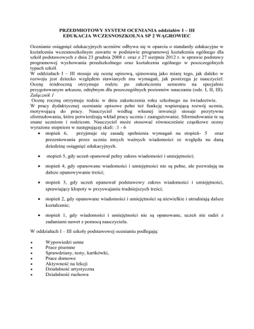 PRZEDMIOTOWY SYSTEM OCENIANIA oddziałów I – III EDUKACJA WCZESNOSZKOLNA SP 2 WĄGROWIEC Ocenianie osiągnięć edukacyjnych uczniów odbywa się w oparciu o standardy edukacyjne w kształceniu wczesnoszkolnym zawarte w podstawie programowej kształcenia ogólnego dla szkół podstawowych z dnia 23 grudnia 2008 r. oraz z 27 sierpnia 2012 r. w sprawie podstawy programowej wychowania przedszkolnego oraz kształcenia ogólnego w poszczególnych typach szkół. W oddziałach I – III stosuje się ocenę opisową, ujmowaną jako miarę tego, jak daleko w rozwoju jest dziecko względem stawianych mu wymagań, jak postrzega je nauczyciel. Ocenę śródroczną otrzymuje rodzic po zakończeniu semestru na specjalnie przygotowanym arkuszu, odrębnym dla poszczególnych poziomów nauczania (odz. I, II, III). Załącznik 1 Ocenę roczną otrzymuje rodzic w dniu zakończenia roku szkolnego na świadectwie. W pracy dydaktycznej ocenianie opisowe pełni też funkcję wspierającą rozwój ucznia, motywującą do pracy. Nauczyciel według własnej inwencji stosuje pozytywne sformułowania, które potwierdzają wkład pracy ucznia i zaangażowanie. Sformułowania te są znane uczniom i rodzicom. Nauczyciel może stosować równocześnie cząstkowe oceny wyrażone stopniem w następującej skali: :1 - 6 stopień 6, przyjmuje się zasadę spełnienia wymagań na stopień- 5 oraz prezentowania przez ucznia innych ważnych wiadomości ze względu na daną dziedzinę osiągnięć edukacyjnych. stopień 5, gdy uczeń opanował pełny zakres wiadomości i umiejętności; stopień 4, gdy opanowane wiadomości i umiejętności nie są pełne, ale pozwalają na dalsze opanowywanie treści; stopień 3, gdy uczeń opanował podstawowy zakres wiadomości i umiejętności, sprawiający kłopoty w przyswajaniu trudniejszych treści; stopień 2, gdy opanowane wiadomości i umiejętności są niewielkie i utrudniają dalsze kształcenie; stopień 1, gdy wiadomości i umiejętności nie są opanowane, uczeń nie radzi z zadaniami nawet z pomocą nauczyciela. W oddziałach I – III szkoły podstawowej ocenianiu podlegają: Wypowiedzi ustne Prace pisemne Sprawdziany, testy, kartkówki, Prace domowe Aktywność na lekcji Działalność artystyczna Działalność ruchowa SZCZEGÓŁOWE WYMAGANIA EDUKACYJNE ODDZIAŁ I EDUKACJA POLONISTYCZNA – UMIEJĘTNOŚĆ CZYTANIA 6 Czyta biegle płynnie i wyraziście nowy tekst, zawsze ze zrozumieniem. Czyta z podziałem na role, bierze udział w konkursach czytelniczych. 5 Bezbłędnie dokonuje analizy i syntezy słuchowo-wzrokowej znanych wyrazów. Czyta poprawnie, płynnie i wyraziście wyuczony tekst 4 Dokonuje analizy i syntezy słuchowo – wzrokowej znanych wyrazów. Czyta wolno, czasami popełnia błędy (potrafi poprawić błędnie przeczytany wyraz). 3 Z pomocą nauczyciela wyróżnia w wyrazie głoski, litery i sylaby. Czyta bardzo wolno, nie stosuje się do znaków przestankowych, zmienia wyrazy. 2 Ma trudności z analizą i syntezą wyrazu, czyta bardzo wolno, literuje, sylabizuje, ma trudności z całościowym czytaniem wyrazu. 1 Niechętnie podejmuje próby czytania, ponieważ nie potrafi przegłoskować wyrazu, nie składa go w całość. EDUKACJA POLONISTYCZNA – UMIEJĘTNOŚĆ MÓWIENIA I SŁUCHANIA 6 Wypowiada się pełnymi zdaniami, posiada bardzo bogaty zasób słownictwa. Umiejętnie bierze udział w dyskusji, dobiera właściwe argumenty 5 Formułuje wielozdaniowe i logiczne wypowiedzi na dowolny temat. Posiada bogaty zasób słów, który poprawnie wykorzystuje w wypowiedziach ustnych. 4 Formułuje wypowiedzi na podane tematy budując poprawne, proste zdania. W wypowiedziach ustnych wykorzystuje poznane słownictwo. 3 Wypowiada się krótkimi, prostymi zdaniami na określony temat, stara się poprawnie posługiwać poznanym słownictwem. Zasób słownictwa ucznia jest ubogi. Słucha czytanych utworów. 2 Formułuje krótkie wypowiedzi na określone tematy. Odpowiada pojedynczymi wyrazami na pytania nauczyciela, nie zawsze na temat. Posiada bardzo ubogi zasób słownictwa 1 Nie wypowiada się. Zapytany odpowiada jednym słowem lub wcale. Nie słucha wypowiedzi kolegów. EDUKACJA POLONISTYCZNA – UMIEJĘTNOŚĆ PISANIA 6 Pisze starannie zachowując prawidłowy kształt liter, ich łączenie, prawidłowo rozmieszcza tekst na stronie, bardzo starannie prowadzi zeszyty. Bezbłędnie przepisuje teksty oraz pisze ze słuchu i pamięci, stosując poznane zasady ortograficzne. 5 Poprawnie łączy litery w wyrazach, zachowuje odpowiednie proporcje. Pisze starannie. Prawidłowo przepisuje tekst drukowany i pisany. Poprawnie pisze z pamięci i ze słuchu w zakresie opracowanego słownictwa. 4 Stosuje prawidłowy kształt liter i mieści się w liniaturze. Przepisuje krótkie teksty pisane i drukowane. Zna, lecz nie zawsze stosuje poznane zasady ortograficzne. 3 Myli linijki, ma trudności z mieszczeniem się w liniaturze, nie zachowuje kształtu i prawidłowego łączenia liter. Z pomocą nauczyciela przepisuje łatwe teksty pisane i drukowane. Pisząc ze słuchu i pamięci popełnia błędy ortograficzne i gramatyczne. 2 Ma duże trudności z pisaniem, nie trzyma się liniatury, źle łączy litery i myli je. Przepisując krótki tekst w zakresie opracowywanego słownictwa popełnia liczne błędy. Wymaga stałej pomocy nauczyciela 1 Nie odwzorowuje liter i cyfr. Popełnia wiele błędów, prace niestaranne, nieczytelne, pisze byle gdzie. EDUKACJA MATEMATYCZNA 6 Biegle dodaje i odejmuje, samodzielnie i bezbłędnie rozwiązuje zadania tekstowe. Układa zadania do podanej sytuacji, rysunku lub formuły matematycznej. Doskonale posługuje się jednostkami miary, wagi i czasu. Wyróżnia się w klasie wiadomościami wykraczającymi ponad program. 5 Samodzielnie i sprawnie oblicza sumy i różnice. Bezbłędnie rozwiązuje zadania tekstowe i poprawnie zapisuje jego pełne rozwiązanie. Sprawnie stosuje wiadomości praktyczne dotyczące wagi, czasu i długości. 4 Sprawnie i