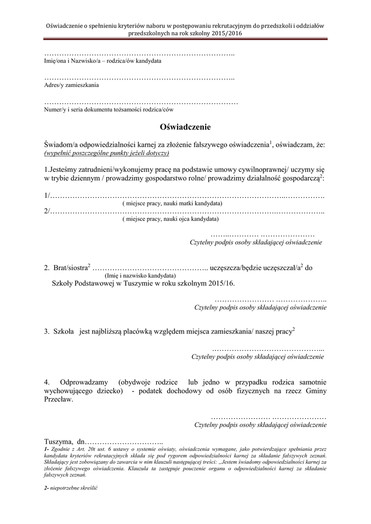 Oświadczenie o spełnieniu kryteriów naboru w postępowaniu rekrutacyjnym do przedszkoli i oddziałów przedszkolnych na rok szkolny 2015/2016 ………………………………………………………………….. Imię/ona i Nazwisko/a – rodzica/ów kandydata ………………………………………………………………….. Adres/y zamieszkania …………………………………………………………………… Numer/y i seria dokumentu tożsamości rodzica/ców Oświadczenie Świadom/a odpowiedzialności karnej za złożenie fałszywego oświadczenia1, oświadczam, że: (wypełnić poszczególne punkty jeżeli dotyczy) 1.Jesteśmy zatrudnieni/wykonujemy pracę na podstawie umowy cywilnoprawnej/ uczymy się w trybie dziennym / prowadzimy gospodarstwo rolne/ prowadzimy działalność gospodarczą2: 1/…………………………………………………………………………………..……………. ( miejsce pracy, nauki matki kandydata) 2/……………………………………………………………………………….……………….. ( miejsce pracy, nauki ojca kandydata) ……..………… .………………… Czytelny podpis osoby składającej oświadczenie 2. Brat/siostra2 ……………………………………….. uczęszcza/będzie uczęszczał/a2 do (Imię i nazwisko kandydata) Szkoły Podstawowej w Tuszymie w roku szkolnym 2015/16. …………………… .……………….. Czytelny podpis osoby składającej oświadczenie 3. Szkoła jest najbliższą placówką względem miejsca zamieszkania/ naszej pracy2 .……………………………………... Czytelny podpis osoby składającej oświadczenie 4. Odprowadzamy (obydwoje rodzice lub jedno w przypadku rodzica samotnie wychowującego dziecko) - podatek dochodowy od osób fizycznych na rzecz Gminy Przecław. …………………… .………………… Czytelny podpis osoby składającej oświadczenie Tuszyma, dn………………………….. 1- Zgodnie z Art. 20t ust. 6 ustawy o systemie oświaty, oświadczenia wymagane, jako potwierdzające spełniania przez kandydata kryteriów rekrutacyjnych składa się pod rygorem odpowiedzialności karnej za składanie fałszywych zeznań. Składający jest zobowiązany do zawarcia w nim klauzuli następującej treści: „Jestem świadomy odpowiedzialności karnej za złożenie fałszywego oświadczenia. Klauzula ta zastępuje pouczenie organu o odpowiedzialności karnej za składanie fałszywych zeznań. 2- niepotrzebne skreślić