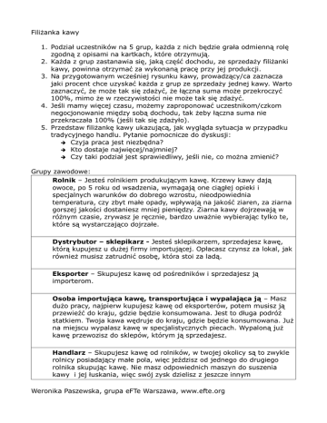 Filiżanka kawy 1. Podział uczestników na 5 grup, każda z nich będzie grała odmienną rolę zgodną z opisami na kartkach, które otrzymują. 2. Każda z grup zastanawia się, jaką część dochodu, ze sprzedaży filiżanki kawy, powinna otrzymać za wykonaną pracę przy jej produkcji. 3. Na przygotowanym wcześniej rysunku kawy, prowadzący/ca zaznacza jaki procent chce uzyskać każda z grup ze sprzedaży jednej kawy. Warto zaznaczyć, że może tak się zdażyć, że łączna suma może przekroczyć 100%, mimo że w rzeczywistości nie może tak się zdażyć. 4. Jeśli mamy więcej czasu, możemy zaproponować uczestnikom/czkom negocjonowanie między sobą dochodu, tak żeby łączna suma nie przekraczała 100% (jeśli tak się zdażyło). 5. Przedstaw filiżankę kawy ukazującą, jak wygląda sytuacja w przypadku tradycyjnego handlu. Pytanie pomocnicze do dyskusji: Czyja praca jest niezbędna? Kto dostaje najwięcej/najmniej? Czy taki podział jest sprawiedliwy, jeśli nie, co można zmienić? Grupy zawodowe: Rolnik – Jesteś rolnikiem produkującym kawę. Krzewy kawy dają owoce, po 5 roku od wsadzenia, wymagają one ciągłej opieki i specjalnych warunków do dobrego wzrostu, nieodpowiednia temperatura, czy zbyt małe opady, wpływają na jakość ziaren, za ziarna gorszej jakości dostaniesz mniej pieniędzy. Ziarna kawy dojrzewają w różnym czasie, zrywasz je ręcznie, bardzo uważnie wybierając tylko te, które są wystarczająco dojrzałe. Dystrybutor – sklepikarz - Jesteś sklepikarzem, sprzedajesz kawę, którą kupujesz u dużej firmy importującej. Opłacasz czynsz za lokal, jak również musisz zatrudnić osobę, która stoi za ladą. Eksporter – Skupujesz kawę od pośredników i sprzedajesz ją importerom. Osoba importująca kawę, transportująca i wypalająca ją – Masz dużo pracy, najpierw kupujesz kawę od eksporterów, potem musisz ją przewieźć do kraju, gdzie będzie konsumowana. Jest to długa podróż statkiem. Twoja kawa wędruje do kraju, gdzie będzie konsumowana. Już na miejscu wypalasz kawę w specjalistycznych piecach. Wypaloną już kawę przewozisz do sklepów, którym ją sprzedajesz. Handlarz – Skupujesz kawę od rolników, w twojej okolicy są to zwykle rolnicy posiadający małe pola, więc jeździsz od jednego do drugiego rolnika skupując kawę. Nie masz odpowiednich maszyn do suszenia kawy i jej łuskania, więc swój zysk dzielisz z jeszcze innym Weronika Paszewska, grupa eFTe Warszawa, www.efte.org pośrednikiem, który ma odpowiednie techniczne zaplecze. Pomocne wiadomości: 10 największych producentów kawy: Brazylia Etiopia Kolumbia Wybrzeże Kości Słoniowej Gwatemala Uganda Meksyk Indonezja Indie Wietnam Produkcja kawy: Kawa rośnie na wiecznie zielonych krzaczkach, wymagajacych ciąglej opieki. Większość z roślin odchodowywana jest w specjalnych szkółkach od 9 do 18 miesięcy. Potem przesadzane są na specjalnie przygotowane pola. Zwykle krzew kawy zaczyna rodzić owoce, kiedy osiąga wiek 5 lat. Dobrej jakości plony osiąga w wieku 8 lat. Średniej wielkości roślina rocznie rodzi owoce, odpowiadające 0.7 kg palonej kawy. Roślina daje zadawalający plon przez 15-20 lat, przy dobrych warunkach nawet dłużej. Ziarna kawy zbierane są ręcznie. Ponieważ nie dojrzewają one w tym samym czasie, zbieracz/ka musi wybierać z krzewu, tylko te dojrzałe. Zerwane owoce są myte, suszone, łuskane i sortowane. Do suszenia potrzebne są ogromne cementowe bloki, a do łuskania ręczne albo mechaniczne młyny usuwające zewnętrzną część ziarna. Niektórzy farmerzy nie mają takich urządzeń i przez to uzależnieni są od zewnętrznej pomocy. Worki pełne zielonych, niepalonych ziaren kawy odbierane są przez pośrednika. Wielu drobnych farmerów nie posiada ciężarówki, którą poglibi przetransportować plony. Pośrednik ocenia ziarna pod względem smaku, klasyfikuję ze względu na jakość ziaren i transportuje do portu. Większość kawy palona jest już w krajach, z których będzie konsumowana. Pośrednicy generalnie płacą za kawę farmerom przy odbiorze, jest to niska cena, bo farmerzy dostają od razu pieniądze. To, co farmerzy dostają jest zwykle poniżej ceny rynkowej. Często ich pośrednik jest jedynym w okolicy, więc nie mogą wybierać między lepszymi cenami za ich kawę. Farmerzy uzależnieni są od swojego pośrednika także dlatego, że dostarcza on im, to czego potrzebują: natychmiastową gotówkę, transport i kredyty (wielu farmerów uprawia pola, których nie są właścicielami, więc banki odmawiają im pożyczek). Pośrednicy więc, często trudnią się podwójnym zajęciem: skupując kawę i pożyczając pieniądze na procent (nawet do 200%). Farmerzy często nie mając dostępu do bieżących informacji o cenach, muszą godzić się na to, co proponują im pośrednicy. Weronika Paszewska, grupa eFTe Warszawa, www.efte.org