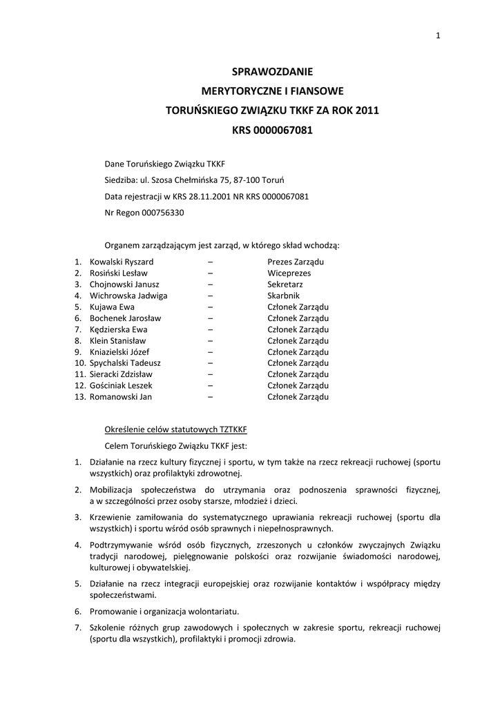 1 SPRAWOZDANIE MERYTORYCZNE I FIANSOWE TORUŃSKIEGO ZWIĄZKU TKKF ZA ROK 2011 KRS 0000067081 Dane Toruńskiego Związku TKKF Siedziba: ul. Szosa Chełmińska 75, 87-100 Toruń Data rejestracji w KRS 28.11.2001 NR KRS 0000067081 Nr Regon 000756330 Organem zarządzającym jest zarząd, w którego skład wchodzą: 1. 2. 3. 4. 5. 6. 7. 8. 9. 10. 11. 12. 13. Kowalski Ryszard Rosiński Lesław Chojnowski Janusz Wichrowska Jadwiga Kujawa Ewa Bochenek Jarosław Kędzierska Ewa Klein Stanisław Kniazielski Józef Spychalski Tadeusz Sieracki Zdzisław Gościniak Leszek Romanowski Jan – – – – – – – – – – – – – Prezes Zarządu Wiceprezes Sekretarz Skarbnik Członek Zarządu Członek Zarządu Członek Zarządu Członek Zarządu Członek Zarządu Członek Zarządu Członek Zarządu Członek Zarządu Członek Zarządu Określenie celów statutowych TZTKKF Celem Toruńskiego Związku TKKF jest: 1. Działanie na rzecz kultury fizycznej i sportu, w tym także na rzecz rekreacji ruchowej (sportu wszystkich) oraz profilaktyki zdrowotnej. 2. Mobilizacja społeczeństwa do utrzymania oraz podnoszenia sprawności fizycznej, a w szczególności przez osoby starsze, młodzież i dzieci. 3. Krzewienie zamiłowania do systematycznego uprawiania rekreacji ruchowej (sportu dla wszystkich) i sportu wśród osób sprawnych i niepełnosprawnych. 4. Podtrzymywanie wśród osób fizycznych, zrzeszonych u członków zwyczajnych Związku tradycji narodowej, pielęgnowanie polskości oraz rozwijanie świadomości narodowej, kulturowej i obywatelskiej. 5. Działanie na rzecz integracji europejskiej oraz rozwijanie kontaktów i współpracy między społeczeństwami. 6. Promowanie i organizacja wolontariatu. 7. Szkolenie różnych grup zawodowych i społecznych w zakresie sportu, rekreacji ruchowej (sportu dla wszystkich), profilaktyki i promocji zdrowia. 2 8. Wspomaganie procesu poprawnej socjalizacji i wychowania poprzez wykorzystywanie walorów kultury fizycznej w profilaktyce oraz readaptacji społecznej. Zasady, formy i zakres działalności statutowej z podaniem realizacji celów statutowych Toruński Związek TKKF stosuje następujące środki działania: 1. Współdziała w realizacji państwowego programu upowszechniania kultury fizycznej i profilaktyki zdrowotnej, wspomaga działania mające na celu tworzenie dogodnych warunków do uprawiania aktywnego wypoczynku, inicjuje nowe formy działalności programowej i organizacji Towarzystwa Krzewienia Kultury Fizycznej. 2. Organizuje zloty, festyny, konkursy oraz inne masowe imprezy sportowo-rekreacyjne. 3. Organizuje różnego rodzaju zespoły o charakterze sportowo-rekreacyjnym, specjalistycznym i kulturalno-rozrywkowym, w zależności od zainteresowań członków. 4. Propaguje uprawianie kultury fizycznej w formach zespołowych i indywidualnych, a także innych form aktywnego wypoczynku. 5. Udziela informacji o swojej działalności i działalności zrzeszonych ogniw organizacyjnych, współpracując w tym zakresie z prasą, radiem i telewizją. 6. Prowadzi działalność wydawniczą własną, współpracuje ze szkołami wyższymi i placówkami naukowo-badawczymi oraz popiera prace naukowo-badawcze w zakresie edukacji, sportu, sportu osób niepełnosprawnych, sportu dla wszystkich, zdrowia i ekologii. 7. Organizuje poradnictwo z zakresu kultury fizycznej dla osób indywidualnych, organizacji i instytucji. 8. Prowadzi doradztwo personalne w zakresie kultury fizycznej i sportu. 9. Organizuje konferencje i seminaria odnoszące się do spraw stanowiących domenę działań Związku. 10. Organizuje i prowadzi kursy w celu szkolenia i dokształcania instruktorów, trenerów, organizatorów, wykładowców oraz sędziów dla potrzeb sportu, sportu osób niepełnosprawnych, rekreacji ruchowej (sportu dla wszystkich) w różnych środowiskach. 11. Organizuje i prowadzi ośrodki rekreacji fizycznej, szkoleniowo-rekreacyjne, metodycznoszkoleniowe, wypoczynkowe oraz różnorodne formy obozownictwa, w tym obozy: sportoworekreacyjne, profilaktyczno-usprawniające, sportowe – dla dorosłych, dzieci, młodzieży i rodzin. 12. Zarządza posiadanymi obiektami i urządzeniami sportowo-rekreacyjnymi, rozwija działalność w zakresie ich budownictwa, modernizacji, remontów i konserwacji. 13. Współpracuje z zagranicznymi, specjalistycznymi organizacjami kultury fizycznej. 14. Koordynuje działalność zrzeszonych członków kształtując wspólne kierunki działania. 15. Realizuje zlecone zadania publiczne w zakresie kultury fizycznej i sportu, promocji i organizacji wolontariatu oraz działań na rzecz osób niepełnosprawnych, a także innej sfery zadań publicznych, związanych z realizacją celów statutowych. 16. Prowadzi działalność statutową we własnym zakresie i poprzez udział w innych przedsięwzięciach mających na celu uzyskanie środków na realizację zadań statutowych. 3 17. Współdziała z organami administracji rządowej i samorządu terytorialnego, związkami zawodowymi oraz innymi organizacjami pozarządowymi i instytucjami w zakresie kultury fizycznej, ochrony i promocji zdrowia, wypoczynku dzieci i młodzieży, rozwoju fizycznego osób niepełnosprawnych, promocji i organizacji wolontariatu, przeciwdziałania patologiom. Toruński Związek TKKF realizuje cele statutowe oraz prowadzi działalność pożytku publicznego na rzecz ogółu społeczności z uwzględnieniem podejmowania także szczególnych działań na rzecz osób niepełnosprawnych. Opis głównych działań strategicznych TZTKKF 1) DZIAŁALNOŚĆ ORGANIZACYJNA Toruński Związek TKKF zrzesza 8 ognisk, które łącznie zrzeszają 299 członków. Poza imprezami, które TZTKKF organizuje, sprawuje również nadzór i współpracuje w zakresie organizacji imprez na terenie miasta i województwa Kujawsko-pomorskiego. Zorganizowano 91 imprez, w których uczestniczyło 236.077 osób. Na mocy porozumienia z Kujawsko-Pomorskim Związkiem TKKF Toruński Związek TKKF współpra
