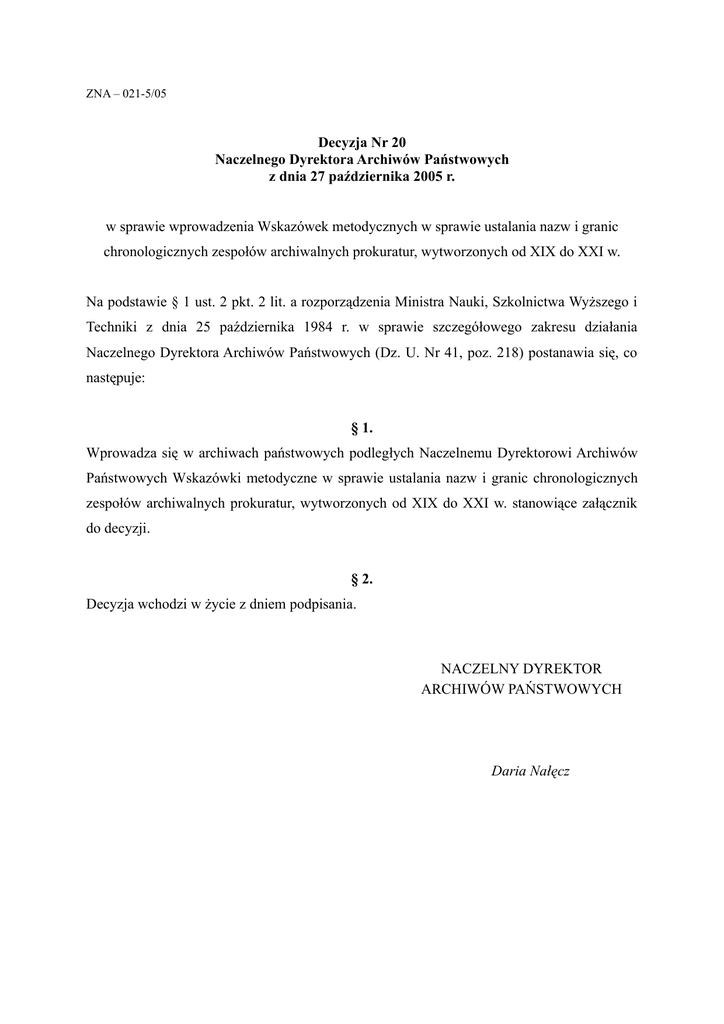 ZNA – 021-5/05 Decyzja Nr 20 Naczelnego Dyrektora Archiwów Państwowych z dnia 27 października 2005 r. w sprawie wprowadzenia Wskazówek metodycznych w sprawie ustalania nazw i granic chronologicznych zespołów archiwalnych prokuratur, wytworzonych od XIX do XXI w. Na podstawie § 1 ust. 2 pkt. 2 lit. a rozporządzenia Ministra Nauki, Szkolnictwa Wyższego i Techniki z dnia 25 października 1984 r. w sprawie szczegółowego zakresu działania Naczelnego Dyrektora Archiwów Państwowych (Dz. U. Nr 41, poz. 218) postanawia się, co następuje: § 1. Wprowadza się w archiwach państwowych podległych Naczelnemu Dyrektorowi Archiwów Państwowych Wskazówki metodyczne w sprawie ustalania nazw i granic chronologicznych zespołów archiwalnych prokuratur, wytworzonych od XIX do XXI w. stanowiące załącznik do decyzji. § 2. Decyzja wchodzi w życie z dniem podpisania. NACZELNY DYREKTOR ARCHIWÓW PAŃSTWOWYCH Daria Nałęcz Załącznik do Decyzji Nr 20 Naczelnego Dyrektora Archiwów Państwowych z dnia 27 października 2005 r. Wskazówki metodyczne w sprawie ustalania nazw i granic chronologicznych zespołów archiwalnych prokuratur, wytworzonych od XIX do XXI w. 1. Wskazówki dotyczą: a) nazw i granic chronologicznych zespołów archiwalnych prokuratur przechowywanych w archiwach państwowych, wytworzonych od XIX do XXI w.; b) nieopracowanych zespołów archiwalnych prokuratur przechowywanych w archiwach państwowych. 2. Wskazówki nie dotyczą prokuratur wojskowych. 3. Wyjątek stanowią nazwy i granice chronologiczne zespołów archiwalnych prokuratur działających od 1944 r. obejmujących zespoły wojskowych prokuratur rejonowych oraz wojskowych prokuratur dyrekcji okręgowych Polskich Kolei Państwowych (zał. nr 7). 4. Akta prokuratur w rozumieniu niniejszych wskazówek obejmują całokształt dokumentacji stanowiącej materiały archiwalne, wytworzonej przez prokuratury. 5. Przy przeprowadzaniu segregacji akt prokuratur, ustalaniu przynależności zespołowej oraz nazw zespołów i granic chronologicznych zaleca się posługiwanie następującymi załącznikami (nr 1-7): a) w sprawie nazw i granic chronologicznych zespołów archiwalnych prokuratur z terenów, które do 1918 r. wchodziły w skład monarchii Habsburgów (1850-1918) (zał. nr 1); b) w sprawie nazw i granic chronologicznych zespołu archiwalnego prokuratora Wolnego Miasta Krakowa (1816-1846) (zał. nr 2); c) w sprawie nazw i granic chronologicznych zespołów archiwalnych prokuratorów działających na terenie Księstwa Warszawskiego i Królestwa Polskiego (1808-1915) (zał. nr 3); d) w sprawie nazw i granic chronologicznych zespołów archiwalnych prokuratur z okresu I wojny światowej oraz II Rzeczypospolitej (zał. nr 4); e) w sprawie nazw i granic chronologicznych zespołów archiwalnych pruskich i niemieckich prokuratur działających na terenie Śląska, Wielkopolski, Pomorza i Prus Wschodnich w latach 1849-1945 oraz na ziemiach włączonych do III Rzeszy w latach 1939-1945 (zał. nr 5); f) w sprawie nazw i granic chronologicznych zespołów archiwalnych prokuratur działających na terenie Generalnego Gubernatorstwa w latach 1939-1944/1945 oraz na terenach II Rzeczypospolitej włączonych do ZSRR w latach 1939-1941 (zał. nr 6); 2 g) w sprawie nazw i granic chronologicznych zespołów archiwalnych prokuratur działających od 1944 r. (zał. nr 7). 6. a) przy formułowaniu nazw zespołów (prokuratur), których twórcy nosili nazwy obcojęzyczne, obowiązują przepisy wprowadzone zarządzeniem nr 9 Naczelnego Dyrektora Archiwów Państwowych z dnia 16 marca 1968 r. w sprawie zasad formułowania tytułów zespołów (zbiorów itp.) archiwalnych, których twórcy nosili nazwy obcojęzyczne oraz Decyzja nr 3 Naczelnego Dyrektora Archiwów Państwowych z dnia 30 stycznia 2004 r. w sprawie ewidencji zasobu archiwalnego w archiwach państwowych. b) transliteracji nazw oryginalnych ze słowiańskich alfabetów cyrylickich należy dokonać przy zastosowaniu normy PN-ISO 9: 2000. 3 Załącznik nr 1 do Wskazówek metodycznych w sprawie ustalania nazw i granic chronologicznych zespołów archiwalnych prokuratur, wytworzonych od XIX do XXI w., wprowadzonych decyzją Nr 20 Naczelnego Dyrektora Archiwów Państwowych z dnia 27 października 2005 r. Nazwy i granice chronologiczne zespołów archiwalnych prokuratur z terenów, które do 1918 r. wchodziły w skład monarchii Habsburgów (1850-1918)1 A. Obszar zaboru austriackiego. Rozpoczęcie działalności organów nadprokuratorii państwa i prokuratorii państwa wyznacza data 29 września 1855 r.2 Nazwy i cezury chronologiczne poszczególnych zespołów archiwalnych organów prokuratorii państwa są następujące: Polska nazwa zespołu C.K. Nadprokuratoria Niemiecka nazwa zespołu K.K. Oberstaatsanwaltschaft Państwa w ... C.K. Prokuratoria Państwa w ... K.K. Staatsanwaltschaft Granice chronologiczne 1855-1918 1855-1918 B. Śląsk Cieszyński: Polska nazwa zespołu 3 C.K. Prokuratura w ... Niemiecka nazwa zespołu K.K. Staatsanwaltschaft Literatura Granice chronologiczne 1850-1918 1 Opracowali: R. Bogusz (AP Kraków), M. Dalecki (AP Przemyśl), S. Krupa (AP Katowice), 2004. 2 Datę rozpoczęcia działalności przez organy prokuratorii państwa w Galicji określało rozporządzenie Ministerstwa Sprawiedliwości z dnia 29 czerwca 1855 r. Verordnung des Justizministeriums vom 29 Juni 1855 womit der Zeitpunct des Beginnes der Wirksamkeit der neu organisirten Oberlandesgerichte in Lemberg und Krakau, sammt den, bei denselben bestellten Ober-Staatsanwaltschaften, dann der, in dem Sprengel dieser Oberlandesgerichte einzuführenden Gerichtshöfe erster Instanz des Bezirksgerichtes in Brody und der betreffenden Staatsanwaltschaftsbehörden, sowie der, mit der neuen Gerichtsorganisirung in Verbindung stehenden Gesetze bestimmt wird (Reichsgesetzblatt [dalej: RGB], poz. 117). 3 Rozporządzenia: Cesarski patent z dnia 10 października 1850 r. – Zarysy ustawy organicznej dla prok