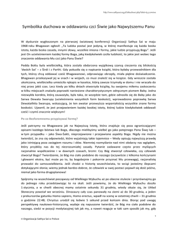 http://www.sathyasai.org.pl/aktualnosci.php?tekst=t5.5.20#siwa Symbolika duchowa w oddawaniu czci Śiwie jako Najwyższemu Panu W dyskursie wygłoszonym na pierwszej światowej konferencji Organizacji Sathya Sai w maju 1968 roku Bhagawan ogłosił: „Ta ludzka postać jest jedyną, w której manifestuje się każda boska istota, każda boska zasada, innymi słowy, wszelkie imiona i formy, jakie ludzie przypisują Bogu”. Jeśli jest On ucieleśnieniem każdej formy Boga, jaką kiedykolwiek czciła ludzkość, to jakie jest wobec tego znaczenie oddawania Mu czci jako Panu Śiwie? Pedda Bottu była wielbicielką, która została obdarzona wyjątkową szansą cieszenia się bliskością ‘dwóch Sai’ – z Śirdi i z Parthi. Gdy pokusiła się o napisanie książki, która byłaby przewodnikiem dla tych, którzy chcą oddawać cześć Bhagawanowi, odprawiając obrzędy, miała piękne doświadczenie. Bhagawan przekazywał jej w snach i w wizjach, co musi znaleźć się w książce. Gdy wreszcie została ukończona, wielbicielka umieściła rękopis w kasetce, którą zawsze trzymałą w domu i nie wracała do niej przez jakiś czas. Lecz kiedy po kilku dniach otworzyła książkę, ku swojemu miłemu zaskoczeniu w kilku miejscach znalazła poprawki naniesione charakterystycznym odręcznym pismem Baby. Jedna niezwykła korekta, którą zauważyła, była taka, że wszędzie tam, gdzie odnosiła się do Baby jako do Sarwa Dewata Swarupy (ucieleśnienia wszystkich form boskości), wprowadzono poprawkę Sarwa Dewatathita Swarupa, wskazującą, że ten awatar przewyższa wspaniałością wszystkie znane formy boskości. Ujawnił, że jest przejawieniem każdej boskiej istoty, której ludzie kiedykolwiek oddawali cześć i czymś znacznie większym! Po co Bezforemnemu przypisywać formę? Jeśli patrzymy na Bhagawana jak na Najwyższą Istotę, która znajduje się poza ograniczającymi opisami każdego bóstwa lub Boga, dlaczego mielibyśmy wielbić go jako potężnego Pana Śiwę lub – w tym przypadku – jako Śiwa-Śakti, nieprzejawione i przejawione aspekty Boga. Nigdy nie można twierdzić, że zna się odpowiedzi, które wyjaśniają takie tajemnice – Wedy opisują najwyższą prawdę jako istniejącą poza zasięgiem rozumu i słów. Niemniej rozmyślanie nad nimi obdarzy nas wglądem, który przybliży nas do tej niezrozumiałej zasady. Pytanie zadawane często przez myślących racjonalnie współcześnie i w dawnych czasach, brzmi: Czy Bóg stworzył człowieka, czy człowiek stworzył Boga? Twierdzenie, że Bóg ma ciało podobne do naszego (oczywiście z kilkoma kończynami i głowami ekstra, być może po to, by bogobojnie i pokornie przyznać Mu przewagę), racjonalistę prowadzi do samouwielbienia. Jeśli chodzi o historię wszechświata, to wciąż jesteśmy ślepcami dotykającymi słonia; wiemy jednak bardzo dobrze, że człowiek w swej postaci pojawił się dość późno, niemal jako forma drugoplanowa! Spójrzmy na wszechświat począwszy od Wielkiego Wybuchu aż po obecne stulecie i przyrównajmy go do jednego roku przedstawiając to na skali. Jeśli powiemy, że do Wielkiego Wybuchu doszło 1 stycznia, a w chwili obecnej mamy ostatnie sekundy 31 grudnia, wtedy okaże się, że Układ Słoneczny powstał we wrześniu. Dinozaury cały czas panowały na ziemi aż do 30 grudnia, a jeden z prekursorów gatunku Homo sapiens, Homo erectus, wpadł na scenę w ostatniej chwili – 31 grudnia o godzinie 22:48; Chrystus urodził się ledwie 5 sekund przed końcem dnia. Biorąc pod uwagę perspektywę naukowo-historyczną, wydaje się napuszone twierdzić, że Bóg ma ciało podobne do naszego, siedzi w pozycji medytacyjnej tak jak my, a nawet reaguje w taki sam sposób jak my, gdy 1 © Organizacja Sathya Sai w Polsce http://www.sathyasai.org.pl/aktualnosci.php?tekst=t5.5.20#siwa jest rozgniewany lub szczęśliwy. Zatem pytanie jest takie: Czy Bóg stworzył człowieka na swój własny obraz, czy człowiek wykreował Boga na swoje podobieństwo? Kwiec Maj Czerw. Lipiec Sierp. Układ słoneczny i życie Wrzesień Paźdz Listop Komórki eukariotyczne Marz. Droga Mlecz. w kształcie dysku Luty Wielki Wybuch Stycz. fotosynteza Znane z teleskopów sięgających w przeszłość, z modeli fizycznych Warstwy geologiczne, skamieniałości, dryf genetyczny Grudz Grudzień 1 2 3 4 5 6 7 8 9 10 11 12 13 14 Pasożyty 15 16 17 Ryby 18 22 23 Gady 24 29 Dinozaury na szczycie łańcucha pokarmowego 30 Dinozaury wymierają, następuje zróżnicowanie ssaków i ich powrót do morza 31 ewolucja człowieka 20 Rośliny 21 Owady lądowe 27 Podział 28 Ptaki, 25 Dinozaury 26 Ssaki Pangei kwiaty 10:15 zróżnicowanie małpa człekokształtna/gibbon 20:10 zróżnicowanie człowiek/szympans 22:48 ewolucja Homo erectus 23:54 ewolucja anatomiczna współczesnych ludzi 23:58 migracja współczesnych ludzi z Afryki 23:59 Neandertalczycy wymierają, megafauna zaznacza swoją obecność 19 Znane z datowania radiowęglowego, z wyodrębnienia struktury DNA ze szczątków - pisemny zapis Ostatnie 60 sekund roku: - szczyt ostatniego zlodowacenia; migracja ludzi do obu Ameryk - rolnictwo, stałe osadnictwo - pierwsze miasta w Mezopotamii - dynastyczne Chiny - republika rzymska, Stary Testament, Budda - przyjście na świat Chrystusa - narodziny Mahometa - Kolumb dociera do Ameryki (jedna sekunda do północy) Źródło: http://en.wikipedia.org/wiki/Cosmic_Calendar Nasze uczenie się było zawsze procesem stopniowego poszerzania naszego rozumienia. Poznajemy pojęcie, które znajduje się w granicach naszego wyobrażenia i powoli zostaje rozszerzone, stając się bardziej skomplikowanym, większym i w końcu o wiele bardziej zrozumiałym w porównaniu z tym, od czego zaczynaliśmy. W ten sposób zaczęliśmy uczyć się matematyki – pierwsze lekcje dodawania można było nam wytłumaczyć na palcach lub na wymyślonych jabłkach w workach, a geometria była nauką o prostych kwadratach i kołach. Jednak w ciągu