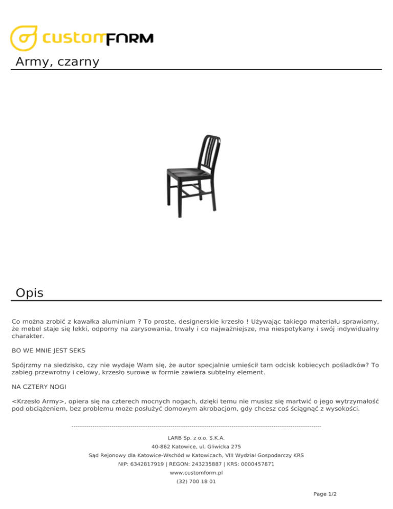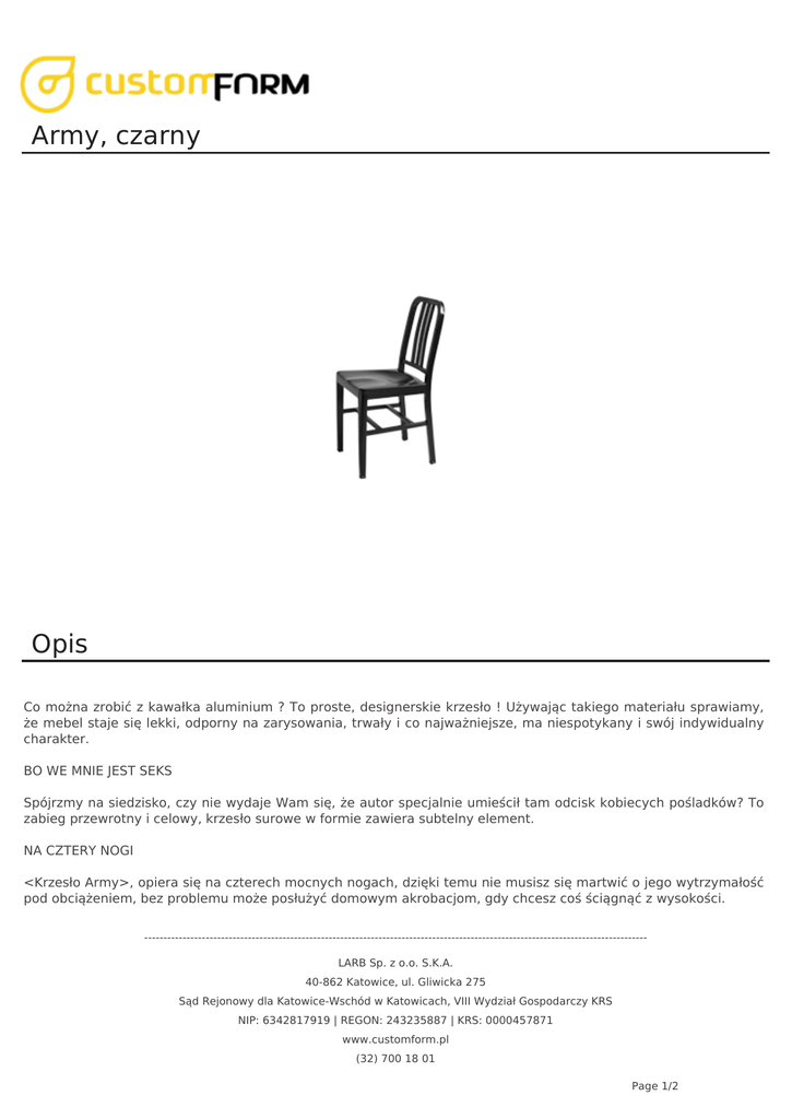 Army, czarny Opis Co można zrobić z kawałka aluminium ? To proste, designerskie krzesło ! Używając takiego materiału sprawiamy, że mebel staje się lekki, odporny na zarysowania, trwały i co najważniejsze, ma niespotykany i swój indywidualny charakter. BO WE MNIE JEST SEKS Spójrzmy na siedzisko, czy nie wydaje Wam się, że autor specjalnie umieścił tam odcisk kobiecych pośladków? To zabieg przewrotny i celowy, krzesło surowe w formie zawiera subtelny element. NA CZTERY NOGI <Krzesło Army>, opiera się na czterech mocnych nogach, dzięki temu nie musisz się martwić o jego wytrzymałość pod obciążeniem, bez problemu może posłużyć domowym akrobacjom, gdy chcesz coś ściągnąć z wysokości. ----------------------------------------------------------------------------------------------------------------------------------LARB Sp. z o.o. S.K.A. 40-862 Katowice, ul. Gliwicka 275 Sąd Rejonowy dla Katowice-Wschód w Katowicach, VIII Wydział Gospodarczy KRS NIP: 6342817919 | REGON: 243235887 | KRS: 0000457871 www.customform.pl (32) 700 18 01 Page 1/2 NIE RYSUJE POWIERZCHNIMimo zadziornego charakteru, jakie ma krzesło Army, zadbaliśmy o to by nie wchodził w konfrontację z Twoją podłogą, nogi zakończone są bezpiecznymi podkładkami z tworzywa sztucznego. OCH TEN INDUSTRIAL ! My również lubimy połączenia, którymi można zaskoczyć innych! Krzesło Army będzie bazą by stworzyć indywidualny wygląd w swojej kuchni czy jadalni, wszędzie tam gdzie chcemy wprowadzić przemysłowy klimat. Specyfikacja Wysokość 75/s.46 cm Szerokość 40 cm Głębokość 49 cm Materiał metal malowany proszkowo Dodatkowe zdjęcia ----------------------------------------------------------------------------------------------------------------------------------LARB Sp. z o.o. S.K.A. 40-862 Katowice, ul. Gliwicka 275 Sąd Rejonowy dla Katowice-Wschód w Katowicach, VIII Wydział Gospodarczy KRS NIP: 6342817919 | REGON: 243235887 | KRS: 0000457871 www.customform.pl (32) 700 18 01 Page 2/2 Powered by TCPDF (www.tcpdf.org)