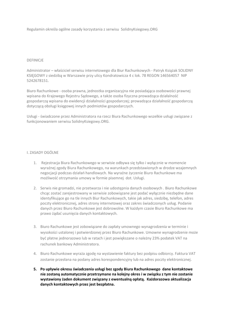 Regulamin określa ogólne zasady korzystania z serwisu SolidnyKsiegowy.ORG DEFINICJE Administrator – właściciel serwisu internetowego dla Biur Rachunkowych - Patryk Książak SOLIDNY KSIĘGOWY z siedzibą w Warszawie przy ulicy Kondratowicza 4 c lok. 78 REGON 146564057 NIP 5242678151. Biuro Rachunkowe - osoba prawna, jednostka organizacyjna nie posiadająca osobowości prawnej wpisana do Krajowego Rejestru Sądowego, a także osoba fizyczna prowadząca działalność gospodarczą wpisana do ewidencji działalności gospodarczej; prowadząca działalność gospodarczą dotyczącą obsługi księgowej innych podmiotów gospodarczych. Usługi - świadczone przez Administratora na rzecz Biura Rachunkowego wszelkie usługi związane z funkcjonowaniem serwisu SolidnyKsiegowy.ORG. I. ZASADY OGÓLNE 1. Rejestracja Biura Rachunkowego w serwisie odbywa się tylko i wyłącznie w momencie wyraźnej zgody Biura Rachunkowego, na warunkach przedstawionych w drodze wzajemnych negocjacji podczas działań handlowych. Na wyraźne życzenie Biuro Rachunkowe ma możliwość otrzymania umowy w formie pisemnej dot. Usługi. 2. Serwis nie gromadzi, nie przetwarza i nie udostępnia danych osobowych . Biuro Rachunkowe chcąc zostać zarejestrowany w serwisie zobowiązane jest podać wyłącznie niezbędne dane identyfikujące go na tle innych Biur Rachunkowych, takie jak adres, siedzibę, telefon, adres poczty elektronicznej, adres strony internetowej oraz zakres świadczonych usług. Podanie danych przez Biuro Rachunkowe jest dobrowolne. W każdym czasie Biuro Rachunkowe ma prawo żądać usunięcia danych kontaktowych. 3. Biuro Rachunkowe jest zobowiązane do zapłaty umownego wynagrodzenia w terminie i wysokości ustalonej i potwierdzonej przez Biuro Rachunkowe. Umowne wynagrodzenie może być płatne jednorazowo lub w ratach i jest powiększane o należny 23% podatek VAT na rachunek bankowy Administratora. 4. Biuro Rachunkowe wyraża zgodę na wystawienie faktury bez podpisu odbiorcy. Faktura VAT zostanie przesłana na podany adres korespondencyjny lub na adres poczty elektronicznej. 5. Po upływie okresu świadczenia usługi bez zgody Biura Rachunkowego dane kontaktowe nie zostaną automatycznie przetrzymane na kolejny okres i w związku z tym nie zostanie wystawiony żaden dokument związany z ewentualną opłatą. Każdorazowa aktualizacja danych kontaktowych przez jest bezpłatna. 6. W każdej chwili Biuro Rachunkowe może zrezygnować z usługi. II. REKLAMACJE 1. Reklamacje mogą być składane wyłącznie drogą elektroniczną za pomocą poczty elektronicznej ([email protected]) lub udostępnionego formularza kontaktowego. Termin na rozpatrzenie reklamacji wynosi 14 dni roboczych i biegnie z chwilą otrzymania zgłoszenia. III. POSTANOWIENIA KOŃCOWE 1. Informacje zawarte w serwisie mają charakter wyłącznie informacyjny. Treści zawarte w serwisie SolidnyKsiegowy.ORG nie mogą być podstawą wysuwania jakichkolwiek roszczeń w stosunku do Administratora. 2. Prawa autorskie podlegają ochronie, przewidzianej w Ustawie z dnia 4 lutego 1994 roku - o prawie autorskim i prawach pokrewnych (Dz. U. Nr 24, poz. 83, ze zm.). 3. Regulamin może być w każdym czasie jednostronnie zmieniony przez Administratora w całości lub w części i obowiązuje w nowym brzmieniu od momentu opublikowania go na stronie internetowej portalu i udostępnienia Biurowi Rachunkowemu w taki sposób, aby mogła ona wzorzec ten przechowywać i odtwarzać w zwykłym toku czynności. 4. Niezależnie od niniejszego Regulaminu Administrator może wprowadzać na postawie osobnych regulaminów akcje promocyjne. Wprowadzania osobnych regulaminów nie jest zmianą niniejszego Regulaminu, chyba że co innego wynika z regulaminów promocji. 5. W sprawach nieuregulowanych w niniejszym regulaminie do świadczenia usług drogą elektroniczną, w szczególności do składania oświadczeń woli w postaci elektronicznej, stosuje się przepisy Kodeksu Cywilnego oraz innych ustaw. 6. Biuro Rachunkowe oświadcza, iż zapoznała się z Regulaminem i akceptuje go w całości. 7. Niniejszy regulamin obowiązuje od dnia opublikowania na stronie internetowej.