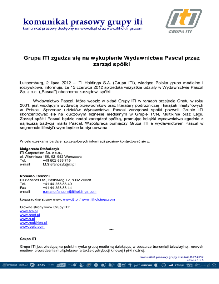 Grupa ITI zgadza się na wykupienie Wydawnictwa Pascal przez zarząd spółki Luksemburg, 2 lipca 2012 – ITI Holdings S.A. (Grupa ITI), wiodąca Polska grupa medialna i rozrywkowa, informuje, że 15 czerwca 2012 sprzedała wszystkie udziały w Wydawnictwie Pascal Sp. z o.o. („Pascal”) obecnemu zarządowi spółki. Wydawnictwo Pascal, które weszło w skład Grupy ITI w ramach przejęcia Onetu w roku 2001, jest wiodącym wydawcą przewodników oraz literatury podróżniczej i książek lifestyl’owych w Polsce. Sprzedaż udziałów Wydawnictwa Pascal zarządowi spółki pozwoli Grupie ITI skoncentrować się na kluczowym biznesie medialnym w Grupie TVN, Multikinie oraz Legii. Zarząd spółki Pascal będzie nadal zarządzał spółką, promując książki wydawnictwa zgodnie z najlepszą tradycją marki Pascal. Współpraca pomiędzy Grupą ITI a wydawnictwem Pascal w segmencie lifestyl’owym będzie kontynuowana. W celu uzyskania bardziej szczegółowych informacji prosimy kontaktować się z: Małgorzata Stefańczyk ITI Corporation Sp. z o.o., ul. Wiertnicza 166, 02–952 Warszawa Tel. +48 502 555 719 e-mail [email protected] Romano Fanconi ITI Services Ltd., Beustweg 12, 8032 Zurich Tel. +41 44 258 88 40 Fax +41 44 258 88 44 e-mail [email protected] korporacyjne strony www: www.iti.pl / www.itiholdings.com Główne strony www Grupy ITI: www.tvn.pl www.onet.pl www.n.pl www.multikino.pl www.legia.com *** Grupa ITI Grupa ITI jest wiodącą na polskim rynku grupą medialną działającą w obszarze transmisji telewizyjnej, nowych mediów, prowadzenia multipleksów, a także dystrybucji kinowej i piłki nożnej. komunikat prasowy grupy iti z dnia 2.07.2012 strona 1 z 5 Nadawanie programów telewizyjnych Grupa ITI prowadzi działalność na rynku telewizyjnym głównie poprzez Grupę TVN, jedną z największych komercyjnych sieci telewizyjnych w Polsce. Grupa TVN jest właścicielem dziesięciu kanałów telewizyjnych. Grupa TVN jest notowana na Giełdzie Papierów Wartościowych w Warszawie (kod notowań na GPW: TVN) od grudnia 2004 roku, będąc częścią indeksu WIG 20. TVN, główny kanał telewizyjny Grupy, jest na polskim rynku uznawany za czołowy program telewizyjny, oferujący wysokiej jakości programy rozrywkowe oraz rzetelne i niezależne audycje informacyjne. TVN dociera do 93% gospodarstw domowych w Polsce. TVN7 to kanał telewizyjny o profilu filmowo-serialowym, uzupełniający ofertę programową TVN. Kanał dociera do 74% gospodarstw domowych w Polsce. TVN24 jest pierwszym polskim 24-godzinnym informacyjno-publicystycznym kanałem telewizyjnym docierającym do 61% gospodarstw domowych w Polsce. TVN CNBC jest kanałem informacyjnym o tematyce biznesowej, przygotowywanym we współpracy z CNBC Europe. Kanał dociera do 55% gospodarstw domowych w Polsce. TVN Meteo to pierwszy polski kanał telewizyjny o pogodzie, docierający do 59% gospodarstw domowych w Polsce. TVN Turbo jest pierwszym polskim kanałem tematycznym adresowanym do mężczyzn i zarazem pierwszym poświęconym głównie motoryzacji. Kanał dociera do 60% gospodarstw domowych. TVN Style jest kanałem telewizyjnym poświęconym urodzie, stylom życia, modzie oraz zdrowiu adresowanym do kobiet. Dociera do 60% gospodarstw domowych. ITVN jest kanałem telewizyjnym skierowanym do widowni pochodzenia polskiego zamieszkałej za granicą, dostępnym w Europie, Ameryce Północnej i w Australii. Telezakupy Mango to jedyny w Polsce całodobowy kanał telesprzedażowy, docierający do 58% gospodarstw domowych. NTL jest lokalnym kanałem telewizyjnym adresowanym do mieszkańców Radomska i okolic. TVN News & Services Agency, najbardziej wszechstronnie działająca agencja mediowa w Europie Środkowej i Wschodniej, jako jedyna w regionie oferuje pełną kompleksowość usług. Oprócz tego Grupa ITI jest właścicielem Telewizji Religia.tv Religia.tv to kanał poruszający tematy z obszaru szeroko pojętej wiary i religii. Kanał nadaje całodobowo, dociera do 8.3 miliona odbiorców poprzez platformy cyfrowe: n, Cyfrę+, Cyfrowy Polsat i TNK oraz największe polskie sieci kablowe i ponad 150 mniejszych sieci lokalnych, dostępny jest w Stanach Zjednoczonych na platformie DISH Network. Online Grupa ITI prowadzi działalność w segmencie nowych mediów poprzez Grupę Onet.pl S.A., największego wydawcy internetowego w Polsce, właściciela portalu Onet oraz innych najchętniej odwiedzanych tematycznych serwisów internetowych, takich jak Sympatia.pl, Zumi.pl, Biznes.pl, Digart.pl, PCLab.pl. Grupa Onet.pl S.A. jest jednostką całkowicie zależną od TVN S.A. Onet jest największym i najczęściej odwiedzanym medium internetowym w Polsce. Należy do grona najbardziej opiniotwórczych mediów w Polsce. Serwisy prowadzone przez Onet.pl są w większości liderami rynkowymi w swoich kategoriach tematycznych. komunikat prasowy grupy iti z dnia 2.07.2012 strona 2 z 5 Sukces w swoich kategoriach odnoszą również: Sympatia.pl - najpopularniejszy w Polsce serwis towarzysko-randkowy. Zumi.pl – należy do TOP15 najchętniej odwiedzanych stron w polskiej sieci. Zumi to wygodne narzędzie, łączące cechy serwisów mapowych, nawigacyjnych i ogłoszeniowych. Agreguje m.in. miliony ogłoszeń o usługach i produktach, nieruchomości, miejsca użyteczności publicznej, rozkłady jazdy komunikacji miejskiej oraz wirualne panoramy oraz usługę Ulica 360 umożliwiającą wirtualne spacery ulicami kilkunastu największych polskich miast. Vod.onet.pl - największy polski serwis „wideo na życzenie” umożliwiający oglądanie za pomocą przeglądarki internetowej polskich i zagranicznych seriali, rozrywkowych programów telewizyjnych, pełnometrażowych filmów fabularnych, dokumentalnych, bajek i teledysków. Plejada.pl - popularny multimedialny serwis internetowy poświęcony informacjom ze świata show-biznesu. tvn24.pl - pierwszy w Polsce wortal informacyjny, który łączy w sobie tekst, dźwięk i obraz. Znajdują się w nim