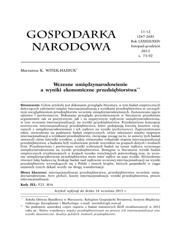 GOSPODARKA NARODOWA 11-12 (267-268) Rok LXXXIII/XXIV listopad-grudzień 2013 s. 73-92 Marzanna K. WITEK-HAJDUK* Wczesne umiędzynarodowienie a wyniki ekonomiczne przedsiębiorstwa** Streszczenie: Celem artykułu jest dokonanie przeglądu literatury, w tym badań empirycznych dotyczących zależności między internacjonalizacją a wynikami przedsiębiorstwa ze szczególnym uwzględnieniem przedsiębiorstw wcześnie umiędzynarodowionych. Zastosowano ujęcie opisowe i porównawcze. Dokonano przeglądu prezentowanych w literaturze przedmiotu argumentów tak za pozytywnym, jak i za negatywnym wpływem umiędzynarodowienia, w tym wczesnej internacjonalizacji, na wyniki przedsiębiorstwa. Przedstawiono koncepcje teoretyczne internacjonalizacji przedsiębiorstwa, które podejmują kwestię kosztów związanych z umiędzynarodowieniem i ich wpływu na wyniki (performance). Zaprezentowano także, stwierdzone na podstawie badań empirycznych, różne zależności między stopniem internacjonalizacji a wynikami przedsiębiorstw, zwracając uwagę na to, że autorzy tych badań stosowali różne mierniki wyników, a także różnorodne wskaźniki stopnia internacjonalizacji przedsiębiorstwa, a badania były realizowane przede wszystkim na grupach dużych i średnich firm. Przedstawiono i porównano wyniki wybranych badań na temat wpływu wczesnego umiędzynarodowienia na wyniki przedsiębiorstwa. Dostępne w literaturze wyniki badań empirycznych zrealizowanych w krajach wysoko rozwiniętych potwierdzają tezę, że wczesne umiędzynarodowienie przedsiębiorstwa może mieć wpływ na jego wyniki. Stwierdzono również lukę badawczą: brakuje badań nad wpływem wczesnej internacjonalizacji na wyniki przedsiębiorstw wywodzących się z Polski i innych krajów, których gospodarki w ciągu ostatnich trzech dekad weszły na drogę transformacji. Słowa kluczowe: internacjonalizacja przedsiębiorstwa, przedsiębiorstwa wcześnie umiędzynarodowione, born globals, koszty internacjonalizacji, wyniki przedsiębiorstwa, proces internacjonalizacji. Kody JEL: F23, M16 Artykuł wpłynął do druku 24 września 2013 r. * ** Szkoła Główna Handlowa w Warszawie, Kolegium Gospodarki Światowej, Instytut Międzynarodowego Zarządzania i Marketingu, e-mail: [email protected] Na podstawie autorskiej części raportu z badań statutowych KGŚ zrealizowanych w 2012 roku pt.: Wpływ współpracy między przedsiębiorstwami na procesy ich internacjonalizacji oraz wyniki ekonomiczne. Analiza polskich średnich przedsiębiorstw. 74 GOSPODARKA NARODOWA Nr 11-12/2013 Wstęp Jednym z istotnych problemów poruszanych w publikacjach na temat internacjonalizacji przedsiębiorstw jest relacja między umiędzynarodowieniem przedsiębiorstwa a jego wynikami. Nie ma jednak jednej, spójnej koncepcji teoretycznej wyjaśniającej wyniki przedsiębiorstwa w kontekście umiędzynarodowienia, a poszczególne kwestie odnoszące się do tego zagadnienia były wyjaśniane z odwołaniem do różnych koncepcji. W pierwszej kolejności badacze zajęli się tematem kosztów związanych z umiędzynarodowieniem, które mają wpływ na wyniki przedsiębiorstwa. Dopiero w późniejszym okresie podjęto problem wyników (performance) umiędzynarodowionych przedsiębiorstw, a przede wszystkim zależności między stopniem ich internacjonalizacji a wynikami. Autorzy tych publikacji stosują jednak zróżnicowane mierniki wyników, a także różne wskaźniki stopnia internacjonalizacji przedsiębiorstwa. Badania empiryczne dotyczące zależności między internacjonalizacją przedsiębiorstwa a wynikami były realizowane przede wszystkim na dużych przedsiębiorstwach, od wielu lat działających na rynku międzynarodowym i reprezentujących proces internacjonalizacji zgodny z modelem uppsalskim. Mimo, że w ramach krytyki modelu uppsalskiego, podjęto od lat 90. XX wieku badania nad przedsiębiorstwami wcześnie umiędzynarodowionymi, które nie przechodzą wyróżnionych w modelu uppsalskim etapów umiędzynarodowienia, niewiele jest wciąż publikacji oraz badań empirycznych dotyczących takich zależności w przypadku tych przedsiębiorstw oraz wpływu wczesnego umiędzynarodowienia na wyniki przedsiębiorstwa. Przedsiębiorstwa wcześnie umiędzynarodowione – definicje i klasyfikacja Badania nad przedsiębiorstwami wcześnie umiędzynarodowionymi pojawiły się jako element krytycznego podejścia do modelu uppsalskiego. Jego krytycy wskazywali bowiem, że wiele podmiotów nie przechodzi wyróżnionych w tym modelu etapów umiędzynarodowienia. Zwrócono uwagę na zjawisko „przyspieszenia” procesu internacjonalizacji polegające na omijaniu kolejnych wyróżnionych w tym modelu faz i szybkiego przechodzeniem do bardziej zaawansowanych, w tym także kapitałowych, form ekspansji. Zidentyfikowano też przypadki wczesnej ekspansji przedsiębiorstw na rynki, które są wprawdzie atrakcyjne, ale odległe, biorąc pod uwagę dystans psychiczny i geograficzny, w stosunku do macierzystego rynku danego podmiotu. Zjawisko omijania wczesnych etapów umiędzynarodowienia stwierdzono przede wszystkim w przypadku korporacji transnarodowych, lecz badania wykazały, że dotyczy ono też małych i średnich przedsiębiorstw, w tym przede wszystkim z branż nowoczesnych technologii [Hedlund, Kverneland, 1984, s. 1-12], [Nordström, 1990]. Prekursorskie badania przeprowadzone przez Younga [1987, s. 31-40] na grupie istniejących zaledwie kilka lat przedsiębiorstw branż wyso- Marzanna K. Witek-Hajduk, Wczesne umiędzynarodowienie a wyniki ekonomiczne… 75 kich technologii wykazały wysoki stopień ich internacjonalizacji. Także inne badania zrealizowane na populacji przedsiębiorstw branż zaawansowanych technologii wykazały, że blisko połowa rozpoczęła eksport w ciągu zaledwie dwu lat od ich powstania i stosowała różne formy ekspansji na rynki zagraniczne [Bengtsson, 2004, s. 32]. Według badania zrealizowanego przez OECD w 1997 roku w 26 