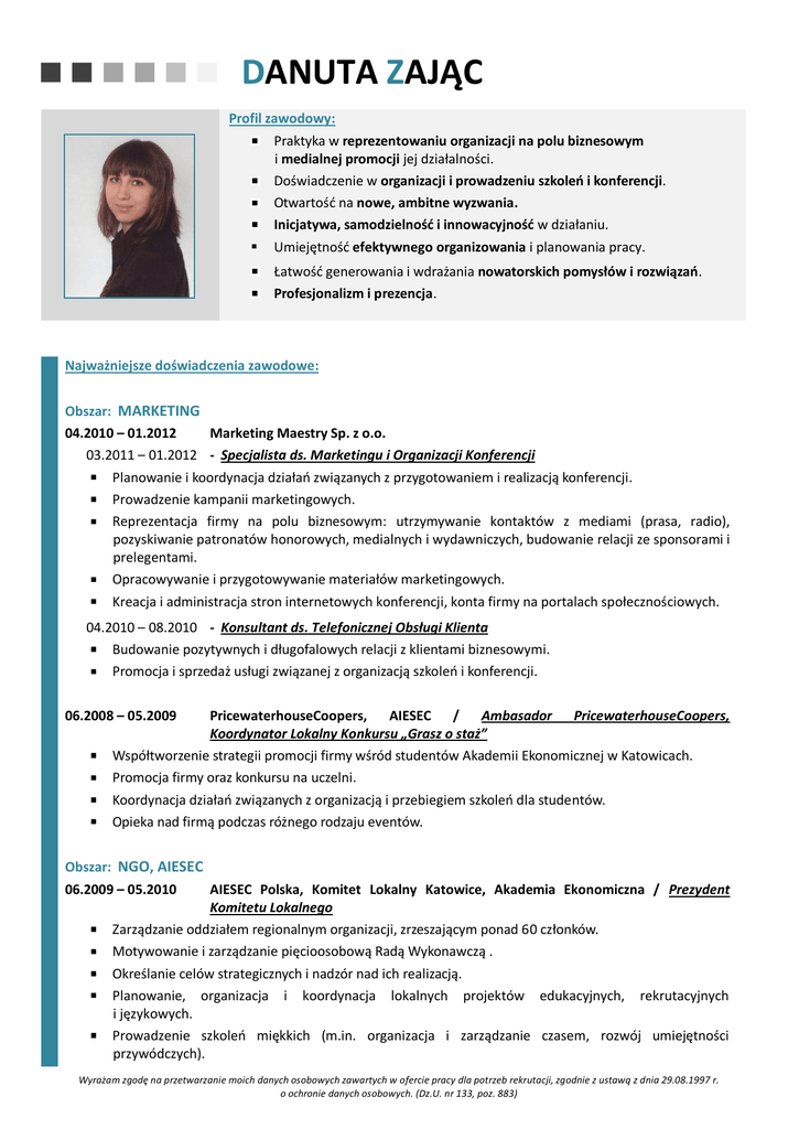 DANUTA ZAJĄC Profil zawodowy: Praktyka w reprezentowaniu organizacji na polu biznesowym i medialnej promocji jej działalności. Doświadczenie w organizacji i prowadzeniu szkoleo i konferencji. Otwartośd na nowe, ambitne wyzwania. Inicjatywa, samodzielnośd i innowacyjnośd w działaniu. Umiejętnośd efektywnego organizowania i planowania pracy. Łatwośd generowania i wdrażania nowatorskich pomysłów i rozwiązao. Profesjonalizm i prezencja. Najważniejsze doświadczenia zawodowe: Obszar: MARKETING 04.2010 – 01.2012 Marketing Maestry Sp. z o.o. 03.2011 – 01.2012 - Specjalista ds. Marketingu i Organizacji Konferencji Planowanie i koordynacja działao związanych z przygotowaniem i realizacją konferencji. Prowadzenie kampanii marketingowych. Reprezentacja firmy na polu biznesowym: utrzymywanie kontaktów z mediami (prasa, radio), pozyskiwanie patronatów honorowych, medialnych i wydawniczych, budowanie relacji ze sponsorami i prelegentami. Opracowywanie i przygotowywanie materiałów marketingowych. Kreacja i administracja stron internetowych konferencji, konta firmy na portalach społecznościowych. 04.2010 – 08.2010 - Konsultant ds. Telefonicznej Obsługi Klienta Budowanie pozytywnych i długofalowych relacji z klientami biznesowymi. Promocja i sprzedaż usługi związanej z organizacją szkoleo i konferencji. 06.2008 – 05.2009 PricewaterhouseCoopers, AIESEC / Ambasador PricewaterhouseCoopers, Koordynator Lokalny Konkursu „Grasz o staż” Współtworzenie strategii promocji firmy wśród studentów Akademii Ekonomicznej w Katowicach. Promocja firmy oraz konkursu na uczelni. Koordynacja działao związanych z organizacją i przebiegiem szkoleo dla studentów. Opieka nad firmą podczas różnego rodzaju eventów. Obszar: NGO, AIESEC 06.2009 – 05.2010 AIESEC Polska, Komitet Lokalny Katowice, Akademia Ekonomiczna / Prezydent Komitetu Lokalnego Zarządzanie oddziałem regionalnym organizacji, zrzeszającym ponad 60 członków. Motywowanie i zarządzanie pięcioosobową Radą Wykonawczą . Określanie celów strategicznych i nadzór nad ich realizacją. Planowanie, organizacja i koordynacja lokalnych projektów edukacyjnych, rekrutacyjnych i językowych. Prowadzenie szkoleo miękkich (m.in. organizacja i zarządzanie czasem, rozwój umiejętności przywódczych). Wyrażam zgodę na przetwarzanie moich danych osobowych zawartych w ofercie pracy dla potrzeb rekrutacji, zgodnie z ustawą z dnia 29.08.1997 r. o ochronie danych osobowych. (Dz.U. nr 133, poz. 883) Organizacja konferencji na poziomie lokalnym. Reprezentacja Komitetu Lokalnego w regionie oraz na arenie AIESEC Polska i AIESEC Świat. Edukacja: 09.2010 – 02.2011 10.2006 – 09.2011 Uniwersytet Hasselt w Belgii / Ekonomia Stosowana (Applied Economics) – w ramach programu Erasmus Uniwersytet Ekonomiczny w Katowicach, Wydział Ekonomii / Komunikacja w Biznesie Krajowym i Międzynarodowym – studia magisterskie Kursy, szkolenia, konferencje: Internetowy kurs obsługi programów graficznych (+ dtp) – CorelDraw X5, Photoshop CS5, Illustrator CS5, Indesign CS5 – w trakcie Warsztaty „Brand Marketing”, Danone, Warszawa, 23.11.2011 "Biznes to Relacje", BNI Polska, Warszawa, 17.11.2011 „Sandler Café - spotkania z metodą Sandlera”, Sandler Training, Czeladź, 5.10. 2011 „Festiwal Inspiracji - czyli szwedzki stół dobrych idei”, Stowarzyszenie Profesjonalnych Mówców w Polsce, Warszawa, 28.07.2011 „Obsługa Klienta OK-Silesia 2011”, Marketing Maestry, Katowice, 15-16.06.2011 „Wszystko co można zrobid z facebookiem”, Marketing Maestry, Katowice, 07.04.2011 „Zarządzanie relacjami”, Deloitte, Belgia, 30.11.2010 „Life After Now”, Houston Spencer, Łuków, 03.2010 „NLP”, PricewaterhouseCoopers, Warszawa, 26.09.2008 „Zarządzanie czasem”, PROSPERO Business Training, Chorzów, 03-04.07.2008 „Wystąpienia publiczne”, PricewaterhouseCoopers, Warszawa, 06.2008 „Jak wykopad żeby nie wpaśd” Szkolenie z negocjacji, Bank Millennium, Międzyzdroje, 04.04.2008 „Obsługa klienta”, Capgemini, Katowice, 31.03.2008 AIESEC: zarządzanie czasem, zarządzanie projektem, sprzedaż, coaching, autoprezentacja, przeprowadzanie szkoleo, warsztaty z komunikacji podczas wydarzenia „Różne oblicza komunikowania” Członkostwo w organizacjach: Śląskie Towarzystwo Marketingowe (03.2011 – obecnie): Rzecznik Prasowy Pełnomocnik Zarządu ds. Kontaktu z Członkami (04.2010 – obecnie) AIESEC Belgia Komitet Lokalny Limburg (09.2010 – 02.2011): Rekruter, Członek Zespołu ds. Programu Praktyk Zagranicznych AIESEC Ukraina Komitet Lokalny Odessa (06.2010 – 08.2010): Wolontariusz Projektu Summer Camp AIESEC Polska Komitet Lokalny Katowice AE (10.2007 – 03.2011): Pełnoprawny Członek, Członek Projektów Marketingowych, Lider Projektów (5-12 osobowych, tematyka: społeczna, marketingowa, edukacyjna), Prezydent Komitetu Lokalnego Umiejętności: Języki obce: bardzo dobra znajomośd angielskiego, podstawowa znajomośd niemieckiego i rosyjskiego Obsługa komputera: MS Office, CRM, Photoshop, Corel Draw, Adobe Dreamweaver, HTML Zainteresowania: Sport: jazda na rowerze, pływanie Szkicowanie, komunikacja interpersonalna, reklama Wyrażam zgodę na przetwarzanie moich danych osobowych zawartych w ofercie pracy dla potrzeb rekrutacji, zgodnie z ustawą z dnia 29.08.1997 r. o ochronie danych osobowych. (Dz.U. nr 133, poz. 883)