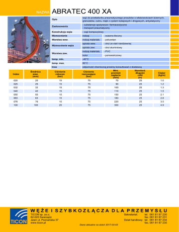 NAZWA ABRATEC 400 XA Opis wąż do przeładunku pneumatycznego proszków o właściwościach ściernych, granulatów, cukru, mąki z cystern kolejowych i drogowych, antystatyczny Zastosowania - substancje spożywcze i farmaceutyczne - transport pneumatyczny Konstrukcja węża - wąż kompozytowy Wzmocnienie rodzaj - ssawno-tłoczny Warstwa wew. rodzaj materiału - poliuretan spirala wew. - drut ze stali nierdzewnej spirala zew. - drut aluminiowy rodzaj materiału - PVC kolor - pomarańczowy Wzmocnienie węża Warstwa zew. Index Index Średnica wew. (mm) temp. min. -40°C temp. max. 80°C Inne odporność chemiczną prosimy konsultować z dostawcą Ciśnienie robocze (bar) Ciśnienie rozrywające (bar) Mini. Mini. promień promień zagięcia zagięcia (mm) (mm) 70 Standard. Standard. długość długość rolki rolki (m) (m) 25 Ciężar Ciężar (kg/m) (kg/m) 020 20 15 75 025 25 15 75 90 25 1.0 1.2 032 32 15 75 100 25 1.3 040 40 15 75 110 25 1.5 050 50 15 75 150 25 2.1 063 63 15 75 180 25 2.8 076 76 15 75 220 25 3.5 100 100 25 75 300 25 4.9 WĘŻE I SZYBKOZŁĄCZA DLA PRZEMYSŁU TICON sp. zo.o. 62-020 Swarzędz Jasin ul. Poznańska 37 www.ticon.pl Sekretariat: Dane aktualne na dzień 2017-03-02 tel. 061 81 87 230 fax. 061 81 87 231 Dział handlowy: tel. 061 81 87 234 fax. 061 81 87 235