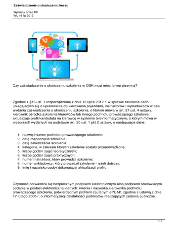 Zaświadczenie o ukończeniu kursu Wpisany przez BS Wt, 16 lip 2013 Czy zaświadczenie o ukończeniu szkolenia w OSK musi mieć formę pisemną? Zgodnie z §15 ust. 1 rozporządzenia z dnia 13 lipca 2012 r. w sprawie szkolenia osób ubiegających się o uprawnienia do kierowania pojazdami, instruktorów i wykładowców w celu wydania zaświadczenia o ukończeniu szkolenia, o którym mowa w art. 27 ust. 4 ustawy, kierownik ośrodka szkolenia kierowców lub innego podmiotu prowadzącego szkolenie aktualizuje profil kandydata na kierowcę w systemie teleinformatycznym, o którym mowa w przepisach wydanych na podstawie art. 20 ust. 1 pkt 2 ustawy, o następujące dane: 1. 2. 3. 4. 5. 6. 7. 8. 9. nazwę i numer podmiotu prowadzącego szkolenie; datę rozpoczęcia szkolenia; datę zakończenia szkolenia; kategorie, w zakresie których szkolenie zostało przeprowadzone; liczbę godzin zajęć teoretycznych; liczbę godzin zajęć praktycznych; numer instruktora, który prowadził szkolenie; numer wykładowcy, który prowadził szkolenie - jeżeli dotyczy; imię i nazwisko osoby dokonującej aktualizacji profilu. Czynność potwierdza się bezpiecznym podpisem elektronicznym albo podpisem stanowiącym podanie w postaci elektronicznej danych: imienia i nazwiska kierownika podmiotu prowadzącego szkolenie, potwierdzonym profilem zaufanym ePUAP, zgodnie z ustawą z dnia 17 lutego 2005 r. o informatyzacji działalności podmiotów realizujących zadania publiczne. 1/2 Zaświadczenie o ukończeniu kursu Wpisany przez BS Wt, 16 lip 2013 Powyższe może sugerować, że aktualizacja profilu kierowcy o powyższe stanowi wydanie zaświadczenia o ukończeniu kursu. Jednakże zgodnie z art. 27 ust. 4 ustawy o kierujących pojazdami ośrodek szkolenia kierowców lub inny podmiot prowadzący szkolenie wydaje osobie ubiegającej się o uzyskanie uprawnienia do kierowania motorowerem, pojazdem silnikowym lub uprawnienia do kierowania tramwajem zaświadczenie o ukończeniu szkolenia. Zgodnie z ust. 5 zaświadczenie podpisuje odpowiednio kierownik ośrodka szkolenia kierowców albo kierownik innego podmiotu prowadzącego szkolenie. Natomiast zgodnie z ust. 7 dokumentacja szkolenia, może być prowadzona w formie elektronicznej, ale z wyłączeniem wydawania zaświadczeń o ukończeniu kursu. Przepisy rozporządzania, które jest aktem prawnym niższego rzędu, nie mogą zmieniać przepisów rangi ustawowej. Z powyższego wynika, że niezależnie od aktualizacji profilu kandydata na kierowcę kierownik ośrodka szkolenia kierowców powinien wydać osobie, która ukończyła szkolenie także pisemne zaświadczenie o ukończeniu kursu. Sygnalizuje jednocześnie, że wbrew dyspozycji art. 32 ust. 3 ustawy przepisy rozporządzenia nie określa wzoru zaświadczenia, można jedynie domniemywać, że powinien on zawierać informację określone w §15 rozporządzenia. Taki dokument w wersji papierowej nie ma praktycznie żadnej wartości, ponieważ nie może stanowić podstawy do dopuszczenia do egzaminu państwowego. Może co najwyższej posłużyć kierującemu do skierowania skargi na ośrodek szkolenia kierowców lub sprawy z powództwa cywilnego (np. w przypadku wydania zaświadczenia bez dokonania aktualizacji profilu, na skutek czego osoba nie mogła podejść do egzaminu). Również brak jest przepisu, który zobowiązywałby prowadzącego ośrodek szkolenia kierowców do archiwizacji odpisu lub kopii wydanego zaświadczenia w wersji papierowej. 2/2