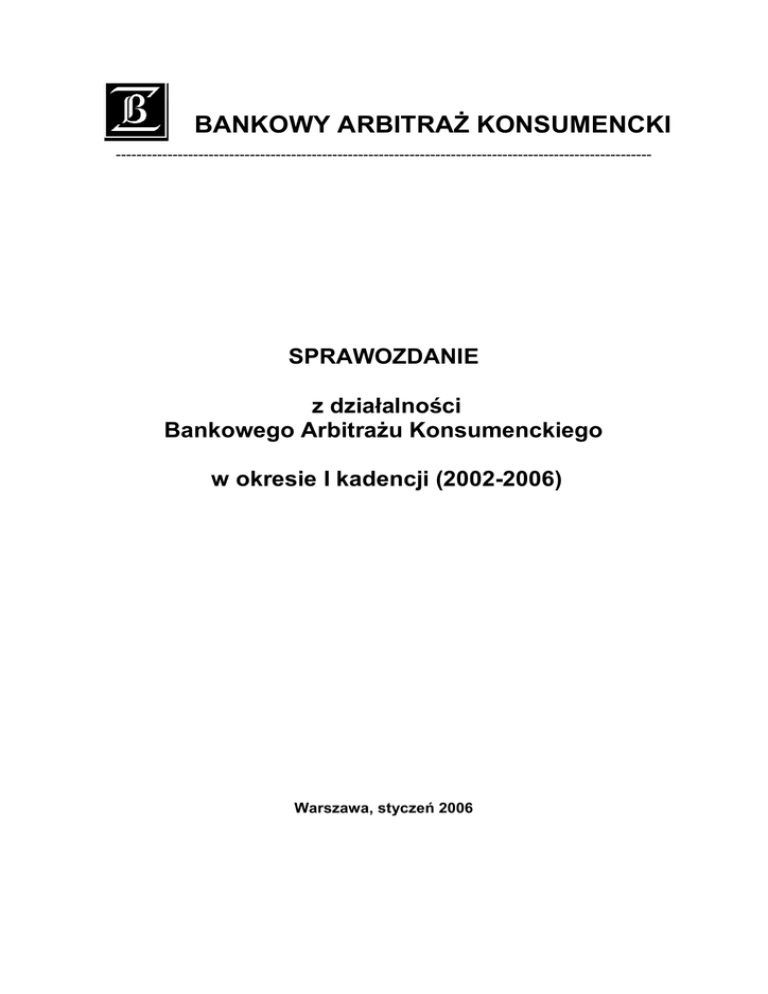 BANKOWY ARBITRAŻ KONSUMENCKI -------------------------------------------------------------------------------------------------------- SPRAWOZDANIE z działalności Bankowego Arbitrażu Konsumenckiego w okresie I kadencji (2002-2006) Warszawa, styczeń 2006 A. Informacje ogólne Bankowy Arbitraż Konsumencki (BAK) rozpoczął swoją działalność w dniu 1 marca 2002 roku. Funkcję Arbitra Bankowego pełni Pani Katarzyna Marczyńska. Podczas przygotowywania podstawowych dokumentów regulujących jego funkcjonowanie opierano się przede wszystkim na polskich doświadczeniach z tego zakresu oraz na „Zaleceniu Komisji Europejskiej z dnia 30 marca 1998 roku nr 98/257/EC w sprawie podstawowych zasad dotyczących instytucji odpowiedzialnych za prowadzenie pozasądowych postępowań rozjemczych z udziałem konsumentów”. Bankowy Arbitraż Konsumencki współpracuje w ramach Biura Związku Banków Polskich z Zespołem Ochrony Konsumenta i Rozwoju Rynków Finansowych. W dniu 5 stycznia 2006 roku Zarząd powołał Panią Katarzynę Marczyńską na funkcję Arbitra Bankowego na okres II kadencji (2006-2010). B. Wnioski kierowane do Bankowego Arbitrażu Konsumenckiego W latach 2002 - 2005 ugruntowana została pozycja instytucji Arbitra Bankowego jako pozasądowego organu rozjemczego, powołanego przez banki do szybszego i tańszego rozstrzygania sporów między konsumentami i bankami – członkami Związku Banków Polskich. Charakter tej instytucji potwierdzany jest w orzecznictwie sądów powszechnych, do których konsumenci, niezadowoleni z orzeczeń Arbitra, mogą składać pozwy; dotychczas miało to miejsce w 5 przypadkach, z czego w dwóch sprawach sąd powszechny podzielił stanowisko konsumenta, zaś w trzech – wydał wyrok zgodny z orzeczeniem Arbitra. Odnotować również należy, że w kilkunastu przypadkach wniesienia przez konsumentów pozwów do sądów, bez uprzedniego skorzystania z trybu arbitrażowego, pełnomocnicy banków powołali się na orzeczenia Arbitra wydane w podobnych sprawach i sądy wydały tożsame wyroki. Z roku na rok rośnie również udział w postępowaniu arbitrażowym profesjonalnych pełnomocników konsumentów, głównie rzeczników konsumentów i radców prawnych, co znacznie przyspiesza postępowanie i pozwala skoncentrować rozważania na istocie sprawy. Znamienny jest również okresowy wzrost liczby sporów danego rodzaju (dotyczących np. ochrony danych osobowych, dopuszczalności cesji wierzytelności, kredytu konsumenckiego), zależny wyłącznie od treści publikacji prasowych, szczególnie informacji o wydanych orzeczeniach Sądu Ochrony Konkurencji i Konsumentów, decyzjach GIODO i sądów administracyjnych i o wynikach kontroli Prezesa UOKiK. Nadal utrzymuje się tendencja konsumentów w postrzeganiu roli Związku Banków Polskich jako instytucji nadzorczej dla banków oraz rozszerzające pojmowanie zadań Arbitra Bankowego. Systematycznie zwiększa się liczba kierowanych do Arbitra pism dotyczących skarg na działalność banków lub instytucji powszechnie kojarzonych, niekiedy mylnie, z bankami – SKOK-ów, pośredników kredytowych, firm windykacyjnych. Poza normalną procedurą rozstrzygania sporów wiele osób pragnie telefonicznie zasięgnąć rady u Arbitra w konkretnych sprawach, zwłaszcza przed zawarciem umowy z bankiem lub też przedstawić swój pogląd dotyczący działalności banków, problemów związanych np. z likwidacją placówki czy zmianą jej 2 pracowników itp. Ilość takich kontaktów znacząco przewyższa liczbę składanych formalnych wniosków, przy czym docierają do BAK również konsumenci pragnący wyrazić zadowolenie z działalności banku lub danej usługi. Wiele osób dzwoni również „prewencyjnie”, przed zawarciem umowy, w celu skonsultowania z Arbitrem prawidłowości zapisów umownych. Mimo 4-letniego istnienia instytucji, wciąż składane są wnioski pochodzące od przedsiębiorców, wspólnot mieszkaniowych, szkolnych kas zapomogowo – pożyczkowych, pracowników banków oraz skargi nieopłacone. W grupie spraw nie podlegających jurysdykcji Arbitra zdecydowanie wzrasta liczba spraw uprzednio rozstrzygniętych już przez sądy powszechne, w których toczy się postępowanie egzekucyjne, i konsumenci podnoszą zarzut pozbawienia ich w postępowaniu sądowym prawa do obrony lub starają się podważyć merytoryczną zasadność orzeczenia. Odnotować jednak należy, iż po wprowadzeniu, w porozumieniu ze Stowarzyszeniem Konsumentów Polskich oraz z Federacją Konsumentów, comiesięcznych telefonicznych dyżurów Arbitra w siedzibach obu organizacji, podczas których odpowiada on na pytania Rzeczników Konsumentów i samych konsumentów, dotyczące trybu postępowania arbitrażowego, zdecydowanie spadła liczba omawianych wniosków, a konsumenci są odsyłani po pomoc do właściwych instytucji. Z uwagi na stały wzrost akcji kredytowej banków – członków ZBP, najczęściej występującym rodzajem sporów, których odsetek wzrasta co rok - od 30% w 2002 roku do 62% w 2005 roku, są sprawy związane z udzielonymi kredytami, przy czym stronami postępowań są zarówno kredytobiorcy i ich spadkobiercy, jak i poręczyciele. I tak, konsumenci np. podnoszą zarzut ustalenia wysokości opłaty przygotowawczej na poziomie uniemożliwiającym odstąpienie od umowy, niestaranny dobór firm pośredniczących w zawarciu umowy kredytu i sprzedawców/usługodawców współpracujących z bankami (wobec ich części toczą się postępowania przygotowawcze), a także brak porozumień między wymienionymi podmiotami, dotyczących sposobu rozliczenia kredytu w przypadku odstąpienia konsumenta od umowy, co skutkuje niemożnością wykonania tego prawa przez kredytobiorców w przypadku łącznego zawarcia umowy sprzedaży i kredytu. Konsumenci skarżą także wysokość odsetek umownych oraz odsetek od zadłużenia przeterminowanego, przy czym znaczna część konsumentów wnosi przede wszystkim o umożli