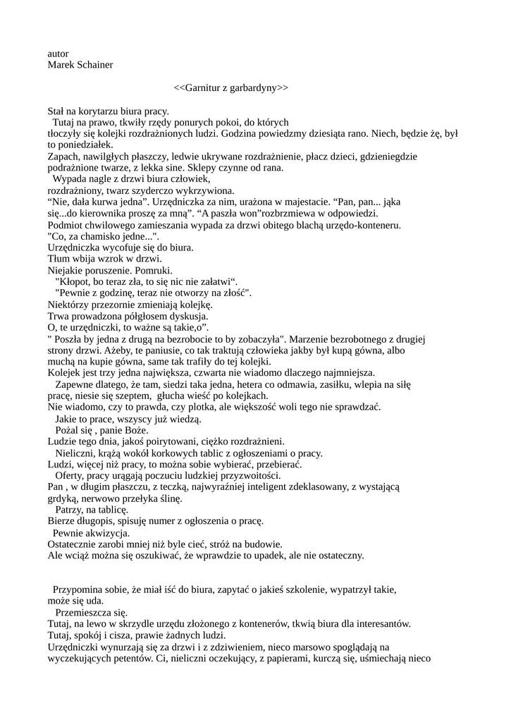 autor Marek Schainer <<Garnitur z garbardyny>> Stał na korytarzu biura pracy. Tutaj na prawo, tkwiły rzędy ponurych pokoi, do których tłoczyły się kolejki rozdrażnionych ludzi. Godzina powiedzmy dziesiąta rano. Niech, będzie żę, był to poniedziałek. Zapach, nawilgłych płaszczy, ledwie ukrywane rozdrażnienie, płacz dzieci, gdzieniegdzie podrażnione twarze, z lekka sine. Sklepy czynne od rana. Wypada nagle z drzwi biura człowiek, rozdrażniony, twarz szyderczo wykrzywiona. “Nie, dała kurwa jedna”. Urzędniczka za nim, urażona w majestacie. “Pan, pan... jąka się...do kierownika proszę za mną”. “A paszła won”rozbrzmiewa w odpowiedzi. Podmiot chwilowego zamieszania wypada za drzwi obitego blachą urzędo-konteneru. "Co, za chamisko jedne...". Urzędniczka wycofuje się do biura. Tłum wbija wzrok w drzwi. Niejakie poruszenie. Pomruki. "Kłopot, bo teraz zła, to się nic nie załatwi“. "Pewnie z godzinę, teraz nie otworzy na złość". Niektórzy przezornie zmieniają kolejkę. Trwa prowadzona półgłosem dyskusja. O, te urzędniczki, to ważne są takie,o”. " Poszła by jedna z drugą na bezrobocie to by zobaczyła". Marzenie bezrobotnego z drugiej strony drzwi. Ażeby, te paniusie, co tak traktują człowieka jakby był kupą gówna, albo muchą na kupie gówna, same tak trafiły do tej kolejki. Kolejek jest trzy jedna największa, czwarta nie wiadomo dlaczego najmniejsza. Zapewne dlatego, że tam, siedzi taka jedna, hetera co odmawia, zasiłku, wlepia na siłę pracę, niesie się szeptem, głucha wieść po kolejkach. Nie wiadomo, czy to prawda, czy plotka, ale większość woli tego nie sprawdzać. Jakie to prace, wszyscy już wiedzą. Pożal się , panie Boże. Ludzie tego dnia, jakoś poirytowani, ciężko rozdrażnieni. Nieliczni, krążą wokół korkowych tablic z ogłoszeniami o pracy. Ludzi, więcej niż pracy, to można sobie wybierać, przebierać. Oferty, pracy urągają poczuciu ludzkiej przyzwoitości. Pan , w długim płaszczu, z teczką, najwyraźniej inteligent zdeklasowany, z wystającą grdyką, nerwowo przełyka ślinę. Patrzy, na tablicę. Bierze długopis, spisuję numer z ogłoszenia o pracę. Pewnie akwizycja. Ostatecznie zarobi mniej niż byle cieć, stróż na budowie. Ale wciąż można się oszukiwać, że wprawdzie to upadek, ale nie ostateczny. Przypomina sobie, że miał iść do biura, zapytać o jakieś szkolenie, wypatrzył takie, może się uda. Przemieszcza się. Tutaj, na lewo w skrzydle urzędu złożonego z kontenerów, tkwią biura dla interesantów. Tutaj, spokój i cisza, prawie żadnych ludzi. Urzędniczki wynurzają się za drzwi i z zdziwieniem, nieco marsowo spoglądają na wyczekujących petentów. Ci, nieliczni oczekujący, z papierami, kurczą się, uśmiechają nieco wstydliwie, lub zachowują doskonałą wschodnioazjatycką mimikrę. Żadnego wyrazu twarzy, wyłącznie oczekiwanie.Z jednego z biur w międzyczasie wychodzi dyskutujący w najlepsze z urzędniczką człowiek. Opiszmy, go dla lepszej retrospektywy. Dzisiaj może być to, zacny biznesmen, może lokalny polityk, wybitna podpora społeczności, i swojej parafi. „Słuchaj, potrzebuję kilka szwaczek”. Wyszli z biura, najwidoczniej aby omówić szczegóły transakcji. „Dobra, mówi urzędniczka. „Więc, tak. Dostaniesz parę szwaczek”. „Ale,słuchaj, będziesz musiał im płacić 500-600 złotych,na miesiąc jednak się, nie martw”. „Całą pensję, urząd i tak będzie ci zwracać". "Przez pół roku". „Tyle, że pamiętaj przez rok, musisz je zatrudniać, nie możesz zwolnić”. Jakby, nie było rzecz wygląda sama w sobie obiecująco. Biznesmen promienieje. Głos urzędniczki nieco ściszony. Widać, że to wymiana zdań nie przeznaczona dla uszu profanów. Opiszmy go, dokładniej, gwoli potomności. Teczka, skórzana, aktówka, nieco pretensjonalna, ale sygnalizująca, że biznesmen nosi w niej ważne, papiery. Jakiż od razu wytwarza to dystans wobec reszty goszczących w tym przybytku. Wzrok ostry, skoncentrowany, chociaż nieco jeszcze niespokojny. Widać, że groszem, nie śmierdzi (póki co). Spodnie w kant. Garnitur z garbardyny, mocno sfatygowany. Spodnie, nieco przykrótkie odsłaniają wesołe, białe skarpetki. Pełen zapału i entuzjazmu, przybija do czterdziestki. „Świetnie, świetnie, mówisz, że będą zwracać”. Nieomal, widać, jak zaciera ręce, przelicza w myślach. Głos jego nabiera ważności i pewności siebie. Oczami,wyobraźni widzi schylone pracowicie, nad maszynami do szycia głowy swoich ,, pracownic. To, już jest głos przyszłego pracodawcy. „Potrzebuje je, na...nie, nie teraz. Na sierpień”. W głosie tym , słychać nową nutę, nutę stanowczości i władczości. ”Ależ, oczywiście” uśmiecha się słodko i wyrozumiale urzędniczka. „To, żaden problem”. Uśmiech ten jest uśmiechem, kogoś, kto od dawna zna reguły gry. Przyszły biznesmen jest jak widać, tutaj jeszcze nowicjuszem. Ona, nie. Nie pierwszy, to widać, kogo jej urzędowa wiedza, wtajemnicza w zawiłe arkana ,,zarządzania zasobami ludzkimi”. „Urząd, ci zwróci wypłaty” mówi. „Nic, nie stracisz”. Najwyraźniej są na ty, najwyraźniej to znajomość spoza urzędu. Wymienia przy okazji jego imię, ale jakie przepadło w mrokach zapomnienia. Energiczny uścisk ręki pieczętuję szczęśliwą transakcję. Biznesmen uszczęśliwiony mknie rączo do wyjścia. Nie, wygląda on jeszcze (przyznajmy) na na biznesmena pełną gębą. To, zaledwie poczwarka. Ale, przymknijmy na to oko. Sfatygowany, garnitur z garbardyny, pognieciony krawat,, czarne lakierki i białe skarpetki. To, wyłącznie nieistotne szczegóły. Widać, tutaj żądzę, odniesienia sukcesu. Tak, to zarodek naszej rodzimej przedsiębiorczości. Nie oszlifowany diament. Nie zżymajmy się jednak małostkowo: już, za kilkanaście miesięcy, będzie niewątpliwie wyglądać inaczej, wkrótce zmieni garnitur, ktoś mu uświadomi,