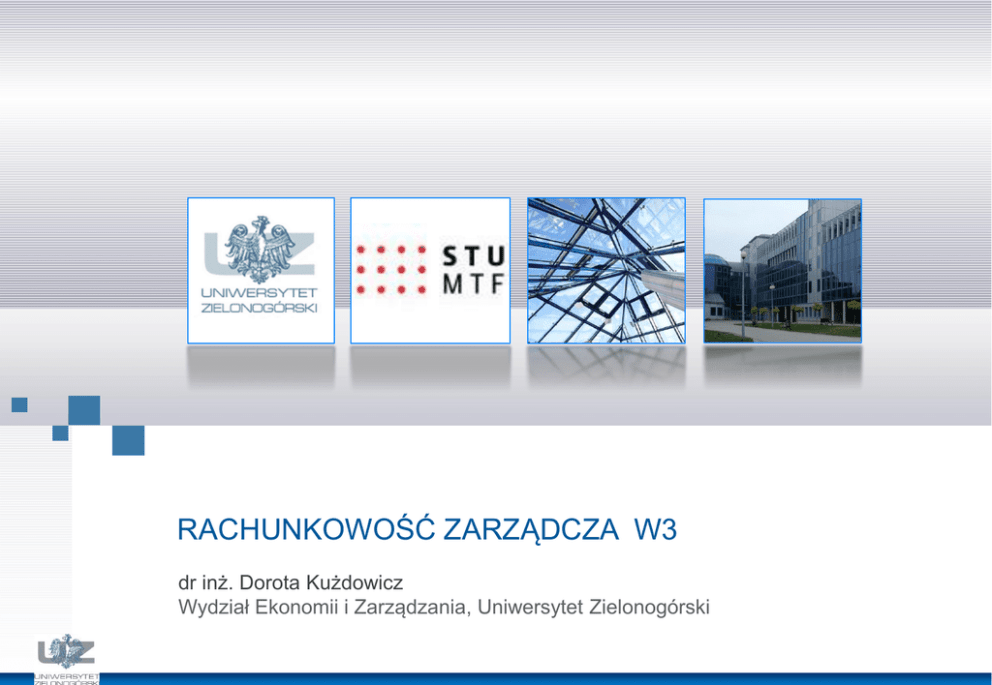 RACHUNKOWOŚĆ ZARZĄDCZA W3 dr inż. Dorota Kużdowicz Wydział Ekonomii i Zarządzania, Uniwersytet Zielonogórski STU, Faculty of Materials Science and Technology in Trnava Rachunki kosztów Rachunek kosztów pełnych Rachunek kosztów zmiennych Rachunki decyzyjne STU, Faculty of Materials Science and Technology in Trnava Rachunek kosztów pełnych (RKP) Rachunek kosztów pełnych (niem. Vollkostenrechnung) zakłada, że wszystkie koszty produkcyjne obciążają produkt., oznacza to, że na koszty wyrobu składają się nie tylko koszty bezpośrednie, ale także przypadające nań pośrednie koszty produkcyjne. Rachunek kosztów pełnych służy do wyceny produktu po technicznym koszcie wytworzenia. Wykorzystywany jest dla celów sprawozdawczych (rachunkowość finansowa). STU, Faculty of Materials Science and Technology in Trnava RKP – Wynik operacyjny Rachunek wyników przy zastosowaniu rachunku kosztów pełnych przedstawia się następująco: Przychody ze sprzedaży − Koszty wytworzenia wyrobów sprzedanych = Wynik brutto ze sprzedaży (marża pokrycia) − Koszty sprzedaży i ogólnego zarządu = Wynik operacyjny (wynik na sprzedaży) Rachunek kosztów pełnych spełnia swoje zadanie w przypadku pełnego wykorzystania zdolności produkcyjnych. STU, Faculty of Materials Science and Technology in Trnava RKP c.d. STU, Faculty of Materials Science and Technology in Trnava RKP - przykład STU, Faculty of Materials Science and Technology in Trnava Rachunek kosztów zmiennych (RKZ) Rachunek kosztów zmiennych (niem. Teilkostenrechnung, ang. Direct costing) – oparty jest na założeniu, ze tylko część kosztów wytwarzania zależy od wielkości produkcji, natomiast druga część tych kosztów od wielkości produkcji nie zależy. Stąd podział kosztów działalności operacyjnej na koszty zmienne i koszty stałe, przy czym: koszty zmienne zmieniają się proporcjonalnie do wielkości produkcji i przypisywane są bezpośrednio do obiektów kalkulacyjnych (produktów lub usług), koszty stałe traktowane są jako koszty okresu, tj. w całości przenoszone są na wynik finansowy. Rachunek kosztów zmiennych dostarcza informacji przydatnych w decyzjach krótkookresowych podejmowanych w warunkach niewykorzystanych zdolności produkcyjnych oraz przy występowaniu wahań popytu na rynku. STU, Faculty of Materials Science and Technology in Trnava Rachunek kosztów zmiennych c.d. STU, Faculty of Materials Science and Technology in Trnava RKZ - jednostopniowy rachunek marż pokrycia W rachunku kosztów zmiennych wyróżnia się dwa rodzaje rachunków wyników jednostopniowy rachunek marż pokrycia i wielostopniowy rachunek marż pokrycia (niem. Deckungsbeitragsrechnung). Rachunek wyników przy zastosowaniu rachunku kosztów zmiennych w jednostopniowym rachuneku marż pokrycia przedstawia się następująco: Przychody ze sprzedaży − Koszty zmienne wytworzenia wyrobów sprzedanych = Wynik brutto ze sprzedaży (marża pokrycia) − Koszty stałe wytworzenia wyrobów sprzedanych − Koszty sprzedaży i ogólnego zarządu = Wynik operacyjny (wynik na sprzedaży) STU, Faculty of Materials Science and Technology in Trnava RKZ - jednostopniowy rachunek marż pokrycia c.d. Marża pokrycia stanowi zatem nadwyżkę przychodu ze sprzedaży wyrobów nad kosztami zmiennym sprzedanych produktów. Jeżeli marża pokrycia jest wyższa niż koszty stałe przedsiębiorstwo osiąga zysk ze sprzedaży produktów. W rachunku tym zapasy zostają wycenione po zmiennym koszcie wytworzenia, zatem ustalony wynik na sprzedaży może się różnić od wyniku na sprzedaży ustalonego według rachunku kosztów pełnych. STU, Faculty of Materials Science and Technology in Trnava RKZ – wielostopniowy rachunek marż pokrycia STU, Faculty of Materials Science and Technology in Trnava RKZ - jednostopniowy rachunek marż pokrycia c.d. STU, Faculty of Materials Science and Technology in Trnava RKZ – wielostopniowy rachunek marż pokrycia c.d. Wielostopniowy rachunek marż pokrycia stosowany jest w przedsiębiorstwach charakteryzujących się dywersyfikacją działalności, tzn. poszerzeniem i pogłębieniem asortymentu. Odpowiada na pytanie, które elementy działalności przynoszą zysk, a które generują stratę. Te części przedsiębiorstwa, dla których można skalkulować wynik operacyjny nazywa się segmentami . Segmentami mogą być np.: rejony sprzedaży; rodzaje działalności; zakłady w ramach jednego przedsiębiorstwa; wydziały produkcyjne, gdy dany wydział (od początku do końca) produkuje i sprzedaje produkty; wydzielone ośrodki odpowiedzialności STU, Faculty of Materials Science and Technology in Trnava RKZ – wielostopniowy rachunek marż pokrycia c.d. Rachunek wyników przy zastosowaniu rachunku kosztów zmiennych w wielostopniowym rachunku marż pokrycia przedstawia się następująco: Przychody ze sprzedaży − Koszty zmienne wytworzenia wyrobów sprzedanych = Wynik brutto ze sprzedaży (marża pokrycia I) − Koszty stałe wytworzenia wyrobów sprzedanych = Marża pokrycia II − Koszty sprzedaży = Marża pokrycia III − Koszty ogólnego zarządu = Wynik operacyjny (wynik na sprzedaży) STU, Faculty of Materials Science and Technology in Trnava RKZ – wielostopniowy rachunek marż pokrycia c.d. - przykład STU, Faculty of Materials Science and Technology in Trnava RKZ – wielostopniowy rachunek marż pokrycia c.d. - przykład STU, Faculty of Materials Science and Technology in Trnava RKZ – wielostopniowy rachunek marż pokrycia c.d. - przykład STU, Faculty of Materials Science and Technology in Trnava RKZ – wielostopniowy rachunek marż pokrycia c.d. - przykład STU, Faculty of Materials Science and Technology in Trnava Rachunki decyzyjne Do podejmowania decyzji koszty poniesione w minionym okresie sprawozdawczym są ważne, lecz nie w pełni wystarczające ponieważ zewnętrzne i wewnętrzne warunki działalności przedsiębiorstwa ulegają szybkim zmianom. Dlatego też klasyfikac