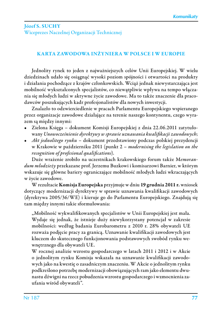 Komunikaty Józef S. SUCHY Wiceprezes Naczelnej Organizacji Technicznej KARTA ZAWODOWA INŻYNIERA W POLSCE I W EUROPIE Jednolity rynek to jeden z najważniejszych celów Unii Europejskiej. W wielu dziedzinach udało się osiągnąć wysoki poziom spójności i otwartości na produkty i działania pochodzące z krajów członkowskich. Wciąż jednak niewystarczająca jest mobilność wykształconych specjalistów, co niewątpliwie wpływa na tempo włączania się młodych ludzi w aktywne życie zawodowe. Ma to także znaczenie dla pracodawców poszukujących kadr profesjonalistów dla nowych inwestycji. Znalazło to odzwierciedlenie w pracach Parlamentu Europejskiego wspieranego przez organizacje zawodowe działające na terenie naszego kontynentu, czego wyrazem są między innymi: • Zielona Księga – dokument Komisji Europejskiej z dnia 22.06.2011 zatytułowany Unowocześnienie dyrektywy w sprawie uznawania kwalifikacji zawodowych; • Akt jednolitego rynku – dokument przedstawiony podczas polskiej prezydencji w Krakowie w październiku 2011 (punkt 2 – modernising the legislation on the recognition of profesional qualifications). Duże wrażenie zrobiło na uczestnikach krakowskiego forum także Memorandum młodzieży przekazane prof. Jerzemu Buzkowi i komisarzowi Barnier, w którym wskazuje się główne bariery ograniczające mobilność młodych ludzi wkraczających w życie zawodowe. W rezultacie Komisja Europejska przyjmuje w dniu 19 grudnia 2011 r. wniosek dotyczący modernizacji dyrektywy w sprawie uznawania kwalifikacji zawodowych (dyrektywa 2005/36/WE) i kieruje go do Parlamentu Europejskiego. Znajdują się tam między innymi takie sformułowania: „Mobilność wykwalifikowanych specjalistów w Unii Europejskiej jest mała. Wydaje się jednak, że istnieje duży niewykorzystany potencjał w zakresie mobilności: według badania Eurobarometru z 2010 r. 28% obywateli UE rozważa podjęcie pracy za granicą. Uznawanie kwalifikacji zawodowych jest kluczem do skutecznego funkcjonowania podstawowych swobód rynku wewnętrznego dla obywateli UE. W rocznej analizie wzrostu gospodarczego w latach 2011 i 2012 i w Akcie o jednolitym rynku Komisja wskazała na uznawanie kwalifikacji zawodowych jako na kwestię o zasadniczym znaczeniu. W Akcie o jednolitym rynku podkreślono potrzebę modernizacji obowiązujących ram jako elementu dwunastu dźwigni na rzecz pobudzenia wzrostu gospodarczego i wzmocnienia zaufania wśród obywateli”. Nr 187 77 Komunikaty W środowisku inżynierów sprawa ta spotkała się z bardzo pozytywnym przyjęciem. Rolę reprezentanta profesjonalistów o wykształceniu technicznym i koordynatora prac związanych z wdrożeniem wspomnianej dyrektywy, objęła europejska federacja narodowych organizacji inżynierskich FEANI. Organizacja ta, o dużym prestiżu w Polsce i innych krajach europejskich dba także o standardy kształcenia na uczelniach technicznych. Warto dodać, że wszystkie polskie uczelnie techniczne były akredytowane przez FEANI, a wymogi co do standardów kształcenia, a także praktyk przemysłowych dla studentów są uznawane przez państwową komisję akredytacyjną (obecnie Polska Komisja Akredytacyjna). Pośrednikiem w tym procesie akredytacyjnym była Naczelna Organizacja Techniczna, reprezentant Polski w FEANI. Na rys. 1. pokazano organizacje członkowskie FEANI (www.feani.org). Rys. 1. Organizacje członkowskie FEANI i zasięg oddziaływania tej organizacji 78 Komunikaty Postanowiono więc wdrożyć w strefie oddziaływania FEANI jednolity dokument w postaci legitymacji zawodowej, zawierającej podstawowe informacje o kompetencjach inżyniera. Informacje te, potwierdzone przez kompetentne gremia w krajach członkowskich, byłyby przechowywane także w krajowych i w centralnej bazie danych. W tym przedsięwzięciu ze strony polskiej uczestniczy Federacja Stowarzyszeń Naukowo-Technicznych Naczelna Organizacja Techniczna, która jest jednym z członków założycieli naszej europejskiej reprezentacji. Podczas walnego zebrania FEANI w dniu 4 października 2012 w Rzymie podpisano umowę między FEANI i pierwszymi dziesięcioma organizacjami narodowymi, w tym z FSNT NOT, określającą warunki i zasady wdrożenia legitymacji zawodowych dla inżynierów w tych krajach. Rys. 2. Przedstawiciele pierwszych organizacji inżynierskich podpisujących umowę na temat wdrożenia karty zawodowej inżyniera W umowie tej mówi się, że „Unia Europejska ma na celu usunięcie istniejących barier wymiany stanowisk pracy pomiędzy indywidualnymi Krajami Członkowskimi i promowanie mobilności zawodowej. Pod tym względem procedura uznawalności zawodowych kwalifikacji inżynierskich w szczególności musi być znacząco przyspieszona i uproszczona. Karta Inżynierska, zawodowa karta dla inżynierów, ma znaczący udział w tym zakresie. Dokumentuje ona edukacyjne i zawodowe kwalifikacje nabyte zgodnie z uznawanymi na poziomie międzynarodowym standardami. W ten sposób poprawia ona przejrzystość na europejskim rynku pracy inżynierów i czyni łatwiejszym dla firm znalezienie odpowiednich specjalistów za granicą. Odnośny Narodowy Partner FEANI jest odpowiedzialny za wydanie Karty Inżynierskiej w (nazwa właściwego kraju) i rozpatrzenie wszystkich wniosków od kandydatów zamieszkałych w jego kraju. W tym celu zostanie ustanowiony Narodowy Komitet Rejestracyjny, który będzie udzielał rekomendacji, jak również przyjmował wnioski”. Nr 187 79 Komunikaty Zgodnie z tymi postanowieniami Zarząd Główny FSNT NOT powołał Narodowy Komitet Rejestracyjny ds. Zawodowej Karty Inżyniera, w którego skład weszli przedstawiciele stowarzyszeń naukowo-technicznych, Polskiej Akademii Nauk, uczelni technicznych i oczywiście NOT. Wszystkie prace proceduralne realizowane są w oparciu o wspomnianą umowę oraz szczegółowy podręcznik opracowany przez FEANI. Do realizacji technicznej strony przedsięwzięcia wybrano partnera o najwyższych kompetencj