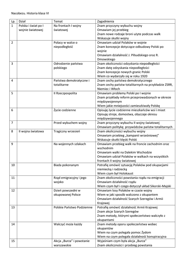 Nacobezu. Historia klasa VI Lp. Dział 1 Polska i świat po I wojnie światowej Temat Na frontach I wojny światowej 2 Polacy w walce o niepodległośd 3 Odrodzenie paostwa polskiego 4 Paostwa demokratyczne i totalitarne 5 II Rzeczpospolita 6 Życie codzienne 7 Przed wybuchem wojny 8 II wojna światowa Tragiczny wrzesieo 9 Na wojennych szlakach 10 Biada pokonanym 11 Rząd emigracyjny i jego wojsko 12 Dzieo powszedni w okupowanej Polsce 13 Polskie Paostwo Podziemne 14 Walczyd może każdy 15 Akcja „Burza” i powstanie warszawskie Zagadnienia Znam przyczyny wybuchu wojny Omawiam jej przebieg Znam nowe rodzaje broni użyte podczas walk Wskazuje skutki wojny Omawiam udział Polaków w wojnie Znam koncepcje dotyczące odbudowy Polski po wojnie Omawiam działalnośd J. Piłsudskiego oraz R. Dmowskiego Znam okoliczności odzyskania niepodległości Znam datę odzyskania niepodległości Znam koncepcje nowych granic Polski Wiem co wydarzyło się w roku 1920 Znam cechy paostwa demokratycznego Znam cechy paostw totalitarnych na przykładzie ZSRR, Niemiec i Włoch Omawiam problemy Polski po I wojnie Znam przykłady reform przeprowadzonych w okresie międzywojennym Wiem jakie mniejszości zamieszkiwały Polskę Opisuję życie codzienne mieszkaoców wsi i miast Opisuję stroje, domostwa, obyczaje okresu międzywojennego Znam przyczyny wybuchu II wojny światowej Omawiam politykę przywódców paostw totalitarnych Znam okoliczności wybuchu wojny Omawiam przebieg „kampanii wrześniowej” Wskazuje skutki klęski Polski Omawiam przebieg walk na froncie zachodnim oraz wschodnim Omawiam walki na Dalekim Wschodzie Omawiam udział Polaków w walkach na wszystkich frontach II wojny światowej Potrafię omówid sytuację Polaków pod okupacjami niemiecką i radziecką Wiem czym był Holokaust Znam okoliczności powstania rządu na emigracji Omawiam działalnośd rządu Wiem czym był i czego dotyczył układ Sikorski-Majski Omawiam losy Polaków w czasie wojny Wiem w jaki sposób walczono z okupantem Omawiam działalnośd Szarych Szeregów i Armii Krajowej Potrafię omówid działalnośd Armii Krajowej Znam akcje Szarych Szeregów Znam metody, którymi społeczeostwo walczyło z okupantami Znam metody oporu społeczeostwa wobec okupantów Wiem na czym polegała pomoc Żydom Wiem na czym polegała działalnośd konspiracyjna Wyjaśniam czym była akcja „Burza” Znam okoliczności i przebieg powstania 16 17 Gorzki smak zwycięstwa Polska i świat po II wojnie światowej Świat po wojnie 18 Przemiany gospodarcze i polityczne w Polsce po II wojnie światowej 19 Polska Rzeczpospolita Ludowa 20 Walka o demokrację 21 Życie codzienne młodzieży 22 Powstanie III Rzeczypospolitej 23 Społeczeostwo współczesne Jak zbudowane jest społeczeostwo? 24 Struktura społeczeostwa polskiego 25 Najważniejsze problemy społeczeostwa polskiego 26 Konflikty społeczne i sposoby ich rozwiązywania 27 Mniejszości narodowe i etniczne w Polsce 28 Polska współczesna Polska regionów warszawskiego Wskazuje skutki powstania Potrafię ocenid powstanie warszawskie Znam skutki wojny dla Polaków Omawiam okoliczności przejęcia władzy przez komunistów Znam metody jakie stosowały nowa władza na zajętych terenach Znam skutki wojny Wiem czym była Zimna Wojna Wiem jak wyglądał podział świata po II wojnie światowej Omawiam działalnośd ONZ, Nato oraz Układu Warszawskiego Wiem jak zmieniły się granice Polski Znam reformy gospodarcze przeprowadzone w Polsce po wojnie Wiem na czym polegały rządy komunistyczne w Polsce Wiem czym była PRL Omawiam charakter rządów komunistycznych w Polsce Wiem czym były PGRy Omawiam reformy przeprowadzone w Polsce po 1945 roku Wskazuję przyczyny wystąpieo Polaków w latach 1956, 1968, 1970, 1976. Omawiam przebieg strajków i ich konsekwencje Opisuję życie codzienne, zajęcia, szkołę, rozrywki młodzieży z okresu PRL Wiem co stało się w roku 1989 Znam przyczyny przemian które zaszły po 1989 roku Wiem czym był Okrągły Stół Znam reformy w Polsce po 1989 roku Wiem czym jest społeczeostwo Znam problemy społeczne Wymieniam grupy społeczne Omawiam grupy społeczne Wiem czym są klasy społeczne Omawiam strukturę zawodową społeczeostwa polskiego Znam problemy społeczne jak: narkomanię, alkoholizm, przemoc itp. Potrafię zaproponowad rozwiązanie omawianych problemów społecznych Znam przyczyny konfliktów społecznych Podaje przykładowe konflikty Potrafię zaproponowad sposoby rozwiązania konfliktów Wyjaśniam czym są: mniejszości narodowe oraz etniczne Znam przykładowe mniejsi Omawiam problemy mniejszości w Polsce Znam podział administracyjny kraju Wymieniam zabytki różnych regionów kraju Omawiam różnice w rozwoju poszczególnych części kraju 29 Czym jest demokracja? 30 Kto rządzi w Rzeczpospolitej Polskiej 31 Rzeczpospolita samorządna 32 Bądźmy aktywni 33 Dzieci też mają prawa 34 Świat współczesny Rewolucja naukowotechniczna 35 Na podbój kosmosu 36 Społeczeostwo informacyjne 37 Budujemy wspólną Europę 38 Problemy współczesnego świata 39 Współczesne konflikty zbrojne Znam charakterystyczne cechy regionów Polski Znam cechy demokracji Omawiam rozwój demokracji Wskazuje zalety i wady ustroju demokratycznego Znam władze ustawodawczą wykonawczą i sądowniczą Omawiam zadania poszczególnych władz Wiem czym jest samorząd Znam zadania różnych samorządów Wiem czym są gmina, powiat i województwo Wiem kto sprawuje w nich władzę Znam organizacje społeczne Omawiam działalnośd organizacji charytatywnych Wiem czym jest społeczeostwo obywatelskie Znam prawa dzieci Znam dokumenty, w których prawa zostały spisane Wskazuje przykłady łamania praw dzieci Wiem, do kogo się zwrócid, gdy łamane są moje prawa Wiem na czym polega rewolucja naukowo techniczna Omawiam największe ostatnie osiągnięcia człowieka Wskazuje zalety i wady postępu technologicznego Znam historię lotów w kosmos Omawiam rywalizację pomiędzy USA i 