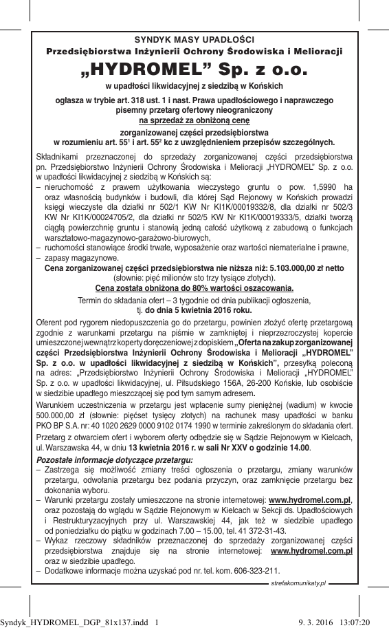 SYNDYK MASY UPADŁOŚCI Przedsiębiorstwa Inżynierii Ochrony Środowiska i Melioracji „HYDROMEL” Sp. z o.o. w upadłości likwidacyjnej z siedzibą w Końskich ogłasza w trybie art. 318 ust. 1 i nast. Prawa upadłościowego i naprawczego pisemny przetarg ofertowy nieograniczony na sprzedaż za obniżoną cenę zorganizowanej części przedsiębiorstwa 1 w rozumieniu art. 55 i art. 552 kc z uwzględnieniem przepisów szczególnych. Składnikami przeznaczonej do sprzedaży zorganizowanej części przedsiębiorstwa pn. Przedsiębiorstwo Inżynierii Ochrony Środowiska i Melioracji „HYDROMEL” Sp. z o.o. w upadłości likwidacyjnej z siedzibą w Końskich są: – nieruchomość z prawem użytkowania wieczystego gruntu o pow. 1,5990 ha oraz własnością budynków i budowli, dla której Sąd Rejonowy w Końskich prowadzi księgi wieczyste dla działki nr 502/1 KW Nr KI1K/00019332/8, dla działki nr 502/3 KW Nr KI1K/00024705/2, dla działki nr 502/5 KW Nr KI1K/00019333/5, działki tworzą ciągłą powierzchnię gruntu i stanowią jedną całość użytkową z zabudową o funkcjach warsztatowo-magazynowo-garażowo-biurowych, – ruchomości stanowiące środki trwałe, wyposażenie oraz wartości niematerialne i prawne, – zapasy magazynowe. Cena zorganizowanej części przedsiębiorstwa nie niższa niż: 5.103.000,00 zł netto (słownie: pięć milionów sto trzy tysiące złotych). Cena została obniżona do 80% wartości oszacowania. Termin do składania ofert – 3 tygodnie od dnia publikacji ogłoszenia, tj. do dnia 5 kwietnia 2016 roku. Oferent pod rygorem niedopuszczenia go do przetargu, powinien złożyć ofertę przetargową zgodnie z warunkami przetargu na piśmie w zamkniętej i nieprzezroczystej kopercie umieszczonej wewnątrz koperty doręczeniowej z dopiskiem „Oferta na zakup zorganizowanej części Przedsiębiorstwa Inżynierii Ochrony Środowiska i Melioracji „HYDROMEL” Sp. z o.o. w upadłości likwidacyjnej z siedzibą w Końskich”, przesyłką poleconą na adres: „Przedsiębiorstwo Inżynierii Ochrony Środowiska i Melioracji „HYDROMEL” Sp. z o.o. w upadłości likwidacyjnej, ul. Piłsudskiego 156A, 26-200 Końskie, lub osobiście w siedzibie upadłego mieszczącej się pod tym samym adresem. Warunkiem uczestniczenia w przetargu jest wpłacenie sumy pieniężnej (wadium) w kwocie 500.000,00 zł (słownie: pięćset tysięcy złotych) na rachunek masy upadłości w banku PKO BP S.A. nr: 40 1020 2629 0000 9102 0174 1990 w terminie zakreślonym do składania ofert. Przetarg z otwarciem ofert i wyborem oferty odbędzie się w Sądzie Rejonowym w Kielcach, ul. Warszawska 44, w dniu 13 kwietnia 2016 r. w sali Nr XXV o godzinie 14.00. Pozostałe informacje dotyczące przetargu: – Zastrzega się możliwość zmiany treści ogłoszenia o przetargu, zmiany warunków przetargu, odwołania przetargu bez podania przyczyn, oraz zamknięcie przetargu bez dokonania wyboru. – Warunki przetargu zostały umieszczone na stronie internetowej: www.hydromel.com.pl, oraz pozostają do wglądu w Sądzie Rejonowym w Kielcach w Sekcji ds. Upadłościowych i Restrukturyzacyjnych przy ul. Warszawskiej 44, jak też w siedzibie upadłego od poniedziałku do piątku w godzinach 7.00 – 15.00, tel. 41 372-31-43. – Wykaz rzeczowy składników przeznaczonej do sprzedaży zorganizowanej części przedsiębiorstwa znajduje się na stronie internetowej: www.hydromel.com.pl oraz w siedzibie upadłego. – Dodatkowe informacje można uzyskać pod nr. tel. kom. 606-323-211. Syndyk_HYDROMEL_DGP_81x137.indd 1 strefakomunikaty.pl 9. 3. 2016 13:07:20