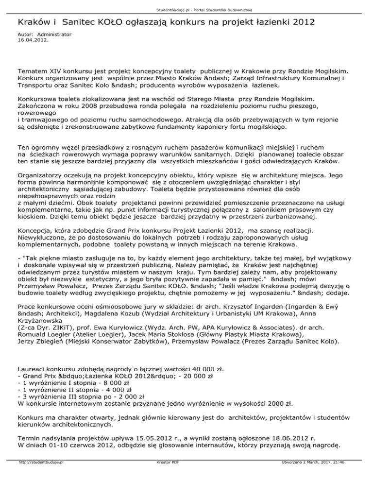 StudentBuduje.pl - Portal Studentów Budownictwa Kraków i Sanitec KOŁO ogłaszają konkurs na projekt łazienki 2012 Autor: Administrator 16.04.2012. Tematem XIV konkursu jest projekt koncepcyjny toalety publicznej w Krakowie przy Rondzie Mogilskim. Konkurs organizowany jest wspólnie przez Miasto Kraków – Zarząd Infrastruktury Komunalnej i Transportu oraz Sanitec Koło – producenta wyrobów wyposażenia łazienek. Konkursowa toaleta zlokalizowana jest na wschód od Starego Miasta przy Rondzie Mogilskim. Zakończona w roku 2008 przebudowa ronda polegała na rozdzieleniu poziomu ruchu pieszego, rowerowego i tramwajowego od poziomu ruchu samochodowego. Atrakcją dla osób przebywających w tym rejonie są odsłonięte i zrekonstruowane zabytkowe fundamenty kaponiery fortu mogilskiego. Ten ogromny węzeł przesiadkowy z rosnącym ruchem pasażerów komunikacji miejskiej i ruchem na ścieżkach rowerowych wymaga poprawy warunków sanitarnych. Dzięki planowanej toalecie obszar ten stanie się jeszcze bardziej przyjazny dla wszystkich mieszkańców i gości odwiedzających Kraków. Organizatorzy oczekują na projekt koncepcyjny obiektu, który wpisze się w architekturę miejsca. Jego forma powinna harmonijnie komponować się z otoczeniem uwzględniając charakter i styl architektoniczny sąsiadującej zabudowy. Toaleta będzie przystosowana również dla osób niepełnosprawnych oraz rodzin z małymi dziećmi. Obok toalety projektanci powinni przewidzieć pomieszczenie przeznaczone na usługi komplementarne, takie jak np. punkt informacji turystycznej połączony z salonikiem prasowym czy kioskiem. Dzięki temu obiekt będzie jeszcze bardziej przydatny w przestrzeni zurbanizowanej. Koncepcja, która zdobędzie Grand Prix konkursu Projekt Łazienki 2012, ma szansę realizacji. Niewykluczone, że po dostosowaniu do lokalnych potrzeb i rodzaju zaproponowanych usług komplementarnych, podobne toalety powstaną w innych miejscach na terenie Krakowa. - "Tak piękne miasto zasługuje na to, by każdy element jego architektury, także tej małej, był wyjątkowy i doskonale wpisywał się w przestrzeń publiczną. Należy pamiętać, że Kraków jest najchętniej odwiedzanym przez turystów miastem w naszym kraju. Tym bardziej zależy nam, aby projektowany obiekt był niezwykle estetyczny, a jego bryła pozytywnie zapadała w pamięć." – mówi Przemysław Powalacz, Prezes Zarządu Sanitec KOŁO. – "Jeśli władze Krakowa podejmą decyzję o budowie toalety według zwycięskiego projektu, chętnie pomożemy w jej wyposażeniu." – dodaje. Prace konkursowe oceni ośmioosobowe jury w składzie: dr arch. Krzysztof Ingarden (Ingarden & Ewý – Architekci), Magdalena Kozub (Wydział Architektury i Urbanistyki UM Krakowa), Anna Krzyżanowska (Z-ca Dyr. ZIKiT), prof. Ewa Kuryłowicz (Wydz. Arch. PW, APA Kuryłowicz & Associates). dr arch. Romuald Loegler (Atelier Loegler), Jacek Maria Stokłosa (Główny Plastyk Miasta Krakowa), Jerzy Zbiegień (Miejski Konserwator Zabytków), Przemysław Powalacz (Prezes Zarządu Sanitec Koło). Laureaci konkursu zdobędą nagrody o łącznej wartości 40 000 zł. - Grand Prix „Łazienka KOŁO 2012” - 20 000 zł - 1 wyróżnienie I stopnia - 8 000 zł - 1 wyróżnienie II stopnia - 4 000 zł - 3 wyróżnienia III stopnia po - 2 000 zł W konkursie internetowym zostanie przyznane jedno wyróżnienie w wysokości 2000 zł. Konkurs ma charakter otwarty, jednak głównie kierowany jest do architektów, projektantów i studentów kierunków architektonicznych. Termin nadsyłania projektów upływa 15.05.2012 r., a wyniki zostaną ogłoszone 18.06.2012 r. W dniach 01-10 czerwca 2012, odbędzie się głosowanie internautów, którzy przyznają swoją nagrodę. http://studentbuduje.pl Kreator PDF Utworzono 2 March, 2017, 21:46 StudentBuduje.pl - Portal Studentów Budownictwa Regulamin i wszelkie informacje o konkursie znajdują się na stronie: www.konkurskolo.com.pl O konkursie Konkurs Sanitec KOŁO na projekt koncepcyjny toalety publicznej jest istotnym stymulatorem rozwoju firmy i jedną z bardziej rozpoznawalnych inicjatyw społecznych w Polsce. Tematami przewodnimi konkursu są projekty sanitariatów w miejscach często odwiedzanych przez turystów i gości. Obiekty wpisują się w realne warunki miast i regionów, a wybór lokalizacji jest niezmiernie ważny z perspektywy szerokiej grupy społecznej. W ostatnich latach tematy konkursu związane były z miejscami o szczególnym potencjale turystycznym lub krajobrazowym m.in.: Kazimierz Dolny, Tatrzański Park Narodowy, teren nad Wisłą w Warszawie oraz ulica Piotrkowska w Łodzi. Zakończono remont dwóch toalet konkursowych na Dworcu Centralnym w Warszawie, trwa realizacja sanitariatu w Kazimierzu Dolnym (zakończenie w maju 2012), a inwestycja obok Stadionu Narodowego nad Wisłą jest w trakcie przygotowania. http://studentbuduje.pl Kreator PDF Utworzono 2 March, 2017, 21:46