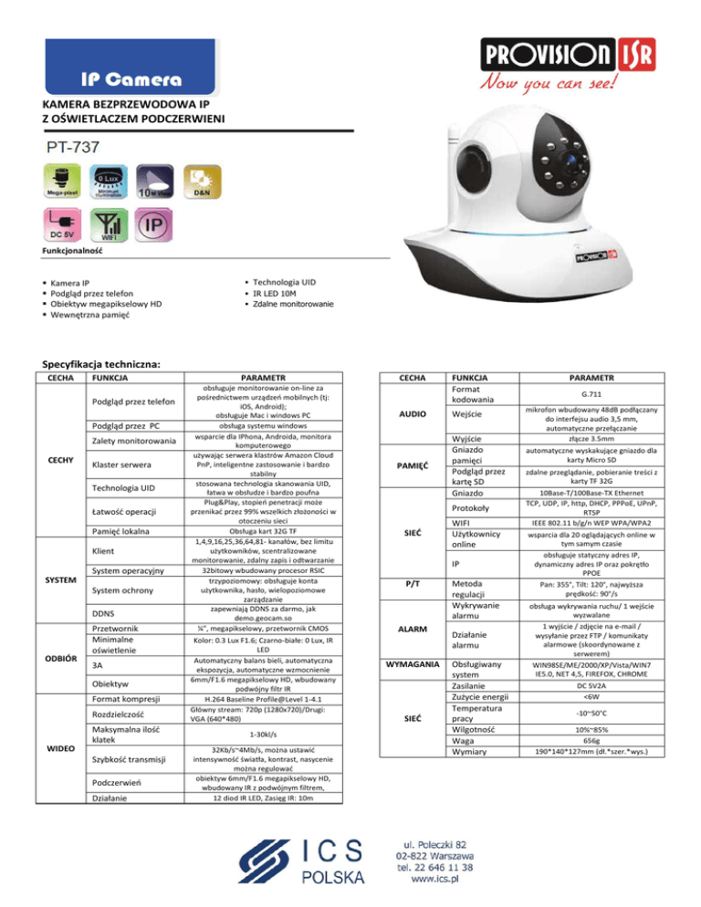 KAMERA BEZPRZEWODOWA IP Z OŚWIETLACZEM PODCZERWIENI Funkcjonalność Kamera IP Podgląd przez telefon Obiektyw megapikselowy HD Wewnętrzna pamięć Technologia UID IR LED 10M Zdalne monitorowanie Specyfikacja techniczna: CECHA FUNKCJA Podgląd przez telefon Podgląd przez PC Zalety monitorowania CECHY Klaster serwera Technologia UID Łatwość operacji Pamięć lokalna Klient System operacyjny SYSTEM System ochrony DDNS ODBIÓR Przetwornik Minimalne oświetlenie 3A Obiektyw Format kompresji Rozdzielczość Maksymalna ilość klatek WIDEO Szybkość transmisji Podczerwień Działanie PARAMETR obsługuje monitorowanie on-line za pośrednictwem urządzeń mobilnych (tj: iOS, Android); obsługuje Mac i windows PC obsługa systemu windows wsparcie dla IPhona, Androida, monitora komputerowego używając serwera klastrów Amazon Cloud PnP, inteligentne zastosowanie i bardzo stabilny stosowana technologia skanowania UID, łatwa w obsłudze i bardzo poufna Plug&Play, stopień penetracji może przenikać przez 99% wszelkich złożoności w otoczeniu sieci Obsługa kart 32G TF 1,4,9,16,25,36,64,81- kanałów, bez limitu użytkowników, scentralizowane monitorowanie, zdalny zapis i odtwarzanie 32bitowy wbudowany procesor RSIC trzypoziomowy: obsługuje konta użytkownika, hasło, wielopoziomowe zarządzanie zapewniają DDNS za darmo, jak demo.geocam.so ¼”, megapikselowy, przetwornik CMOS Kolor: 0.3 Lux F1.6; Czarno-białe: 0 Lux, IR LED Automatyczny balans bieli, automatyczna ekspozycja, automatyczne wzmocnienie 6mm/F1.6 megapikselowy HD, wbudowany podwójny filtr IR H.264 Baseline Profile@Level 1-4.1 Główny stream: 720p (1280x720)/Drugi: VGA (640*480) 1-30kl/s 32Kb/s~4Mb/s, można ustawić intensywność światła, kontrast, nasycenie można regulować obiektyw 6mm/F1.6 megapikselowy HD, wbudowany IR z podwójnym filtrem, 12 diod IR LED, Zasięg IR: 10m CECHA FUNKCJA Format kodowania AUDIO Wejście PAMIĘĆ Wyjście Gniazdo pamięci Podgląd przez kartę SD Gniazdo Protokoły SIEĆ WIFI Użytkownicy online IP P/T ALARM WYMAGANIA SIEĆ Metoda regulacji Wykrywanie alarmu Działanie alarmu Obsługiwany system Zasilanie Zużycie energii Temperatura pracy Wilgotność Waga Wymiary PARAMETR G.711 mikrofon wbudowany 48dB podłączany do interfejsu audio 3,5 mm, automatyczne przełączanie złącze 3.5mm automatyczne wyskakujące gniazdo dla karty Micro SD zdalne przeglądanie, pobieranie treści z karty TF 32G 10Base-T/100Base-TX Ethernet TCP, UDP, IP, http, DHCP, PPPoE, UPnP, RTSP IEEE 802.11 b/g/n WEP WPA/WPA2 wsparcia dla 20 oglądających online w tym samym czasie obsługuje statyczny adres IP, dynamiczny adres IP oraz pokrętło PPOE Pan: 355°, Tilt: 120°, najwyższa prędkość: 90°/s obsługa wykrywania ruchu/ 1 wejście wyzwalane 1 wyjście / zdjęcie na e-mail / wysyłanie przez FTP / komunikaty alarmowe (skoordynowane z serwerem) WIN98SE/ME/2000/XP/Vista/WIN7 IE5.0, NET 4,5, FIREFOX, CHROME DC 5V2A <6W -10~50°C 10%~85% 656g 190*140*127mm (dł.*szer.*wys.)