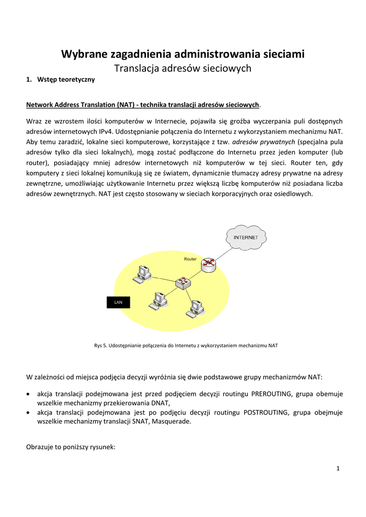 Wybrane zagadnienia administrowania sieciami Translacja adresów sieciowych 1. Wstęp teoretyczny Network Address Translation (NAT) - technika translacji adresów sieciowych. Wraz ze wzrostem ilości komputerów w Internecie, pojawiła się groźba wyczerpania puli dostępnych adresów internetowych IPv4. Udostępnianie połączenia do Internetu z wykorzystaniem mechanizmu NAT. Aby temu zaradzić, lokalne sieci komputerowe, korzystające z tzw. adresów prywatnych (specjalna pula adresów tylko dla sieci lokalnych), mogą zostać podłączone do Internetu przez jeden komputer (lub router), posiadający mniej adresów internetowych niż komputerów w tej sieci. Router ten, gdy komputery z sieci lokalnej komunikują się ze światem, dynamicznie tłumaczy adresy prywatne na adresy zewnętrzne, umożliwiając użytkowanie Internetu przez większą liczbę komputerów niż posiadana liczba adresów zewnętrznych. NAT jest często stosowany w sieciach korporacyjnych oraz osiedlowych. Rys 5. Udostępnianie połączenia do Internetu z wykorzystaniem mechanizmu NAT W zależności od miejsca podjęcia decyzji wyróżnia się dwie podstawowe grupy mechanizmów NAT: akcja translacji podejmowana jest przed podjęciem decyzji routingu PREROUTING, grupa obemuje wszelkie mechanizmy przekierowania DNAT, akcja translacji podejmowana jest po podjęciu decyzji routingu POSTROUTING, grupa obejmuje wszelkie mechanizmy translacji SNAT, Masquerade. Obrazuje to poniższy rysunek: 1 Rys 6. Klasyfikacja mechanizmów NAT Source Network Address Translation (SNAT) jest techniką polegającą na zmianie adresu źródłowego pakietu IP na inny. Stosowana jest często w przypadku podłączenia sieci dysponującej adresami prywatnymi do sieci Internet. Wówczas router, przez którego podłączono sieć, podmienia adres źródłowy prywatny na adres publiczny (najczęściej swój własny). Szczególnym przypadkiem SNAT jest maskarada (Masquerade) mająca miejsce, gdy router ma zmienny adres IP (np. otrzymuje go w przypadku połączenia modemowego wdzwanianego). Wówczas router zmienia adres źródłowy na taki, jak adres interfejsu, przez który pakiet opuszcza router. Rys 7. Funkcjonowanie mechanizmu SNAT Destination Network Address Translation (DNAT) jest techniką polegającą na zmianie adresu docelowego pakietu IP na jakiś inny. Stosowana jest często w przypadku, gdy serwer mający być dostępny z Internetu ma tylko adres prywatny. W tym przypadku router dokonuje translacji adresu docelowego pakietów IP z Internetu na adres tego serwera. 2 Rys 8. Funkcjonowanie mechanizmu DNAT Następstwem korzystania z mechanizmów NAT są: większe bezpieczeństwo komputerów znajdujących się za NAT-em, problematyka uruchomienia zewnętrznie dostępnych serwisów na komputerach w sieci wewnętrznej - konieczność stosowania mechanizmów przekierowywania portów. Source NAT, Masquerade Zarządzanie regułami filtracji, translacji i modyfikacji pakietów w systemie Linux można zrealizować za pomocą mechanizmu iptables. Praca programu opiera się na trzech podstawowych tablicach gromadzących odpowiednie reguły: filter tablica filtracji i reguł firewalla, nat - tablica translacji (wykorzystywana w ramach omawianych zagadnień) oraz mangle - tablica zawierająca reguły modyfikacji zawartości pakietów. Tworzenie reguł odbywa się w sposób bardzo prosty i zaczyna się od wyboru mechanizmu, jakim będziemy się posługiwali (PRE- oraz POSTROUTING) oraz tabeli, do której będziemy dodawali reguły (nat). Kolejnym krokiem jest zdefiniowanie akcji, która ma być podejmowana oraz adresów oraz ewentualnych filtrów, których ma dotyczyć. Składnia polecenia iptables przedstawia się następująco: iptables -L - polecenie listuje wszystkie zdefiniowane reguły, iptables -t [tablica] ... - polecenie wykonuje odpowiednie akcje na konkretnej tablicy, przykładowo: iptables -t nat -L - listuje wszystkie reguły utworzone dla tabeli nat, iptables -i | -o [nazwa interfejsu] ... - polecenie dotyczy odpowiedniego interfejsu wychodzącego (-o) bądź wchodzącego (-i), nazwy interfejsów, zgodnie z konwencją Linuxową rozpoczynają się od deskryptora eth oraz numeru karty począwszy od 0, iptables -t nat -A [nazwa łańcucha] - skojarzenie reguł z odpowiednim łańcuchem (PREROUTING bądź POSTROUTING), 3 iptables -s | -d [adres IP] ... - zakres polecenia jest ograniczany do konkretnych adresów źródła (-s) bądź celu (-d), iptables -p [protokół] ... - zakres polecenia ograniczony do konkretnego protokołu, iptables -p tcp | udp -sport | -dport [numer portu] - reguła dotycząca konkretnego portu źródłowego (sport) bądź docelowego (-dport) w ramach protokołów tcp lub udp, iptables ...-j MASQUERADE - skojarzenie z regułą akcji maskowania, iptables ...-j SNAT -to [adres IP] - skojarzenie z regułą akcji SNAT na konkretny adres IP bądź zakres adresów IP, iptables -t [nazwa tablicy] -f - wyczyszczenie wszystkich reguł z konkretnej tablicy (w przypadku braku argumentu -t - wyczyszczenie wszystkich reguł, iptables -t [nazwa tablicy] -X [numer reguły] - usunięcie reguły o konkretnym numerze z podanej tablicy reguł, iptables-save > [nazwa pliku] - utworzenie kopii reguł w zewnętrznym pliku, iptables-restore < [nazwa pliku] - przywrócenie kopii reguł z zewnętrznego pliku. 4