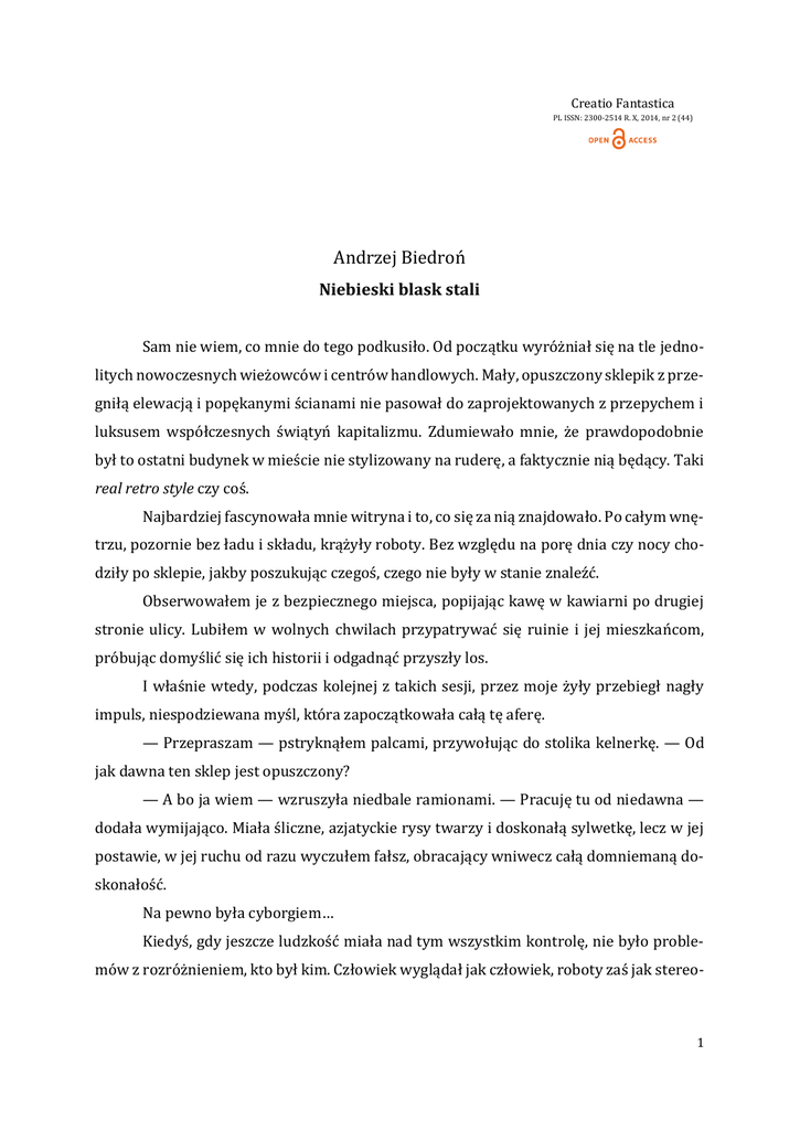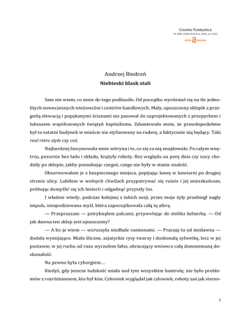 Creatio Fantastica PL ISSN: 2300-2514 R. X, 2014, nr 2 (44) Andrzej Biedroń Niebieski blask stali Sam nie wiem, co mnie do tego podkusiło. Od początku wyróżniał się na tle jednolitych nowoczesnych wieżowców i centrów handlowych. Mały, opuszczony sklepik z przegniłą elewacją i popękanymi ścianami nie pasował do zaprojektowanych z przepychem i luksusem współczesnych świątyń kapitalizmu. Zdumiewało mnie, że prawdopodobnie był to ostatni budynek w mieście nie stylizowany na ruderę, a faktycznie nią będący. Taki real retro style czy coś. Najbardziej fascynowała mnie witryna i to, co się za nią znajdowało. Po całym wnętrzu, pozornie bez ładu i składu, krążyły roboty. Bez względu na porę dnia czy nocy chodziły po sklepie, jakby poszukując czegoś, czego nie były w stanie znaleźć. Obserwowałem je z bezpiecznego miejsca, popijając kawę w kawiarni po drugiej stronie ulicy. Lubiłem w wolnych chwilach przypatrywać się ruinie i jej mieszkańcom, próbując domyślić się ich historii i odgadnąć przyszły los. I właśnie wtedy, podczas kolejnej z takich sesji, przez moje żyły przebiegł nagły impuls, niespodziewana myśl, która zapoczątkowała całą tę aferę. — Przepraszam — pstryknąłem palcami, przywołując do stolika kelnerkę. — Od jak dawna ten sklep jest opuszczony? — A bo ja wiem — wzruszyła niedbale ramionami. — Pracuję tu od niedawna — dodała wymijająco. Miała śliczne, azjatyckie rysy twarzy i doskonałą sylwetkę, lecz w jej postawie, w jej ruchu od razu wyczułem fałsz, obracający wniwecz całą domniemaną doskonałość. Na pewno była cyborgiem… Kiedyś, gdy jeszcze ludzkość miała nad tym wszystkim kontrolę, nie było problemów z rozróżnieniem, kto był kim. Człowiek wyglądał jak człowiek, roboty zaś jak stereo- 1 typowe blaszane puszki, jakich pełno bywało w sztampowych filmach s.f. zeszłego stulecia. A potem przyszła pierwsza cyberrewolucja, po niej druga… Po każdej z nich wzrastała tolerancja społeczeństwa na ilość mechanizmów, które człowiek mógł sobie zamontować, by według „niezależnych etycznie norm” pozostać starym dobrym homo sapiens. Aż w końcu nadeszły czasy obecne, gdzie każdy ma idealną twarz, idealną sylwetkę, a nikt nie zastanawia się, jaka część tych ideałów ma jeszcze jakikolwiek związek z łańcuchem DNA. Na pozór wszyscy są ludźmi, w rzeczywistości mało kto nie został maszyną… Jednak ja potrafiłem dostrzec prawdę! Nie mogłem co prawda skorzystać z żadnej współczesnej wersji testu Voigta-Kampffa, ale i bez tego udogodnienia zauważałem wszystkie drobne różnice pomiędzy „czystymi” ludźmi a pośrednimi hybrydami. Nienaturalne drgnięcie kącika ust podczas uśmiechu, ledwo zauważalne opóźnienie koordynacji ruchów, wszystkie te z pozoru nieistotne drobiazgi pomagały mi zajrzeć poza granicę rzeczywistości i dostrzec, kto jest swoim, a kto zwyczajną podróbką. I właśnie dlatego tak bardzo fascynowały mnie te roboty, bezradni więźniowie opuszczonego sklepu. Zupełnie nie pasowały do naszych „idealnych” czasów: nieprzypominające ludzi, zdawały się ostentacyjnie obnosić ze swoją mechanicznością. Zapewne kiedyś pracowały jako służba domowa lub pracownicy fizyczni; nie musiały więc wyglądać, miały po prostu działać. Nie udawały kogoś, kim nie były — prezentowały autentyczność w najczystszej postaci. Cholera, gdzie się podział ich właściciel? I dlaczego… — Przepraszam pana — azjatycka kelnerka chrząknęła, wyraźnie zniecierpliwiona. — Zamówi pan jeszcze coś? Bo jeśli nie, to… — Dziękuję, już skończyłem — zerwałem się z krzesła i rzuciłem na stół parę banknotów. — Reszty nie trzeba — ruszyłem w kierunku wyjścia. Wychodząc z kawiarni, po raz kolejny mimochodem rzuciłem okiem w stronę witryny budynku. Roboty nieświadome faktu, że są obserwowane, wciąż nieprzerwanie krążyły po wnętrzu sklepu. Sięgnąłem dłonią do kieszeni płaszcza, wygrzebując telefon komórkowy. Po prostu musiałem się dowiedzieć, jaka jest ich historia… *** — Oszalałeś? — Jacek popukał się w czoło. — Po co chcesz wiedzieć takie rzeczy? Może lepiej zacznij coś pisać, a nie tracisz czas na bzdury. — Nie widzisz, że z tego może być świetna historia? Opuszczony budynek, porzucony towar, którego latami nikt nie rusza; na bank kryje się za tym jakaś grubsza afera! 2 — Pierdolisz i tyle — warknął Jacek, podnosząc się zza biurka. Powoli podszedł do okna. — Interesujesz się tą sprawą tylko dlatego, że zżera cię ciekawość, o co w tym wszystkim chodzi. Jak tylko poznasz szczegóły, od razu o tym zapomnisz. Nic nie napiszesz, a cały wysiłek pójdzie na marne. A co, może nie mam racji? — Gniewnie zmarszczył brwi. Przygryzłem w zamyśleniu wargę. Fakt, chodziło tylko o zwykłą ciekawość, ale czy to było coś złego? Nie chciałem kłamać, ale jeśli nie dawał mi wyboru… — Wiesz, ile na czarnym rynku są warte takie roboty? Milczał przez dłuższą chwilę. — Jestem dziennikarzem śledczym — powiedział w końcu. — Tropię czarny rynek, a nie korzystam z niego… — Tam są dziesiątki oryginalnych robotów — przerwałem mu. — Nie musisz być znawcą, by wiedzieć, ile zarobisz. Znów milczał. Lecz tym razem wyczułem, że była to milcząca zgoda. Jak dobrze, że to pieniądz rządzi światem! — Powiedzmy, że ci pomogę. Jak to właściwie chcesz zrobić? Dowiemy się, kto jest właścicielem i…? — I odkupimy od niego sklep razem z zawartością za bezcen. Roboty sprzedamy, gdzie trzeba, a budynek opchniemy komuś za grosze. Ty będziesz miał pieniądze, a ja swoją historię. To naprawdę świetny układ, nie sądzisz? — Tak, to ma ręce i nogi. W sumie nie zaszkodzi tu i ówdzie kogoś popytać. Swoją drogą, naprawdę jesteś szalony, jeśli angażujesz się w to ty