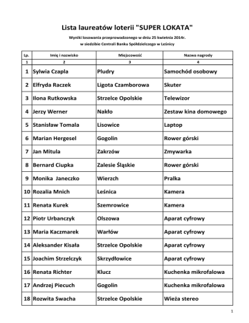 Lista laureatów loterii "SUPER LOKATA" Wyniki losowania przeprowadzonego w dniu 25 kwietnia 2014r. w siedzibie Centrali Banku Spółdzielczego w Leśnicy Lp. Imię i nazwisko Miejscowość Nazwa nagrody 1 2 3 4 1 Sylwia Czapla Pludry Samochód osobowy 2 Elfryda Raczek Ligota Czamborowa Skuter 3 Ilona Rutkowska Strzelce Opolskie Telewizor 4 Jerzy Werner Nakło Zestaw kina domowego 5 Stanisław Tomala Lisowice Laptop 6 Marian Hergesel Gogolin Rower górski 7 Jan Mitula Zakrzów Zmywarka 8 Bernard Ciupka Zalesie Śląskie Rower górski 9 Monika Janeczko Wierzch Pralka 10 Rozalia Mnich Leśnica Kamera 11 Renata Kurek Szemrowice Kamera 12 Piotr Urbanczyk Olszowa Aparat cyfrowy 13 Maria Kaczmarek Warłów Aparat cyfrowy 14 Aleksander Kisała Strzelce Opolskie Aparat cyfrowy 15 Joachim Strzelczyk Skrzydłowice Aparat cyfrowy 16 Renata Richter Klucz Kuchenka mikrofalowa 17 Andrzej Piecuch Gogolin Kuchenka mikrofalowa 18 Rozwita Swacha Strzelce Opolskie Wieża stereo 1 Lp. Imię i nazwisko Miejscowość Nazwa nagrody 1 2 3 4 19 Elżbieta Urbańczyk Jaryszów Wieża stereo 20 Helmut Lazarek Ujazd Wieża stereo 21 Bernard Klosa Ozimek Żelazko 22 Maria Malcherek Stary Ujazd Żelazko 23 Jerzy Barteczko Dolna Żelazko 24 Józef Bocian Strzelce Opolskie Żelazko 25 Maria Koza Kośmidry Żelazko 26 Krystyna Nowak Ligota Dobrodzieńska Żelazko 27 Helena Reimann Turza Żelazko 28 Krystyna Zbruk Klekotna Żelazko 29 Ewa Szponarska Ujazd Żelazko 30 Józef Wypich Lichynia Żelazko 31 Czesław Lachacz Strzelce Opolskie Mikser kuchenny 32 Regina Czellnik Makowczyce Mikser kuchenny 33 Joanna Greitzke Jemielnica Mikser kuchenny 34 Klara Szymańska Ujazd Mikser kuchenny 35 Daria Mateja Szczepanek Mikser kuchenny 36 Henryk Sus Jemielnica Mikser kuchenny 37 Kazimierz Depta Zdzieszowice Mikser kuchenny 38 Klara Kruczek Szymiszów Mikser kuchenny 2 Lp. Imię i nazwisko Miejscowość Nazwa nagrody 1 2 3 4 39 Danuta Baniak Ozimek Mikser kuchenny 40 Bogdan Maks Pawonków Mikser kuchenny 41 Irena Kupka Stary Ujazd Blender 42 Renata Migura Suchodaniec Blender 43 Zdzisława Bienias Suchy Bór Blender 44 Eliza Gordzielik Borycz Blender 45 Justyna Głaba Ujazd Blender 46 Henryk Kandora Łagiewniki Wielkie Blender 47 Krzysztof Janeczko Wierzch Blender 48 Krzysztof Gabor Gąsiorowice Blender 49 Teresa Tomanowska Główczyce Blender 50 Irena Sus Jemielnica Blender Zarząd Banku Spółdzielczego w Leśnicy Strzelce Opolskie dnia 25.04.2014r. 3