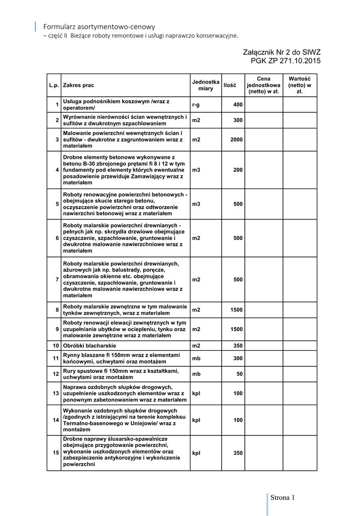 Formularz asortymentowo-cenowy – część II Bieżące roboty remontowe i usługi naprawczo konserwacyjne. Załącznik Nr 2 do SIWZ PGK ZP 271.10.2015 L.p. Zakres prac Cena jednostkowa (netto) w zł. Jednostka Ilość miary 1 Usługa podnośnikiem koszowym /wraz z operatorem/ r-g 400 2 Wyrównanie nierówności ścian wewnętrznych i m2 sufitów z dwukrotnym szpachlowaniem 300 Malowanie powierzchni wewnętrznych ścian i 3 sufitów - dwukrotne z zagruntowaniem wraz z materiałem m2 2000 Drobne elementy betonowe wykonywane z betonu B-30 zbrojonego prętami fi 8 i 12 w tym 4 fundamenty pod elementy których ewentualne posadowienie przewiduje Zamawiający wraz z materiałem m3 200 Roboty renowacyjne powierzchni betonowych obejmujące skucie starego betonu, 5 m3 oczyszczenie powierzchni oraz odtworzenie nawierzchni betonowej wraz z materiałem 500 Roboty malarskie powierzchni drewnianych pełnych jak np. skrzydła drzwiowe obejmujące 6 czyszczenie, szpachlowanie, gruntowanie i dwukrotne malowanie nawierzchniowe wraz z materiałem m2 500 Roboty malarskie powierzchni drewnianych, ażurowych jak np. balustrady, poręcze, obramowania okienne etc. obejmujące 7 czyszczenie, szpachlowanie, gruntowanie i dwukrotne malowanie nawierzchniowe wraz z materiałem m2 500 Roboty malarskie zewnętrzne w tym malowanie m2 tynków zewnętrznych, wraz z materiałem 1500 8 Roboty renowacji elewacji zewnętrznych w tym 9 uzupełnianie ubytków w ociepleniu, tynku oraz malowanie zewnętrzne wraz z materiałem 10 Obróbki blacharskie m2 1500 m2 350 11 Rynny blaszane fi 150mm wraz z elementami końcowymi, uchwytami oraz montażem mb 300 12 Rury spustowe fi 150mm wraz z kształtkami, uchwytami oraz montażem mb 50 Naprawa ozdobnych słupków drogowych, 13 uzupełnienie uszkodzonych elementów wraz z kpl ponownym zabetonowaniem wraz z materiałem 100 Wykonanie ozdobnych słupków drogowych /zgodnych z istniejącymi na terenie kompleksu 14 Termalno-basenowego w Uniejowie/ wraz z montażem kpl 100 Drobne naprawy ślusarsko-spawalnicze obejmujące przygotowanie powierzchni, 15 wykonanie uszkodzonych elementów oraz zabezpieczenie antykorozyjne i wykończenie powierzchni kpl 350 Wartość (netto) w zł. Strona 1 Formularz asortymentowo-cenowy – część II Bieżące roboty remontowe i usługi naprawczo konserwacyjne. Załącznik Nr 2 do SIWZ PGK ZP 271.10.2015 Roboty malarskie powierzchni metalowych, pełnych obejmujące przygotowanie 16 powierzchni ze szlifowaniem, zabezpieczenie antykorozyjne i dwukrotne malowanie nawierzchniowe z materiałem m2 500 Roboty malarskie powierzchni metalowych, ażurowych obejmujące przygotowanie 17 powierzchni ze szlifowaniem, zabezpieczenie antykorozyjne i dwukrotne malowanie nawierzchniowe z materiałem m2 500 WARTOŚĆ NETTO VAT 23% WARTOŚĆ BRUTTO powyższe elementy obejmują następujące czynniki cenotwórcze wg III kwartał 2015: stawka r-g poziom cen robocizny poziom cen sprzętu poziom cen materiałów zł netto wypełnić odpowiednio (min, średnie lub max) wypełnić odpowiednio (min, średnie lub max) wypełnić odpowiednio (min, średnie lub max) koszty ogólne R,S % zysk R, S, Ko % koszty zakupu materiałów % (podpis i pieczątka Wykonawcy lub jego należycie umocowanego przedstawiciela) Miejscowość: ……. dnia ……………. R. Strona 2