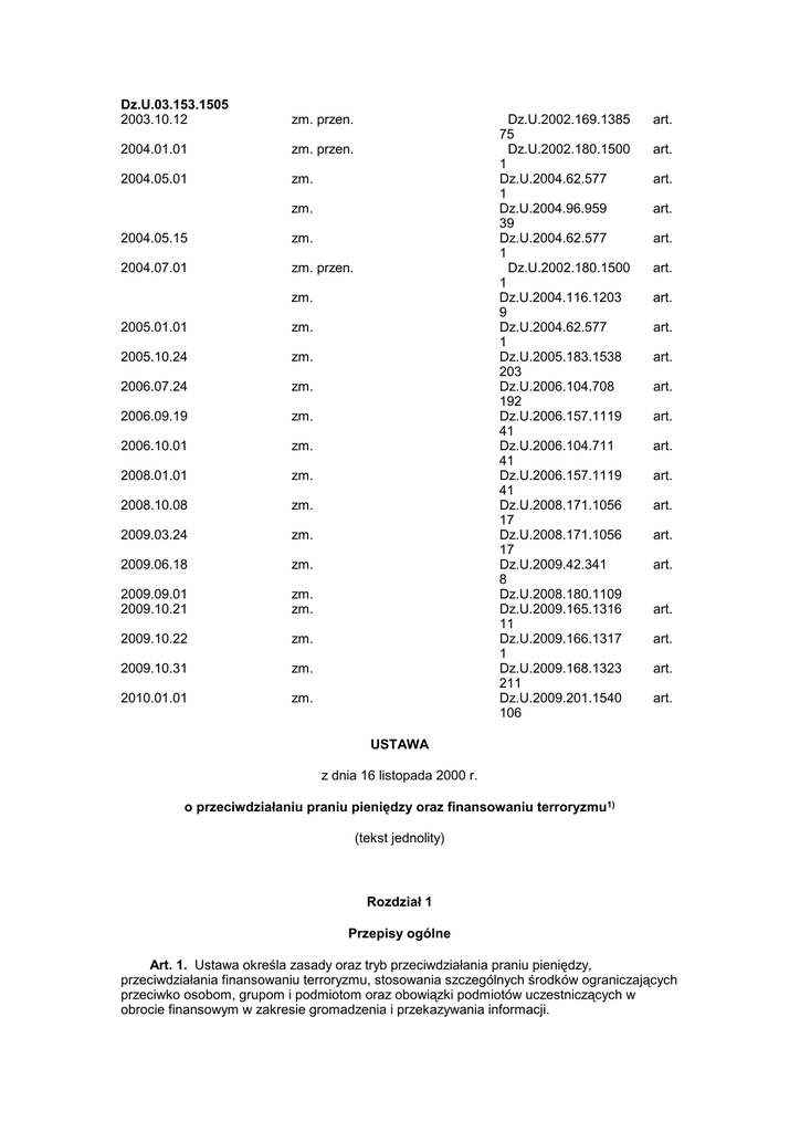 Dz.U.03.153.1505 2003.10.12 zm. przen. 2004.01.01 zm. przen. 2004.05.01 zm. Dz.U.2002.169.1385 75 Dz.U.2002.180.1500 1 Dz.U.2004.62.577 1 Dz.U.2004.96.959 39 Dz.U.2004.62.577 1 Dz.U.2002.180.1500 1 Dz.U.2004.116.1203 9 Dz.U.2004.62.577 1 Dz.U.2005.183.1538 203 Dz.U.2006.104.708 192 Dz.U.2006.157.1119 41 Dz.U.2006.104.711 41 Dz.U.2006.157.1119 41 Dz.U.2008.171.1056 17 Dz.U.2008.171.1056 17 Dz.U.2009.42.341 8 Dz.U.2008.180.1109 Dz.U.2009.165.1316 11 Dz.U.2009.166.1317 1 Dz.U.2009.168.1323 211 Dz.U.2009.201.1540 106 zm. 2004.05.15 zm. 2004.07.01 zm. przen. zm. 2005.01.01 zm. 2005.10.24 zm. 2006.07.24 zm. 2006.09.19 zm. 2006.10.01 zm. 2008.01.01 zm. 2008.10.08 zm. 2009.03.24 zm. 2009.06.18 zm. 2009.09.01 2009.10.21 zm. zm. 2009.10.22 zm. 2009.10.31 zm. 2010.01.01 zm. art. art. art. art. art. art. art. art. art. art. art. art. art. art. art. art. art. art. art. art. USTAWA z dnia 16 listopada 2000 r. o przeciwdziałaniu praniu pieniędzy oraz finansowaniu terroryzmu1) (tekst jednolity) Rozdział 1 Przepisy ogólne Art. 1. Ustawa określa zasady oraz tryb przeciwdziałania praniu pieniędzy, przeciwdziałania finansowaniu terroryzmu, stosowania szczególnych środków ograniczających przeciwko osobom, grupom i podmiotom oraz obowiązki podmiotów uczestniczących w obrocie finansowym w zakresie gromadzenia i przekazywania informacji. Art. 2. Ilekroć w ustawie jest mowa o: 1) instytucji obowiązanej - rozumie się przez to: a) oddziały instytucji kredytowych w rozumieniu ustawy z dnia 29 sierpnia 1997 r. - Prawo bankowe (Dz. U. z 2002 r. Nr 72, poz. 665, z późn. zm.), b) instytucje finansowe mające siedzibę na terytorium Rzeczypospolitej Polskiej, oddziały instytucji finansowych niemających siedziby na terytorium Rzeczypospolitej Polskiej w rozumieniu ustawy z dnia 29 sierpnia 1997 r. - Prawo bankowe, c) banki krajowe, oddziały banków zagranicznych, w rozumieniu ustawy z dnia 29 sierpnia 1997 r. - Prawo bankowe, d) Narodowy Bank Polski - w zakresie, w jakim prowadzi rachunki bankowe dla osób prawnych, sprzedaŜ monet, banknotów i numizmatów przeznaczonych na cele kolekcjonerskie oraz na inne cele, skup złota i wymianę zniszczonych środków płatniczych na podstawie ustawy z dnia 29 sierpnia 1997 r. o Narodowym Banku Polskim (Dz. U. z 2005 r. Nr 1, poz. 2, z późn. zm.), e) instytucje pieniądza elektronicznego, oddziały zagranicznych instytucji pieniądza elektronicznego oraz agentów rozliczeniowych, prowadzących działalność na podstawie ustawy z dnia 12 września 2002 r. o elektronicznych instrumentach płatniczych (Dz. U. Nr 169, poz. 1385, z późn. zm.), f) firmy inwestycyjne, banki powiernicze, w rozumieniu ustawy z dnia 29 lipca 2005 r. o obrocie instrumentami finansowymi (Dz. U. Nr 183, poz. 1538, z późn. zm.), g) zagraniczne osoby prawne prowadzące na terytorium Rzeczypospolitej Polskiej działalność maklerską oraz towarowe domy maklerskie w rozumieniu ustawy z dnia 26 października 2000 r. o giełdach towarowych (Dz. U. z 2005 r. Nr 121, poz. 1019, z późn. zm.), oraz spółki handlowe, o których mowa w art. 50a tej ustawy, h) Krajowy Depozyt Papierów Wartościowych S.A. - w zakresie, w jakim prowadzi rachunki papierów wartościowych, i) podmioty prowadzące działalność - w zakresie gier losowych, zakładów wzajemnych i gier na automatach oraz gier na automatach o niskich wygranych, j) zakłady ubezpieczeń w zakresie ubezpieczeń na Ŝycie, w tym ubezpieczycieli krajowych, główne oddziały ubezpieczycieli z państwa niebędącego członkiem Unii Europejskiej, oddziały ubezpieczycieli z państwa członkowskiego Unii Europejskiej, pośredników ubezpieczeniowych w zakresie ubezpieczeń na Ŝycie, chyba Ŝe za ich działania odpowiedzialność ponosi ubezpieczyciel, k) fundusze inwestycyjne, towarzystwa funduszy inwestycyjnych, w rozumieniu ustawy z dnia 27 maja 2004 r. o funduszach inwestycyjnych (Dz. U. Nr 146, poz. 1546, z późn. zm.), l) spółdzielcze kasy oszczędnościowo-kredytowe, m) publicznego operatora w rozumieniu ustawy z dnia 12 czerwca 2003 r. - Prawo pocztowe (Dz. U. z 2008 r. Nr 189, poz. 1159 oraz z 2009 r. Nr 18, poz. 97), n) notariuszy - w zakresie czynności notarialnych dotyczących obrotu wartościami majątkowymi, adwokatów wykonujących zawód, radców prawnych wykonujących zawód poza stosunkiem pracy w urzędach obsługujących organy administracji rządowej i jednostkach samorządu terytorialnego, prawników zagranicznych świadczących pomoc prawną poza stosunkiem pracy, biegłych rewidentów wykonujących zawód, doradców podatkowych wykonujących zawód, o) podmioty prowadzące działalność w zakresie usługowego prowadzenia ksiąg rachunkowych, p) podmioty prowadzące działalność kantorową, q) przedsiębiorców prowadzących: domy aukcyjne, antykwariaty, działalność factoringową, działalność w zakresie obrotu metalami lub kamieniami szlachetnymi i półszlachetnymi, sprzedaŜy komisowej lub pośrednictwa w obrocie nieruchomościami, r) fundacje, s) stowarzyszenia posiadające osobowość prawną, utworzone na podstawie ustawy z dnia 7 kwietnia 1989 r. - Prawo o stowarzyszeniach (Dz. U. z 2001 r. Nr 79, poz. 855, z 2003 r. Nr 96, poz. 874, z 2004 r. Nr 102, poz. 1055 oraz z 2007 r. Nr 112, poz. 766) oraz przyjmujące płatności w gotówce o wartości równej lub przekraczającej równowartość 15.000 euro, równieŜ w drodze więcej niŜ jednej operacji, t) przedsiębiorców w rozumieniu ustawy z dnia 2 lipca 2004 r. o swobodzie działalności gospodarczej (Dz. U. z 2007 r. Nr 155, poz. 1095, z późn. zm.), przyjmujących płatności za towary w gotówce o wartości równej lub przekraczającej równowartość 15.000 euro, równieŜ gdy naleŜność za określony towar jest dokonywana w drodze więcej niŜ jednej operacji; 1a) beneficjencie rzeczywistym - rozumie się przez to: a) osobę fizyczną lub osoby fizyczne, które są właścicielami osoby prawnej lub sprawują kontrolę nad klientem a