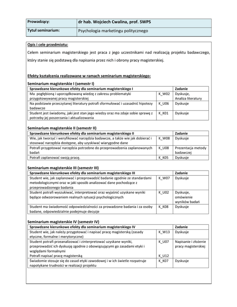 Prowadzący: dr hab. Wojciech Cwalina, prof. SWPS Tytuł seminarium: Psychologia marketingu politycznego Opis i cele przedmiotu: Celem seminarium magisterskiego jest praca z jego uczestnikami nad realizacją projektu badawczego, który stanie się podstawą dla napisania przez nich i obrony pracy magisterskiej. Efekty kształcenia realizowane w ramach seminarium magisterskiego: Seminarium magisterskie I (semestr I) Sprawdzane kierunkowe efekty dla seminarium magisterskiego I Ma pogłębioną i uporządkowaną wiedzę z zakresu problematyki przygotowywanej pracy magisterskiej Na podstawie przeczytanej literatury potrafi sformułować i uzasadnić hipotezy badawcze Student jest świadomy, jaki jest stan jego wiedzy oraz ma zdaje sobie sprawę z potrzeby jej poszerzania i aktualizowania K_U06 Zadanie Dyskusje, Analiza literatury Dyskusje K_K01 Dyskusje K_W08 Zadanie Dyskusje K_W02 Seminarium magisterskie II (semestr II) Sprawdzane kierunkowe efekty dla seminarium magisterskiego II Wie, jak tworzyć i weryfikować narzędzia badawcze, a także wie jak dobierać i stosować narzędzia dostępne, aby uzyskiwać wiarygodne dane Potrafi przygotować narzędzia potrzebne do przeprowadzenia zaplanowanych badań Potrafi zaplanować swoją pracę. K_U08 K_K05 Prezentacja metody badawczej Dyskusje K_W07 Zadanie Dyskusje Seminarium magisterskie III (semestr III) Sprawdzane kierunkowe efekty dla seminarium magisterskiego III Student wie, jak zaplanować i przeprowadzić badanie zgodnie ze standardami metodologicznymi oraz w jaki sposób analizować dane pochodzące z przeprowadzonego badania Student potrafi wyszukiwać, interpretować oraz wyjaśnić uzyskane wyniki będące odwzorowaniem realnych sytuacji psychologicznych Student ma świadomość odpowiedzialności za prowadzone badania i za osoby badane, odpowiedzialnie podejmuje decyzje K_U02 K_K08 Dyskusje, omówienie wyników badań Dyskusje K_W13 Zadanie Dyskusje Seminarium magisterskie IV (semestr IV) Sprawdzane kierunkowe efekty dla seminarium magisterskiego IV Student wie, jak należy przygotować i napisać pracę magisterską (zasady etyczne, formalne i merytoryczne) Student potrafi przeanalizować i zinterpretować uzyskane wyniki, przeprowadzić ich dyskusję zgodnie z obowiązującymi go zasadami etyki i względami formalnymi Potrafi napisać pracę magisterską Świadomie stosuje się do zasad etyki zawodowej i w ich świetle rozpatruje napotykane trudności w realizacji projektu K_U07 K_U12 K_K07 Napisanie i złożenie pracy magisterskiej Dyskusje Tematyka i przykładowe pytania badawcze: Procesy poznawczo-emocjonalne zaangażowane w odbiór reklam politycznych. Psychologiczne wyznaczniki zachowań wyborczych. Psychospołeczne modele decyzji wyborczych. Kształtowanie preferencji i postaw wyborczych w wyniku oddziaływań marketingu politycznego. Kształtowanie wizerunku polityków i partii w trakcie kampanii wyborczych. Poznawcze reprezentacje świata polityki. Skuteczność narzędzi marketingu politycznego w kształtowaniu i utrwalaniu postaw wyborczych. Efektywność oddziaływania reklam politycznych na preferencje i zachowania wyborcze. Psychologiczne uwarunkowania reakcji na wprowadzanie nowych „produktów” politycznych. Strategie uodparniania wyborców na perswazję polityczną. Budowanie wizerunku partii i kandydatów politycznych. Postawy wobec marketingu politycznego. Psychologiczne aspekty wpływu mediów na preferencje wyborcze. Psychologiczne wyznaczniki przywództwa i zarządzania partiami politycznymi. Psychologia organizacji i zarządzania partią polityczną / kampanią polityczną. Opracowanie i skuteczność strategii marketingu politycznego w kształtowaniu zachowań wyborczych. Stereotypy polityczne w poznaniu społecznym. Formowanie się i zmiana wrażeń dotyczących polityków. Wpływ sondaży przedwyborczych na decyzje polityczne obywateli. Socjalizacja polityczna – kształtowanie się postaw wyborczych u młodzieży. Wymagania wobec uczestników seminarium: Wiedza z zakresu psychologii i metodologii badań psychologicznych na poziomie przewidzianym przez materiał zaliczony w toku studiów na SWPS. Gotowość do rozszerzania własnej wiedzy psychologicznej i możliwości jej praktycznych zastosowań. Wstępny harmonogram pracy i warunki zaliczenia: I sem. – ustalenie tematyki pracy, podstaw teoretycznych i metodologii badań; II sem. – szczegółowe zaprojektowanie procedury badawczej oraz przygotowanie i wstępne przetestowanie metod wykorzystywanych w badaniach; rozpoczęcie badań własnych; III sem. – realizacja badań i statystyczne opracowanie uzyskanych wyników; IV sem. – finalizacja pracy magisterskiej. Warunki zaliczenia – standardowe: Terminowa realizacja celów określonych w harmonogramie pracy. Podstawowa literatura do zajęć: Cwalina, W., Falkowski, A. (2005). Marketing polityczny. Perspektywa psychologiczna. Gdańsk: Gdańskie Wydawnictwo Psychologiczne. Brock, T.C., Green, M.C. (red.) (2007). Perswazja. Perspektywa psychologiczna. Kraków: Wydawnictwo Uniwersytetu Jagiellońskiego. Moskowitz., G.B. (2009). Zrozumieć siebie i innych. Psychologia poznania społecznego. Gdańsk: Gdańskie Wydawnictwo Psychologiczne. Forgas, J.P., Williams, K.D., Wheeler, L. (red.) (2005). Umysł społeczny. Gdańsk: Gdańskie Wydawnictwo Psychologiczne. Pratkanis, A., Aronson, E. (2005). Wiek propagandy. Warszawa: Wydawnictwo Naukowe PWN. Wojciszke, B. (2011). Psychologia społeczna. Warszawa: Wydawnictwo Naukowe „Scholar”. Literatura uzupełniająca: Böhner, G., Wänke, M. (2004). Postawy i ich zmiana. Gdańsk: Gdańskie Wydawnictwo Psychologiczne. Cwalina, W. (2000). Telewizyjna reklama polityczna. Lublin: TN KUL. Doliński, D. (2000). Psychologia wpływu społecznego. Wrocław: Ossolineum. Falkowski, A. (2002). Praktyczna psychologia poznawcza: Marketing i reklama. Gdańsk: Gdańskie Wydawnictwo Psychologiczne. Franken, R.E. (2005). Psychologia motywacji. Gdańsk: Gdańskie Wydawnictwo P