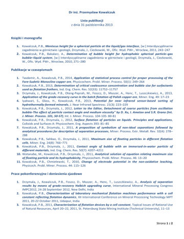 Dr inż. Przemysław Kowalczuk Lista publikacji z dnia 31 października 2013 Książki i monografie 1. Kowalczuk, P.B., Meniscus height for a spherical particle at the liquid/gas interface, [w:] Interdyscyplinarne zagadnienia w górnictwie i geologii, Drzymala, J., Ciezkowski, W., Ofic. Wyd. PWr., Wroclaw, 2011, 243–247 2. Kowalczuk, P.B., Bakalarz, A., Determination of bubble height for hydrophobic spherical particle–gas bubble–liquid system, [w:] Interdyscyplinarne zagadnienia w górnictwie i geologii, Drzymala, J., Ciezkowski, W., Ofic. Wyd. PWr., Wroclaw, 2010, 271–280 Publikacje w czasopismach 1. Tasdemir, A., Kowalczuk, P.B., 2014, Application of statistical process control for proper processing of the Fore-Sudetic Monocline copper ore, Physicochem. Probl. Miner. Process. 50(1): 249–264 2. Kowalczuk, P.B., 2013, Determination of critical coalescence concentration and bubble size for surfactants used as flotation frothers, Ind. Eng. Chem. Res. 52(33): 11752–11757 3. Drzymala, J., Kowalczuk, P.B., Oteng-Peprah, M., Foszcz, D., Muszer, A., Henc, T., Luszczkiewicz, A., 2013, Application of the grade-recovery curve in the batch flotation of Polish copper ore, Miner. Eng. 49: 17–23 4. Iyakwari, S., Glass, H., Kowalczuk, P.B., 2013, Potential for near infrared sensor-based sorting of hydrothermally-formed minerals, J. Near Infrared Spectrosc. 21(3): 223–229 5. Kowalczuk, P.B., Drzymala, J., 2012, Letter to the Editor, Detachment of coarse particles from oscillation bubble-The effect of particle contact angle and medium viscosity" by D. Xu, I. Ametov and S.R. Grano (Int. J. Miner. Process. 101, 50-57), Int. J. Miner. Process. 104-105: 80-81 6. Kowalczuk, P.B., Drzymala, J., 2012, Surface flotation of particles on liquids. Principles and applications, Colloids and Surfaces A: Physicochem. Eng. Aspects 393: 81–85 7. Kowalczuk, P.B., Drzymala, J., 2011, A proposition of symbolism of non-ideal separations followed by analytical procedures for description of separation processes, Miner. Process. Extr. Metall. Rev. 32(4): 278– 288 8. Kowalczuk, P.B., Sahbaz, O., Drzymala, J., 2011, Maximum size of floating particles in different flotation cells, Miner. Eng. 24(8): 766–771 9. Kowalczuk, P.B., Drzymala, J., 2011, Contact angle of bubble with an immersed-in-water particle of different materials, Ind. Eng. Chem. Res. 50(7): 4207–4211 10. Watanabe, M., Kowalczuk, P.B., Drzymala, J., 2011, Analytical solution of equation relating maximum size of floating particle and its hydrophobicity, Physicochem. Probl. Miner. Process. 46: 13–20 11. Kowalczuk, P.B., Chmielewski, T., 2010, Change of electrode potential in the non-oxidative leaching, Physicoch. Probl. Miner. Process. 44: 115–126 Prace pokonferencyjne i doniesienia zjazdowe 1. Drzymala, J., Kowalczuk, P.B., Foszcz, D., Muszer, A., Henc, T., Luszczkiewicz, A., Analysis of separation results by means of grade-recovery Halbich upgrading curve, International Mineral Processing Congress IMPC2012, 24-28 September 2012, New Delhi, India 2. Kowalczuk, P.B., Characterization of laboratory mechanical flotation machines performance with a cell constant reflecting flotation dynamics, XII International Conference on Mineral Processing Technology MPT 2011, 20-22 October 2011, Udaipur, India 3. Kowalczuk, P.B., 2011, Characterization of flotation devices by a cell constant, Topical Issues of Rational Use of Natural Resources, April 20–22, 2011, St. Petersburg State Mining Institute (Technical University), 11–13 Strona 1 z 2 4. Kowalczuk, P.B., 2010, Maximum total adhesive force for the particle-gas bubble-liquid system, Topical Issues of Rational Use of Natural Resources, April 21–23, 2010, St. Petersburg State Mining Institute (Technical University), 91–93. 5. Drzymala, J., Kowalczuk, P.B., 2010, Problems with statistical evaluation of separation results, Proceedings of the 7th International Mineral Processing Symposium, Cappadocia-Nevsehir, Turkey, October 6–8, 2010. O.Y. Gulsoy et al. (eds.). Ankara, Mining Engineering Department, Hacettepe University, 2010, 1191–1202. 6. Kowalczuk, P., Chmielewski, T., 2008, Search for a new technology producing copper from chalcopyrite, Scientific Papers of the Institute of Mining, No. 122, Conferences No. 51, 7th Ph.D. Studies Scientific Conference, Interdisciplinary Topics in Mining and Geology, Ofic. Wyd. PWr., Wroclaw, 94–100 Prace przeglądowe 1. Kowalczuk, P.B., 2012, Opracowanie wyznaczenia empirycznej zależności pomiędzy maksymalnym rozmiarem ziarna flotującego i jego hydrofobowością, Raport Serii SPR nr I11/2012/S-001 2. Kowalczuk, P.B., 2012, Opracowanie zagadnienia wpływu geometrii układu ziarno-pęcherzyk na maksymalny rozmiar flotujących ziaren, Raport Serii SPR nr I11/2012/S-018 3. Kowalczuk, P.B., 2011, Opracowanie zagadnienia wyznaczania średniej średnicy reprezentującej dany zbiór ziarn, Raport serii SPR nr I-11/2011/S-31 4. Kowalczuk, P.B., 2011, Analysis of flotation results performed in the laboratory Mechanobr flotation machine by means of the Halbich upgrading curve, Raport Serii SPR nr I-11/2011/S-20 5. Malewski, J., Kowalczuk, P.B., 2011, Analiza składu ziarnowego rozdrabiania odpadów przywęglowych w kruszarce KKL50E i oszacowanie wydajności kruszenia kruszarek KDU 120/130 i KMU 100/110, Raport serii SPR nr I-11/2011/S-012. 6. Kowalczuk, P.B., 2009, Analityczne rozwiązanie równania flotometrycznego dla warunków dynamicznych, Raport serii SPR nr I11/2009/S-108. 7. Łuszczkiewicz, A., Konopacka, Ż., Muszer, A., Kowalczuk, P., Pietrzyk, G., 2009, Określenie możliwości ograniczenia strat miedzi i srebra w odpadach poflotacyjnych zakładów wzbogacania rud KGHM Polska Miedż S.A. : etap II, Raport serii SPR nr I11/2009/S-008. 8. Kowalczuk, P.B., Drzymala, J., 2008, Solid /water/ air contact angle of materials, Raport serii SPR nr I11/2008/S-067. Strona 2 z 2