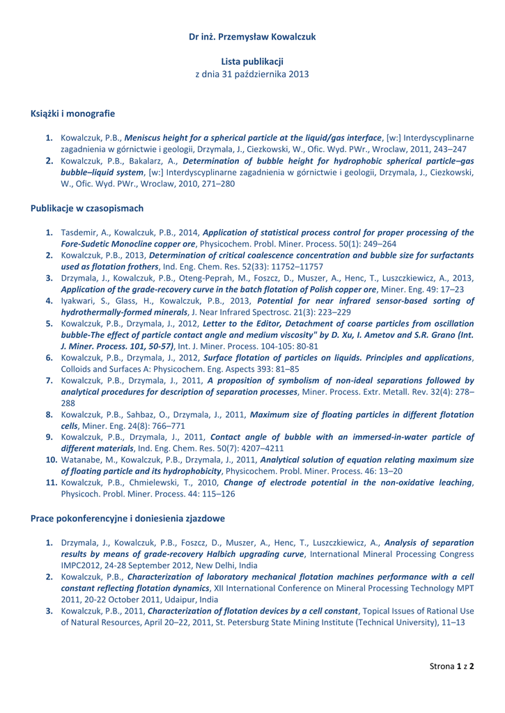 Dr inż. Przemysław Kowalczuk Lista publikacji z dnia 31