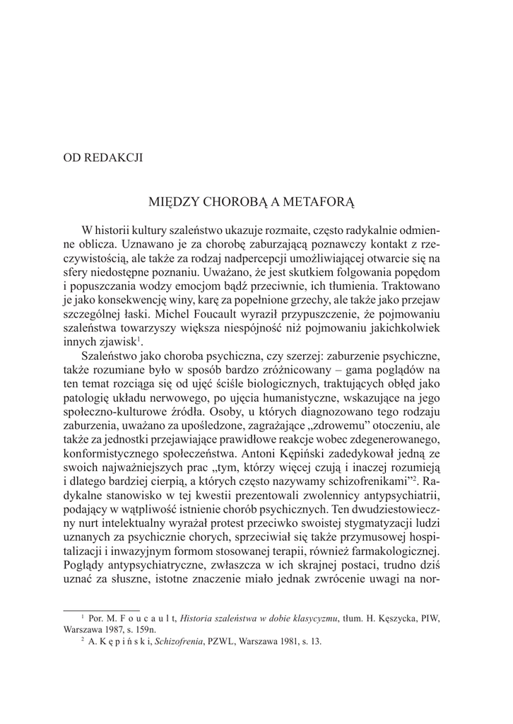 5 OD REDAKCJI MIĘDZY CHOROBĄ A METAFORĄ W historii kultury szaleństwo ukazuje rozmaite, często radykalnie odmienne oblicza. Uznawano je za chorobę zaburzającą poznawczy kontakt z rzeczywistością, ale także za rodzaj nadpercepcji umożliwiającej otwarcie się na sfery niedostępne poznaniu. Uważano, że jest skutkiem folgowania popędom i popuszczania wodzy emocjom bądź przeciwnie, ich tłumienia. Traktowano je jako konsekwencję winy, karę za popełnione grzechy, ale także jako przejaw szczególnej łaski. Michel Foucault wyraził przypuszczenie, że pojmowaniu szaleństwa towarzyszy większa niespójność niż pojmowaniu jakichkolwiek innych zjawisk1. Szaleństwo jako choroba psychiczna, czy szerzej: zaburzenie psychiczne, także rozumiane było w sposób bardzo zróżnicowany – gama poglądów na ten temat rozciąga się od ujęć ściśle biologicznych, traktujących obłęd jako patologię układu nerwowego, po ujęcia humanistyczne, wskazujące na jego społeczno-kulturowe źródła. Osoby, u których diagnozowano tego rodzaju zaburzenia, uważano za upośledzone, zagrażające „zdrowemu” otoczeniu, ale także za jednostki przejawiające prawidłowe reakcje wobec zdegenerowanego, konformistycznego społeczeństwa. Antoni Kępiński zadedykował jedną ze swoich najważniejszych prac „tym, którzy więcej czują i inaczej rozumieją i dlatego bardziej cierpią, a których często nazywamy schizofrenikami”2. Radykalne stanowisko w tej kwestii prezentowali zwolennicy antypsychiatrii, podający w wątpliwość istnienie chorób psychicznych. Ten dwudziestowieczny nurt intelektualny wyrażał protest przeciwko swoistej stygmatyzacji ludzi uznanych za psychicznie chorych, sprzeciwiał się także przymusowej hospitalizacji i inwazyjnym formom stosowanej terapii, również farmakologicznej. Poglądy antypsychiatryczne, zwłaszcza w ich skrajnej postaci, trudno dziś uznać za słuszne, istotne znaczenie miało jednak zwrócenie uwagi na nor1 Por. M. F o u c a u l t, Historia szaleństwa w dobie klasycyzmu, tłum. H. Kęszycka, PIW, Warszawa 1987, s. 159n. 2 A. K ę p i ń s k i, Schizofrenia, PZWL, Warszawa 1981, s. 13. Od Redakcji 6 matywny charakter psychiatrii oraz upomnienie się o traktowanie pacjentów jako pełnoprawnych członków społeczeństwa, z należnym im szacunkiem. Wprawdzie w wieku dwudziestym bezwzględna izolacja i brutalne, nieludzkie wręcz metody postępowania wobec dotkniętych szaleństwem – powszechne od siedemnastego do dziewiętnastego stulecia – należały już do przeszłości, pojawiły się jednak takie tragiczne zjawiska, jak eksterminacja chorych psychicznie w czasach nazizmu czy sowiecka psychiatria represyjna. Z punktu widzenia antropologii filozoficznej definiującej człowieka jako animal rationale istnienie osób szalonych stanowi trudny do przezwyciężenia problem. Jeśli bowiem rozumność stanowi cechę decydującą o człowieczeństwie, to znaczne zaburzenie czy ograniczenie w tym zakresie oznaczałoby, że doświadczająca go jednostka w mniejszym stopniu jest człowiekiem, lub – w przypadku poważnych schorzeń – w ogóle nie zasługuje na to miano. W konsekwencji usprawiedliwione mogłoby być usuwanie chorych psychicznie na margines życia społecznego i pozbawianie ich praw przysługujących wszystkim ludziom. Antropologia personalistyczna nawiązująca do filozofii klasycznej rozwiązuje ten problem dzięki wyraźnemu odróżnieniu samej struktury ontycznej osoby ludzkiej od funkcji tej struktury3 – ograniczenie czy zakłócenie tych funkcji nie powoduje naruszenia struktury osobowej. Zaburzenia psychiczne, nawet głębokie, skutkujące znaczną dysfunkcyjnością w sferze racjonalności, samoświadomości, przeżywania siebie jako podmiotu, stanowienia o sobie, odpowiedzialności czy uczestnictwa we wspólnocie, nie pozbawiają osoby jej cech strukturalnych, mają bowiem charakter przypadłościowy i mogą zostać przezwyciężone – jeśli nie w wymiarze doczesnym, po zastosowaniu odpowiedniej terapii, to w perspektywie eschatologicznej. Nie dotykają one rdzenia człowieczeństwa, którym jest podobieństwo do Stwórcy, odzwierciedlone właśnie w strukturze osobowej. Chory psychicznie zachowuje „niezrównaną wartość ludzkiej istoty, którą Bóg stworzył po to, aby była synem w Synu”4. Owa wartość przysługująca każdemu człowiekowi, czyli godność osobowa, jest bowiem nieutracalna, niezależna od sprawności intelektu, rozsądku, woli czy sfery emocjonalno-popędowej. W swym wymiarze normatywnym godność ta domaga się afirmacji każdej osoby – bez wyjątku – dla niej samej. „Powinność afirmowania osoby dla jej godności jawi się jako powinność bezwarunkowa lub bezwzględna, czyli kategoryczna, zaś akt afirmacji osoby [...] jaśnieje ową bezinteresownością, która nadaje Por. W. C h u d y, Człowiek niepełnosprawny w świetle filozofii, „Ethos” 20(2007) nr 3-4(79-80), s. 68n. 4 J a n P a w e ł II, Ludzie najsłabsi i najbardziej potrzebujący w życiu społeczeństwa (Przesłanie do uczestników międzynarodowego sympozjum na temat „Godność i prawa osoby z upośledzeniem umysłowym”, 5 I 2004, Watykan), „L’Osservatore Romano” wyd. pol. 25(2004) nr 4, s. 16. 3 Od Redakcji 7 mu szczególnego blasku swoiście moralnej wartości, zwanej również godziwością”5. Wynika stąd, że nie tylko dyskryminowanie czy niehumanitarne traktowanie osób chorych psychicznie, ale także wszelkie przejawy ignorowania ich przyrodzonej godności należy uznać za niegodziwe. Obecnie choroby psychiczne rzadko określane bywają mianem szaleństwa, w tym znaczeniu termin ten właściwie już nie występuje. Przywoływany jest zazwyczaj w kontekście społecznym, zwłaszcza obyczajowym, niekiedy też moralnym, w odniesieniu do zachowań odbiegających od powszechnie przyjmowanych wzorców. Pojęcie to nacechowane jest pozytywnie lub negatywnie – szaleńcami nazywani by