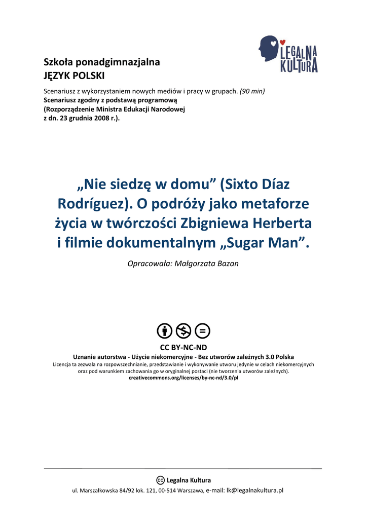Szkoła ponadgimnazjalna JĘZYK POLSKI Scenariusz z wykorzystaniem nowych mediów i pracy w grupach. (90 min) Scenariusz zgodny z podstawą programową (Rozporządzenie Ministra Edukacji Narodowej z dn. 23 grudnia 2008 r.). „Nie siedzę w domu” (Sixto Díaz Rodríguez). O podróży jako metaforze życia w twórczości Zbigniewa Herberta i filmie dokumentalnym „Sugar Man”. Opracowała: Małgorzata Bazan CC BY-NC-ND Uznanie autorstwa - Użycie niekomercyjne - Bez utworów zależnych 3.0 Polska Licencja ta zezwala na rozpowszechnianie, przedstawianie i wykonywanie utworu jedynie w celach niekomercyjnych oraz pod warunkiem zachowania go w oryginalnej postaci (nie tworzenia utworów zależnych). creativecommons.org/licenses/by-nc-nd/3.0/pl ul. Marszałkowska 84/92 lok. 121, 00-514 Warszawa, e-mail: [email protected] Cele lekcji: Uczeń: - doskonali umiejętność analizy i interpretacji tekstu poetyckiego; - doskonali umiejętność analizy i interpretacji filmu/scen filmowych; - dostrzega obecność toposu podróży we współczesnych tekstach kultury i interpretuje go w kontekście losów bohatera. Metody: - praca z tekstami kultury; - praca w grupach; Środki dydaktyczne: - karty pracy; - teksty Zbigniewa Herberta. Przygotowanie do lekcji: Uczniowie i uczennice oglądają przed lekcją film dokumentalny w reż. Malika Bendjelloul Sugar Man. Powiązanie z podstawą programową z języka polskiego: IV etap edukacyjny – zakres podstawowy wymaganie szczegółowe: II. 1.1 prezentuje własne przeżycia wynikające z kontaktu z dziełem sztuki; II. 1.2 określa problematykę utworu; II. 1. 3 rozpoznaje konwencję literacką (stałe pojawianie się danego literackiego rozwiązania w obrębie pewnego historycznie określonego zbioru utworów); II. 2.1 wskazuje zastosowane w utworze środki wyrazu artystycznego i ich funkcje; II.2.4 rozpoznaje w utworze sposoby kreowania świata przedstawionego i bohatera (sytuacja lityczna); II. 3. 1. wykorzystuje w interpretacji elementy znaczące dla odczytania sensu utworu (np. słowa-klucze, wyznaczniki kompozycji); II.3. 2 wykorzystuje w interpretacji utworu konteksty (np. literackie, kulturowe, filozoficzne, religijne); II. 3.3 porównuje funkcjonowanie tych samych motywów w różnych utworach literackich; II. 3. 4 odczytuje treści alegoryczne i symboliczne utworu. ul. Marszałkowska 84/92 lok. 121, 00-514 Warszawa, e-mail: [email protected] Przebieg lekcji: • FAZA WSTĘPNA Swobodna rozmowa z uczniami i uczennicami na temat motywu podróży i jego znaczenia w kulturze. Młodzież powinna wyróżnić dwa podstawowe typy wędrówki: podróż w czasie i przestrzeni oraz podróż w głąb siebie jako próbę dotarcia do prawdy i samoświadomości. Uczniowie i uczennice wymieniają znane im utwory z motywem podróży i bohaterów/bohaterki wędrujących/wędrujące – Kain jako wieczny tułacz, Odyseusz, Mojżesz, Dante (kierunek wertykalny), Kordian; i współczesne przykłady (np.: Bieguni Olgi Tokarczuk, Jadąc do Babadag Andrzeja Stasiuka). • FAZA REALIZACYJNA 1. Analiza i interpretacja utworów Zbigniewa Herberta. Nauczyciel/nauczycielka dzieli klasę na cztery grupy. Każda otrzymuje inny tekst Herberta (Podróż, Modlitwa Pana Cogitopodróżnika, Obłoki nad Ferrarą, Do Yehudy Amichaja – w załącznikach) i wykonuje polecenia zgodnie z kartą pracy (w załącznikach). 2. Prezentacja pracy grupowej. Wspólne formułowanie wniosków. 3. Analiza i interpretacja fragmentów filmu. Praca w tych samych grupach. • Grupa I – analiza scen pokazujących „wędrówkę” Rodrigueza przez miasto – zimą i latem (+tekst piosenki Street boy – w załączniku). • Grupa II – analiza scen pokazujących podróż Rodrigueza do RPA. • Grupa III – analiza filmu - tekstu traktującego o życiu Rodrigueza jako podróży. • Grupa IV – podróż Stephena „Sugar” Segermana – odkrycie prawdy. 4. Prezentacja pracy grupowej. Wspólne formułowanie wniosków. • FAZA PODSUMOWUJĄCA Podsumowanie: porównanie postawy podmiotu lirycznego wierszy Herberta z życiem Sixto Rodrigueza (notatka w punktach lub tabeli), np.: Podmiot liryczny w wierszach Herberta: - przygląda się światu; - jest filozofem, mędrcem; - wie i rozumie znaczenie podróży; - podróż jest nie tylko w głąb siebie, ale też życie jest dla niego podróżą (łączy się z tym, co nieznane, z odkrywaniem siebie); - świat jest dla niego piękny i różnorodny, bogaty i nieodgadniony. Rodriguez: - jest współczesnym mędrcem; - podchodzi do życia spokojnie, z umiarem, jak stoik; - ceni „drobne rzeczy”; - wiedzie normalne życie pracownika budowlanego, ale drzemie w nim artysta; - całe życie się uczy (np.: czyta, chodzi na koncerty, do galerii); - to niejako bohater dychotomiczny – z jednej strony pogodzony z losem, z drugiej marzyciel, wielki artysta; ul. Marszałkowska 84/92 lok. 121, 00-514 Warszawa, e-mail: [email protected] - podróżuje w głąb siebie, ale też „zderza” się z tajemnicą własnej historii i losu – podróż do RPA; - sława go nie zmienia (np.: zarobione pieniądze oddaje rodzinie i przyjaciołom); - jest jak jedwabnik (z gąsienicy „rodzi się” motyl); - świat jest dla niego piękny i różnorodny, bogaty i nieodgadniony. Zadanie domowe: Zastanów się i napisz, w jaki sposób wybór gatunku (film dokumentalny) wpływa na odbiór historii Rodrigueza, rozumianej jako „przypowieść” o artyście i tułaczu. ul. Marszałkowska 84/92 lok. 121, 00-514 Warszawa, e-mail: [email protected] Karty pracy do wierszy Zbigniewa Herberta: Karta pracy nr 1 - Podróż Podróż 1 Jeśli wybierasz się w podróż niech będzie to podróż długa wędrowanie pozornie bez celu błądzenie po omacku żebyś nie tylko oczami ale także dotykiem poznał szorstkość ziemi i abyś całą skórą zmierzył się ze światem 2 Zaprzyjaźń się z Grekiem z Efezu Żydem z Aleksandrii poprowadzą ciebie przez uśpione bazary miasta traktatów kryptoporty