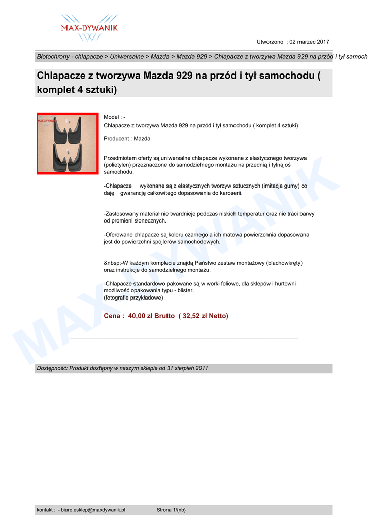 Utworzono : 02 marzec 2017 Błotochrony - chlapacze > Uniwersalne > Mazda > Mazda 929 > Chlapacze z tworzywa Mazda 929 na przód i tył samoch Chlapacze z tworzywa Mazda 929 na przód i tył samochodu ( komplet 4 sztuki) Model : Chlapacze z tworzywa Mazda 929 na przód i tył samochodu ( komplet 4 sztuki) Producent : Mazda Przedmiotem oferty są uniwersalne chlapacze wykonane z elastycznego tworzywa (polietylen) przeznaczone do samodzielnego montażu na przednią i tylną oś samochodu. K I N -Chlapacze wykonane są z elastycznych tworzyw sztucznych (imitacja gumy) co daję gwarancję całkowitego dopasowania do karoserii. A W -Zastosowany materiał nie twardnieje podczas niskich temperatur oraz nie traci barwy od promieni słonecznych. -Oferowane chlapacze są koloru czarnego a ich matowa powierzchnia dopasowana jest do powierzchni spojlerów samochodowych. Y D X A M -W każdym komplecie znajdą Państwo zestaw montażowy (blachowkręty) oraz instrukcje do samodzielnego montażu. -Chlapacze standardowo pakowane są w worki foliowe, dla sklepów i hurtowni możliwość opakowania typu - blister. (fotografie przykładowe) Cena : 40,00 zł Brutto ( 32,52 zł Netto) Dostępność: Produkt dostępny w naszym sklepie od 31 sierpień 2011 kontakt : - [email protected] Strona 1/{nb}