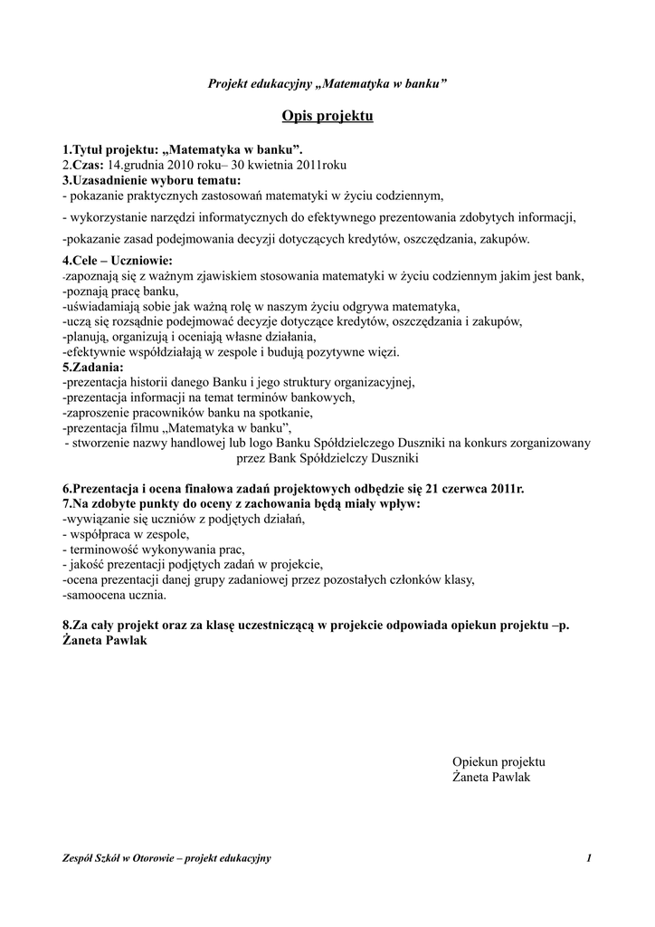Projekt edukacyjny „Matematyka w banku” Opis projektu 1.Tytuł projektu: „Matematyka w banku”. 2.Czas: 14.grudnia 2010 roku– 30 kwietnia 2011roku 3.Uzasadnienie wyboru tematu: - pokazanie praktycznych zastosowań matematyki w życiu codziennym, - wykorzystanie narzędzi informatycznych do efektywnego prezentowania zdobytych informacji, -pokazanie zasad podejmowania decyzji dotyczących kredytów, oszczędzania, zakupów. 4.Cele – Uczniowie: -zapoznają się z ważnym zjawiskiem stosowania matematyki w życiu codziennym jakim jest bank, -poznają pracę banku, -uświadamiają sobie jak ważną rolę w naszym życiu odgrywa matematyka, -uczą się rozsądnie podejmować decyzje dotyczące kredytów, oszczędzania i zakupów, -planują, organizują i oceniają własne działania, -efektywnie współdziałają w zespole i budują pozytywne więzi. 5.Zadania: -prezentacja historii danego Banku i jego struktury organizacyjnej, -prezentacja informacji na temat terminów bankowych, -zaproszenie pracowników banku na spotkanie, -prezentacja filmu „Matematyka w banku”, - stworzenie nazwy handlowej lub logo Banku Spółdzielczego Duszniki na konkurs zorganizowany przez Bank Spółdzielczy Duszniki 6.Prezentacja i ocena finałowa zadań projektowych odbędzie się 21 czerwca 2011r. 7.Na zdobyte punkty do oceny z zachowania będą miały wpływ: -wywiązanie się uczniów z podjętych działań, - współpraca w zespole, - terminowość wykonywania prac, - jakość prezentacji podjętych zadań w projekcie, -ocena prezentacji danej grupy zadaniowej przez pozostałych członków klasy, -samoocena ucznia. 8.Za cały projekt oraz za klasę uczestniczącą w projekcie odpowiada opiekun projektu –p. Żaneta Pawlak Opiekun projektu Żaneta Pawlak Zespół Szkół w Otorowie – projekt edukacyjny 1 Projekt edukacyjny „Matematyka w banku” Instrukcja do projektu "Matematyka w banku" Drodzy Uczniowie! W życiu codziennym często zauważacie na wystawach, w reklamach, w gazetach i wielu innych miejscach napisy które prezentują możliwość skorzystania z kredytu, założenia osobistego konta, ulokowania swoich oszczędności w banku. Wiecie co on oznacza, ale czy na pewno nie dalibyście się nabrać na "super atrakcyjny kredyt"? albo "prawie darmowe zakupy ze względu na sezonową obniżkę lub wyprzedaż towaru"? Czy umielibyście się rozeznać w setkach diagramów drukowanych w gazetach? 1. Celem tego zadania jest zapoznanie się z ważnym zjawiskiem stosowania matematyki w życiu codziennym jakim jest bank. Chcę abyście poznali pracę banku, zwrócili uwagę jak ważną rolę w naszym życiu odgrywa matematyka oraz nauczyli się rozsądnie podejmować decyzje dotyczące kredytów, oszczędzania i zakupów. 2. Przygotowując swoje projekty możecie: - sięgnąć do gazet, książek, internetu, - odwiedzić banki i inne firmy - przyjrzeć się reklamom - porozmawiać z rodzicami i nauczycielami -........... i co jeszcze tylko Wam przyjdzie do głowy i będzie użyteczne 3. Wybierzcie w swej grupie lidera, który będzie organizował Wasze spotkania i reprezentował Waszą grupę. To trudna i ważna funkcja, więc dobrze się zastanówcie. Postarajcie się tak podzielić pracą, aby każdy miał mniej więcej podobną część pracy do wykonania. Po realizacji zadań zapiszcie, kto za co był odpowiedzialny, np. zebranie informacji, opisanie wniosków, narysowanie diagramów, przeprowadzenie ankiet, przepisywanie komputerowe, wymyślenie ciekawej prezentacji itp. 4. W każdym tygodniu trwania projektu możecie konsultować się z opiekunem projektu w sprawie wszelkich wątpliwości. Będę do Waszej dyspozycji. 5. Po upływie miesiąca nastąpi prezentacja przygotowanych przez Was projektów. Od Was zależy w jaki sposób opowiecie innym o swoim temacie i opiszecie pracę swojej grupy. Będziecie mieli na to 10 minut. To niewiele! Zastanówcie się więc dobrze co jest naprawdę najważniejsze i interesujące. Pamiętajcie, że nawet najlepsza praca słabo zaprezentowana może przegrać. Zadbajcie zatem, aby forma prezentacji była ciekawa ( omówienie, przygotowanie plakatu, film itp.) 6. Najlepszą prezentację wybierzemy po wystąpieniu wszystkich grup w tajnym głosowaniu. Na zwycięzców czeka nagroda! 7. Wasza praca będzie oceniana przez opiekuna projektu według następujących kryteriów: - Spełnienie wymagań instrukcji - Zgodność projektu z tematyką - Oryginalność (ciekawe pomysły) - Poprawność obliczeń i rysunków - Zaangażowanie wszystkich członków grupy w pracę Życzę Wam powodzenia, wspaniałych pomysłów i wiele radości z poznawania świata. Zespół Szkół w Otorowie – projekt edukacyjny 2 Projekt edukacyjny „Matematyka w banku” I zadanie projektowe: Prezentacja historii danego Banku i jego struktury organizacyjnej. 1.Zadania podejmuje się grupa do 6 uczniów z klasy. 2.Cele – uczniowie: - szukają niezbędnych informacji, - uczą się współpracy z innymi instytucjami – bankami, - kształcą nawyk aktywnego słuchania, - tworzą materiał filmowy wykorzystując narzędzia informatyczne do zaprezentowania zdobytych wiadomości. 3.Źródła, w których należy szukać potrzebnych informacji: internet, prasa, książki, banki, reklamy. 4.Czas prezentacji : II półrocze roku szk. 2010/2011r 5.Miejsce prezentacji: sala gimnastyczna. 6.Kryteria oceny: - atrakcyjna prezentacja – 5p, - poprawność merytoryczna – 5p, 7.Konsultacji w godzinach pracy udziela p. Żaneta Pawlak. Zespół Szkół w Otorowie – projekt edukacyjny 3 Projekt edukacyjny „Matematyka w banku” II zadanie projektowe: Prezentacja informacji na temat terminów bankowych. 1. Zadania podejmuje się grupa do 6 uczniów z klasy. 2. Cele – uczniowie: - szukają niezbędnych informacji - przygotowują prezentację w postaci materiału filmowego na podstawie zebranych informacji, 3. Źródła, w których należy szukać potrzebnych informacji: internet, prasa, banki, re