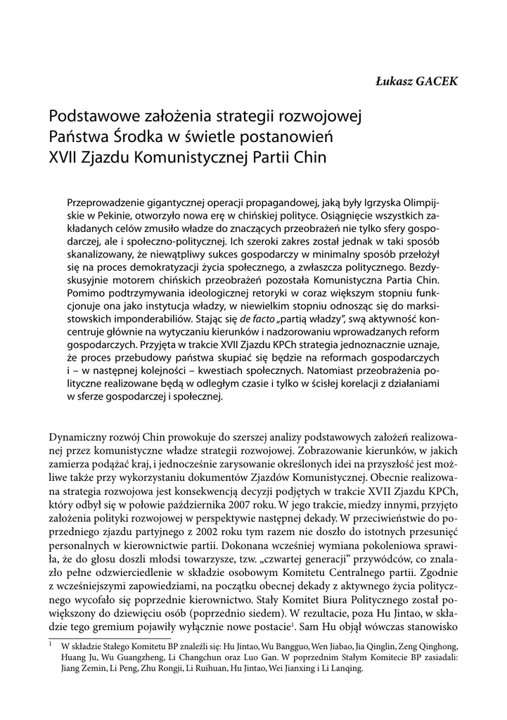 Łukasz GACEK Podstawowe założenia strategii rozwojowej Państwa Środka w świetle postanowień XVII Zjazdu Komunistycznej Partii Chin Przeprowadzenie gigantycznej operacji propagandowej, jaką były Igrzyska Olimpijskie w Pekinie, otworzyło nowa erę w chińskiej polityce. Osiągnięcie wszystkich zakładanych celów zmusiło władze do znaczących przeobrażeń nie tylko sfery gospodarczej, ale i społeczno-politycznej. Ich szeroki zakres został jednak w taki sposób skanalizowany, że niewątpliwy sukces gospodarczy w minimalny sposób przełożył się na proces demokratyzacji życia społecznego, a zwłaszcza politycznego. Bezdyskusyjnie motorem chińskich przeobrażeń pozostała Komunistyczna Partia Chin. Pomimo podtrzymywania ideologicznej retoryki w coraz większym stopniu funkcjonuje ona jako instytucja władzy, w niewielkim stopniu odnosząc się do marksistowskich imponderabiliów. Stając się de facto „partią władzy”, swą aktywność koncentruje głównie na wytyczaniu kierunków i nadzorowaniu wprowadzanych reform gospodarczych. Przyjęta w trakcie XVII Zjazdu KPCh strategia jednoznacznie uznaje, że proces przebudowy państwa skupiać się będzie na reformach gospodarczych i – w następnej kolejności – kwestiach społecznych. Natomiast przeobrażenia polityczne realizowane będą w odległym czasie i tylko w ścisłej korelacji z działaniami w sferze gospodarczej i społecznej. Dynamiczny rozwój Chin prowokuje do szerszej analizy podstawowych założeń realizowanej przez komunistyczne władze strategii rozwojowej. Zobrazowanie kierunków, w jakich zamierza podążać kraj, i jednocześnie zarysowanie określonych idei na przyszłość jest możliwe także przy wykorzystaniu dokumentów Zjazdów Komunistycznej. Obecnie realizowana strategia rozwojowa jest konsekwencją decyzji podjętych w trakcie XVII Zjazdu KPCh, który odbył się w połowie października 2007 roku. W jego trakcie, miedzy innymi, przyjęto założenia polityki rozwojowej w perspektywie następnej dekady. W przeciwieństwie do poprzedniego zjazdu partyjnego z 2002 roku tym razem nie doszło do istotnych przesunięć personalnych w kierownictwie partii. Dokonana wcześniej wymiana pokoleniowa sprawiła, że do głosu doszli młodsi towarzysze, tzw. „czwartej generacji” przywódców, co znalazło pełne odzwierciedlenie w składzie osobowym Komitetu Centralnego partii. Zgodnie z wcześniejszymi zapowiedziami, na początku obecnej dekady z aktywnego życia politycznego wycofało się poprzednie kierownictwo. Stały Komitet Biura Politycznego został powiększony do dziewięciu osób (poprzednio siedem). W rezultacie, poza Hu Jintao, w składzie tego gremium pojawiły wyłącznie nowe postacie1. Sam Hu objął wówczas stanowisko 1 W składzie Stałego Komitetu BP znaleźli się: Hu Jintao, Wu Bangguo, Wen Jiabao, Jia Qinglin, Zeng Qinghong, Huang Ju, Wu Guangzheng, Li Changchun oraz Luo Gan. W poprzednim Stałym Komitecie BP zasiadali: Jiang Zemin, Li Peng, Zhu Rongji, Li Ruihuan, Hu Jintao, Wei Jianxing i Li Lanqing. 78 ROCZNIK BEZPIECZEŃSTWA MIĘDZYNARODOWEGO 2008 sekretarza generalnego, a wkrótce potem także przewodniczącego (prezydenta) ChRL oraz szefa Komisji Wojskowej KC KPCh i państwowej Centralnej Komisji Wojskowej. Na stanowisko premiera został desygnowany Wen Jiabao, który zastąpił odchodzącego Zhu Rongji. Ważnym osiągnięciem XVI Zjazdu KPCh było przyjęcie teorii Trzech Reprezentacji, oznaczającej otwarcie szeregów partyjnych na środowiska prywatnych przedsiębiorców. Nie ulega wątpliwości, iż ów zapis stanowił jedynie potwierdzenie zmian formalnych. W praktyce bowiem wzajemne przenikanie się sfery biznesowej i partyjnej postępowało od wielu lat. Warto podkreślić, że w 2006 roku w sektorze prywatnym pracowało 2,86 mln przedstawicieli partii komunistycznej. Nie zaskakuje w tym kontekście polityka pozyskiwania nowych członków w ramach tej właśnie grupy społecznej. Na początku 2007 roku Wydział Organizacyjny oświadczył, że 330 tysięcy pracowników partyjnych zostanie oddelegowanych do pracy w prywatnych przedsiębiorstwach, celem pomocy w organizacji organów partyjnych i pozyskiwania nowych członków2. Należy zauważyć, że chińska partia komunistyczna wchodzi w nowy etap rozwoju, o czym świadczy rosnąca liczba nowo wstępujących w jej szeregi (w 2006 roku zrzeszała ona ponad 72 mln członków). Na uwagę zasługuje fakt, że partia ciągle otwiera się na nowe środowiska, nieuwzględniane wcześniej w polityce partyjnej. Dużym sukcesem władz staje się przyciągnięcie młodych ludzi i kobiet3. Zdaniem Bruce’a J. Dicksona partia komunistyczna pozostaje przy władzy, ponieważ nie funkcjonuje oprócz niej żadna realna alternatywa polityczna. Ponadto jest w stanie zarówno zapewnić konkretne korzyści swoim działaczom, jak i przyciągnąć nowych członków spośród poszczególnych sektorów społeczeństwa. Postępujący proces modernizacji i duża dynamika systemu społeczno-gospodarczego sprawia, że nie może ona pozostawać bierna, lecz musi dokonywać przekształceń w ramach własnej struktury organizacyjnej i budować na nowych podstawach relacje ze społeczeństwem. Nowa strategia zakłada z jednej strony stworzenie nowych więzi instytucjonalnych ze społeczeństwem, poprzez kreowanie całej sieci różnego rodzaju organizacji społecznych, tj. izby handlowe, stowarzyszenia zawodowe, sportowe i inne, a z drugiej włączanie nowo powstających elit społecznych, głównie elit zawodowych i prywatnych przedsiębiorców. Trudno jednak mówić o jednolitej platformie dotyczącej budowania relacji ze społeczeństwem, jak również pozyskiwania nowych członków. Można tu raczej zaobserwować – jak zauważył Dickson – kształtowanie relacji wielowymiarowych z poszczególnymi sektorami społecznymi oraz wkomponowania ich w realizowaną przez partię strategię dotyczącą modernizacji4. Warto zauważyć, ż