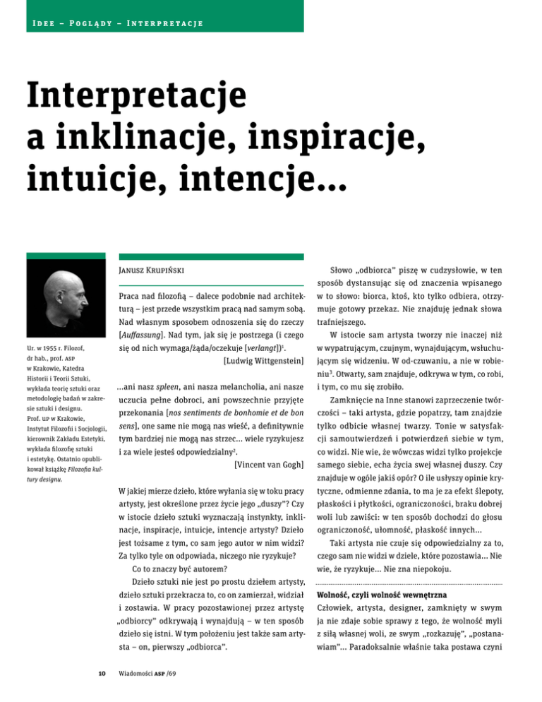 I d e e – P o gl ą dy – I n t e r p r etac j e Interpretacje a inklinacje, inspiracje, intuicje, intencje… Janusz Krupiński Słowo „odbiorca” piszę w cudzysłowie, w ten sposób dystansując się od znaczenia wpisanego Praca nad filozofią – dalece podobnie nad architek‑ turą – jest przede wszystkim pracą nad samym sobą. muje gotowy przekaz. Nie znajduję jednak słowa Nad własnym sposobem odnoszenia się do rzeczy trafniejszego. [Auffassung]. Nad tym, jak się je postrzega (i czego się od nich wymaga/żąda/oczekuje [verlangt])1. Ur. w 1955 r. Filozof, w to słowo: biorca, ktoś, kto tylko odbiera, otrzy‑ dr hab., prof. ASP [Ludwig Wittgenstein] w Krakowie, Katedra W istocie sam artysta tworzy nie inaczej niż w wypatrującym, czujnym, wynajdującym, wsłuchu‑ jącym się widzeniu. W od‑czuwaniu, a nie w robie‑ niu3. Otwarty, sam znajduje, odkrywa w tym, co robi, Historii i Teorii Sztuki, wykłada teorię sztuki oraz metodologię badań w zakre‑ sie sztuki i designu. …ani nasz spleen, ani nasza melancholia, ani nasze uczucia pełne dobroci, ani powszechnie przyjęte i tym, co mu się zrobiło. Zamknięcie na Inne stanowi zaprzeczenie twór‑ przekonania [nos sentiments de bonhomie et de bon czości – taki artysta, gdzie popatrzy, tam znajdzie Instytut Filozofii i Socjologii, sens], one same nie mogą nas wieść, a definitywnie tylko odbicie własnej twarzy. Tonie w satysfak‑ kierownik Zakładu Estetyki, tym bardziej nie mogą nas strzec… wiele ryzykujesz cji samoutwierdzeń i potwierdzeń siebie w tym, wykłada filozofię sztuki i za wiele jesteś odpowiedzialny . Prof. UP w Krakowie, i estetykę. Ostatnio opubli‑ 2 co widzi. Nie wie, że wówczas widzi tylko projekcje [Vincent van Gogh] samego siebie, echa życia swej własnej duszy. Czy W jakiej mierze dzieło, które wyłania się w toku pracy tyczne, odmienne zdania, to ma je za efekt ślepoty, kował książkę Filozofia kul‑ znajduje w ogóle jakiś opór? O ile usłyszy opinie kry‑ tury designu. artysty, jest określone przez życie jego „duszy”? Czy płaskości i płytkości, ograniczoności, braku dobrej w istocie dzieło sztuki wyznaczają instynkty, inkli‑ woli lub zawiści: w ten sposób dochodzi do głosu nacje, inspiracje, intuicje, intencje artysty? Dzieło ograniczoność, ułomność, płaskość innych… jest tożsame z tym, co sam jego autor w nim widzi? Za tylko tyle on odpowiada, niczego nie ryzykuje? Co to znaczy być autorem? Taki artysta nie czuje się odpowiedzialny za to, czego sam nie widzi w dziele, które pozostawia… Nie wie, że ryzykuje… Nie zna niepokoju. Dzieło sztuki nie jest po prostu dziełem artysty, 10 dzieło sztuki przekracza to, co on zamierzał, widział Wolność, czyli wolność wewnętrzna i zostawia. W pracy pozostawionej przez artystę Człowiek, artysta, designer, zamknięty w swym „odbiorcy” odkrywają i wynajdują – w ten sposób ja nie zdaje sobie sprawy z tego, że wolność myli dzieło się istni. W tym położeniu jest także sam arty‑ z siłą własnej woli, ze swym „rozkazuję”, „postana‑ sta – on, pierwszy „odbiorca”. wiam”… Paradoksalnie właśnie taka postawa czyni Wiadomości asp /69 Dzieło sztuki nie jest po prostu dzie‑ łem artysty, dzieło sztuki przekracza to, co on zamierzał, widział i zostawia. W pracy pozostawionej przez artystę „odbiorcy” odkrywają i wynajdują – w ten sposób dzieło się istni. go zniewolonym. Tym, czego mu brakuje, jest wolność że się myli, że jest w błędzie, że iluzja, że zło panują od swego ja, od swych inklinacji, intuicji, intencji… w jego duszy – chociaż bierze, ma je za dobro. Brakuje mu wolności, tej podstawowej, pier‑ Zdaje sobie sprawę z tego, że korzenie zła tkwią wotnej, jeśli nie jedynej wolności, jaką jest wolność w nim samym. wewnętrzna. Na tę składa się zdolność zdystansowa‑ Stare imię takiej rozmowy, która toczy się nia wobec swych obserwacji, zdań, sądów, projektów, w kimś, to „sumienie”. Tak niegdyś nazywano gotowość do podjęcia prób zrozumienia zdań, sądów wewnętrzną dyskusję. Jeśli nawet słowo to budzi odmiennych, innych, a zarazem gotowość i zdolność dzisiaj awersję, to nie zmieni ideału: tylko w takim do dyskusji z nimi. wewnętrznym sporze spełnia się akt wolności. Wbrew pozorom ostatecznie dyskusja może się toczyć tylko w kimś. Powtórzę, ostatecznie wolność jest wolnością wewnętrzną, zakłada ideę prawdy, rozróżnienie Próbuję zrozumieć, rozważyć sens wypowiedzi dobra i zła… Ta idea, to rozróżnienie stanowią innych, a nie ulegam przy tym ich sposobowi wypo‑ jedyne rzeczywiste oparcie człowieka w jego czło‑ wiadania, nastrojowi chwili, gorączce rozdyskutowa‑ wieczeństwie. Na nich polega wolność. nia… Nie mogę utwierdzać się i siebie w potakiwaniu Nikt nie jest samotny o tyle, o ile inni, dzieła innych. Jakkolwiek troszczyliby się o mnie, jakkol‑ innych, a nawet jego własne dzieła mogą dać wiek solidaryzowaliby się ze mną… impuls do wewnętrznego sporu. Do wewnętrznej Podobnie artysta, który ulega reakcjom, wypo‑ przemiany! Jednak w tym sporze jest samotny. wiedziom, uczuciom „widowni”, społeczności, który Wolny o tyle, o ile zmaga się z samym sobą. O ile bierze je za kryterium oceny, ulega zniewoleniu. w ten spór wchodzi… Ulega: co za radość ogarnia go, gdy słyszy wypowia‑ Owocem twórczej chwili jest przemiana… Jednak daną wobec jego dzieła formułkę: „Podoba mi się!”. zbyt wielu popada w kult przemiany dla samej prze‑ Dystansując się od samego siebie, w swoim własnym wnętrzu wytwarzam przestrzeń na Inne… miany. Transgresja, przekroczenie, przeskok, rewo‑ lucja, a nawet samo negowanie i negacja uchodzą Sam potrafię wejść w rozmowę, w dyskusję, w spór z powód do dumy, cel. Być może akty takie otwie‑ z oglądami i poglądami, które właśnie sam żywi