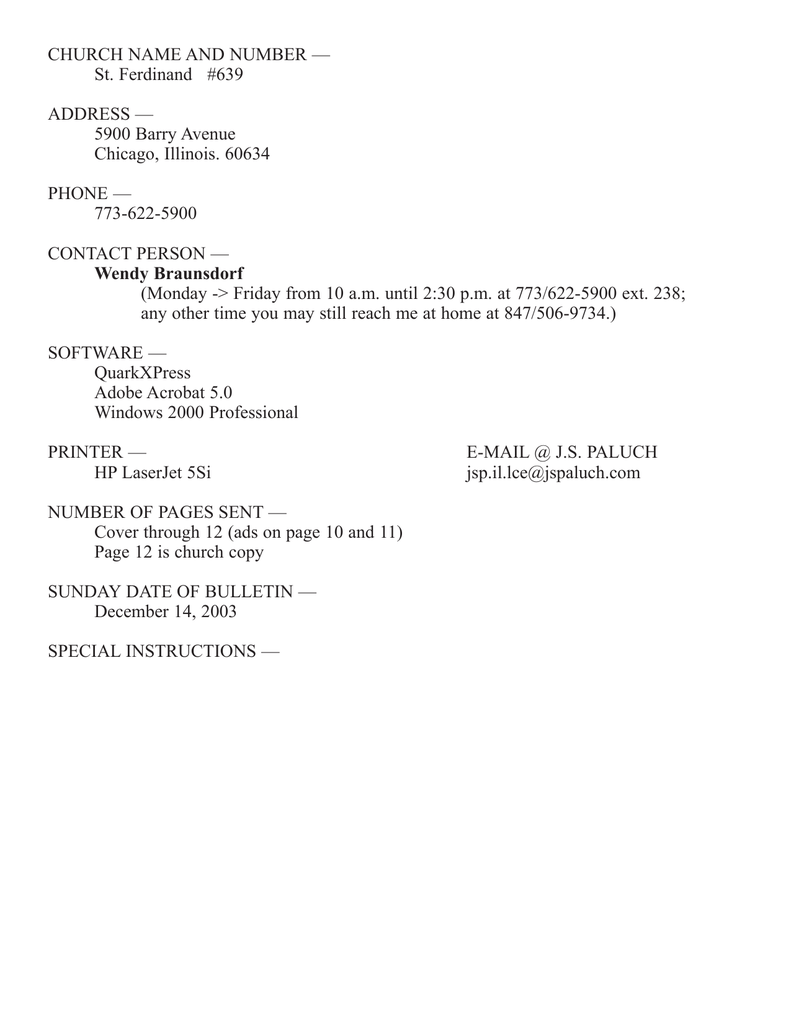 CHURCH NAME AND NUMBER — St. Ferdinand #639 ADDRESS — 5900 Barry Avenue Chicago, Illinois. 60634 PHONE — 773-622-5900 CONTACT PERSON — Wendy Braunsdorf (Monday -> Friday from 10 a.m. until 2:30 p.m. at 773/622-5900 ext. 238; any other time you may still reach me at home at 847/506-9734.) SOFTWARE — QuarkXPress Adobe Acrobat 5.0 Windows 2000 Professional PRINTER — HP LaserJet 5Si NUMBER OF PAGES SENT — Cover through 12 (ads on page 10 and 11) Page 12 is church copy SUNDAY DATE OF BULLETIN — December 14, 2003 SPECIAL INSTRUCTIONS — E-MAIL @ J.S. PALUCH [email protected] St. Ferdinand Church RECTORY: 5900 WEST BARRY AVENUE PHONE: 773/622-5900 Photo by Romuald Gluch December 14, 2003 Third Sunday of Advent Page Two Third Sunday of Advent December 14, 2003 The sanctuary lamps this week are lit for: Guziel Family ^Rose, Ann & Charles Coco MONDAY, Advent Weekday 7:00 AM—Helen Grzybek rq. Family & Friends 8:00 AM—Claudio Clemente rq. Richard & Wendy Braunsdorf Family TUESDAY, Advent Weekday 7:00 AM—John J. Cortesi rq. Order of the Holy Sepulchre of Jerusalem 8:00 AM—Peter & Alexander Lewandowski rq. Family WEDNESDAY, Late Advent Weekday 7:00 AM—John Grabinski rq. Ellen Hyndman 7:00 AM—(Chapel)Mass in Polish 8:00 AM—Michael Lans rq. Ladies of St. Anne THURSDAY, Late Advent Weekday 7:00 AM—Frank Obruzt rq. Envelope Group 8:00 AM—Claudio Clemente rq. St. Ferdinand Church & School Staff FRIDAY, Late Advent Weekday 7:00 AM—Ann Dallmeier rq. Family 8:00 AM—Claudio Clemente rq. Past Faculty Members of St. Ferdinand School SATURDAY, Late Advent Weekday 7:00 AM—Mass in Polish 8:00 AM—James Handschiegel rq. Sister Sunday Anticipated Mass 5:00 PM—Albert Mastrangelo rq. Sister 6:30 PM—(Chapel)Simbang Gabi SUNDAY, Fourth Sunday of Advent 7:30 AM—Collette Family rq. Jeanine Gizel 7:30 AM—(Chapel) o b³og. Bo¿e z okazji urodzin dla Tomasza Bro¿ek 9:00 AM—Lee Duckett rq. Wife 10:30 AM—(Chapel)Rose Frost rq. Husband & Family 10:45 AM—^Ludwik Gruszkiewicz; ^Kazimierz Szef, Anna G³¹biñska; ^Andrzej Kruszewski; ^Bronis³aw Jeromiñski; ^Józef Sak w 4 m-ce po œm. 12:15 PM—(Chapel) Mass in Italian 12:30 PM—Bruno Wojcik rq. The Foss Family 3:00 PM—^Józef ¯uchowski w 7 rocz. œm, Krystyna ¯uchowska 5:00 PM—Ray Krystyniak (2nd Anniv.) rq. Wife & Children 6:30 PM—z okazji 75 rocz.urodzin dla mamy Józefy z proœb¹ o zdrowie i b³og. Bo¿e Please welcome the School Children at the 8:00 AM Mass on Friday, December 19th. They will participate at Mass before being dismissed from school for the Christmas break. Many, many thanks to the Girl Scouts and Boy Scouts who helped replace the Missals and Hymnals in the church. You made the job quick and easy. HANDMAIDS E. Konopka, M. Netzel 3rd publication None 2nd publication Tomasz Stok³osa and Ewa Kapryœ Czes³aw Szwajnos and Lidia Barnaœ Grzegorz Bobala and Ma³gorzata Wedrychowicz 1st publication Rafa³ Wilczek and Beata (Nowak) Majewski Daniel Frys and Barbara Krawiec WE WELCOME IN BAPTISM Olivia Maria, daughter of Gregory and Urszula (Kulik) Kozio³ Advent Reconciliation Liturgy The parish will celebrate the sacrament of Penance in a communal service appropriate to the season of Advent on Tuesday, December 23rd. The celebration will begin at 7:00 p.m. in the Church. Again, we wish to encourage all who have been away from the church or the sacraments to take this opportunity to return. All will be asked to acknowledge their sinfulness before God and the gathered community, to seek mercy, and to receive the Church’s absolution. In this way we can enter into Christmas reconciled with God, neighbor and self. Please pray that through this celebration some will be brought home, released from the burden of sin and guilt, and begin healing in Christ. Individual confessions are also heard each Saturday morning from 8:45-9:30, and on December 20th from 3:30-4:30 p.m. Op³atki, the traditional Christmas wafer, is available after Mass from the Ushers. A donation of $1.00 per envelope is requested. December 14, 2003 Third Sunday of Advent Advent Reconciliation Service Tuesday, December 23rd at 7:00 p.m. 4:00 PM Midnight Midnight Christmas Eve: Church Church Chapel Family English Italian Christmas Day: 7:30 AM Church English 9:00 AM Church English 12:30 PM Church English 12:15 PM Chapel Italian There will be no evening Masses on Christmas Day. 5:00 PM New Year's Eve: Church English New Year's Day: 7:30 AM Church English 9:00 AM Church English 12:30 PM Church English 12:15 PM Chapel Italian There will be no evening Masses on New Year's Day. Our Financial Support of St. Ferdinand Parish December 6-7, 2003: Envelopes: $ 8,965.50 Loose Cash: $ 3,236.00 TOTAL DONATIONS: $12,201.50 Amount over/ (under) weekly budget: ($2,798.50) We continue to experience below-budget offertory collections at an alarming rate each week, a situation that has existed throughout the first six months of this fiscal year. We are projecting an approximate 20% deficit in offertory income. As we stated in an October bulletin, it was our previous intention to publish last year’s annual report during November; however, due to the serious financial situation we are currently facing, a special mailing will be sent to all registered parishioners early in the new year once we have the added information of our financial six-month report. The 2004th year of our Lord is quickly approaching and we will certainly receive many blessings, but next year will also challenge us as a parish community to address several serious financial realities. May the Lord Jesus, whom we await this Advent, bless you abundantly for all that you do for His Church. Dan Costigan, Business Manager Page Three As members of the parish faith community, it is our responsibility to remember both in concrete and spiritual ways those who cannot celebrate with us each week because they are ill. Those who are sick in turn, remember all of us daily in their prayers and in their suf