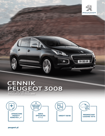 + $ odkup style CENNIK PEUGEOT 3008$ WAŻNY OD 2.06.2016 PRODUKCJA OD MAJA 2016 kredyt PAKIETY KORZYŚCI „+” ubezpieczenie pakiety s t y l eSERIA k o m fo r t komunikacyjne k rKREDYT e d y t 50/50 SPECJALNA STYLE style k re d y t 101 leasing k r e d y tPROMOCYJNY LEASING 101% 3x 33% 3x 33% peugeot.pl k r e d yktr e d y t 3x 33% + +$ p a k iATRAKCYJNE e toyd k u p odkup kredyt pakiety kredyt ubezpieczenie kkroem d yutn i k a c y j n e + pakiety 3x 33% kredyt 101 k o m fo r t leasing CENY CROSSOVER SKRZYNIA BIEGÓW ACTIVE STYLE ALLURE 1,2 PureTech 130 KM M6 S&S 85 900 zł 88 400 zł 96 900 zł 1,6 BlueHDi 120 KM M6 S&S 95 300 zł 97 800 zł 106 300 zł 2,0 BlueHDi 150 KM M6 S&S 100 300 zł 102 800 zł 111 300 zł M6 – manualna skrzynia biegów o 6 przełożeniach S&S – system Stop & Start PAKIETY WYPOSAŻENIA CENA 7600 ZŁ STYLE+ NAWIGACJA SZKLANY DACH PANORAMICZNY PAKIET LUSTERKA ALARM CENA 6100 ZŁ ACTIVE+ NAWIGACJA CZUJNIKI COFANIA ALARM ALLURE+ CENA 5500 ZŁ ALARM PAKIET VISION 2 WYPOSAŻENIE BEZPIECZEŃSTWO I ZABEZPIECZENIA ANTYKRADZIEŻOWE ACTIVE STYLE ALLURE ABS ze wspomaganiem hamowania awaryjnego (AFU) S S S ESP – system stabilizacji toru jazdy S S S ASR – system kontroli trakcji S S S REF – elektroniczny rozdzielacz siły hamowania oś przednia/tylna S S S DRC – system redukcji wahań wokół osi wzdłużnej pojazdu (Dynamic Rolling Control) (standard dla silnika 2,0 BlueHDi 150 KM) S S S Hamulec postojowy elektryczny (FSE) z funkcją Hill Assist S S S Poduszki czołowe dla kierowcy i pasażera (pasażera z możliwością dezaktywacji) S S S Poduszki boczne w pierwszym rzędzie foteli S S S Poduszki kurtynowe dla pierwszego i drugiego rzędu foteli S S S Przednie pasy bezpieczeństwa z regulacją wysokości położenia + napinacze i ograniczniki siły napięcia S S S Pasy bezpieczeństwa w drugim rzędzie 3-punktowe S S S Kontrolki niezapiętych pasów z przodu z funkcją ostrzegania o wypięciu pasów S S S Kontrolki niezapiętych pasów w drugim rzędzie z funkcją ostrzegania o wypięciu pasów S S S Mocowania fotelika dziecięcego Isofix (x2) w drugim rzędzie siedzeń S S S Reflektory przednie halogenowe + światła do jazdy dziennej LED S S S Reflektory przednie przeciwmgłowe z chromowanym wykończeniem S S S System tylnego oświetlenia z funkcją ostrzegania innych użytkowników drogi w przypadku nagłego hamowania pojazdu S S S 1300 zł S S Asystent parkowania: – czujniki parkowania z przodu – funkcja pomiaru dostępnego miejsca do parkowania równoległego z wizualizacją – S 1500 zł Centralny zamek sterowany pilotem: – 2 piloty zdalnego sterowania – blokowanie drzwi podczas ruszania S S S Immobiliser S S S 1500 zł 1500 zł 1500 zł Wspomaganie kierownicy progresywne S S S Regulacja kolumny kierownicy manualna w dwóch płaszczyznach S S S Tempomat z ogranicznikiem prędkości ze sterowaniem z kolumny kierownicy S S S Przednia szyba akustyczna S S S Elektrycznie sterowane szyby boczne: – sterowanie sekwencyjne z blokadą przycięcia – domykanie okien przy zamykaniu samochodu – elektryczna blokada otwarcia tylnych drzwi i okien przez dzieci S S S 350 zł 350 zł S Lusterka boczne sterowane i podgrzewane elektrycznie + zintegrowane migacze S S S Lusterka boczne składane elektrycznie (dla Active i Style tylko z opcją Pakiet Lusterka) P P S Lusterko wewnętrzne elektrochromatyczne (dla Active i Style tylko z opcją Pakiet Lusterka) P P S Schowki otwarte: – po stronie kierowcy w desce rozdzielczej – na desce rozdzielczej poniżej wlotów powietrza [brak przy obecności Head-Up Display (VTH)] – na desce rozdzielczej nad sterowaniem klimatyzacji (tylko przy wyborze opcji WIP Nav 2) – na boku konsoli środkowej po stronie pasażera – w tylnej części konsoli środkowej S S S Czujniki parkowania z tyłu Alarm: – superzamek centralny KOMFORT Rolety przeciwsłoneczne dla drugiego rzędu siedzeń 3 KOMFORT ACTIVE STYLE ALLURE Schowki zamykane: – w desce rozdzielczej pod kolumną kierownicy – w desce rozdzielczej przed pasażerem, podświetlany – w konsoli środkowej pod podłokietnikiem, podświetlany, klimatyzowany – w podłodze, w drugim rzędzie siedzeń S S S Gniazda 12V: – w konsoli środkowej przy dźwigni zmiany biegów – w tylnej części konsoli środkowej poniżej schowka otwartego S S S Uchwyt na napoje w konsoli środkowej S S S Podłokietnik centralny na konsoli środkowej S S S Kieszenie w drzwiach bocznych z przodu i z tyłu S S S Osłony przeciwsłoneczne z lusterkami dla kierowcy i pasażera S S – Osłony przeciwsłoneczne z podświetlanymi lusterkami dla kierowcy i pasażera – – S Oświetlenie wnętrza: – 1 lampka główna + 2 lampki do czytania w konsoli sufitowej z przodu – 1 lampka w konsoli sufitowej w drugim rzędzie foteli – oświetlenie progów z przodu – oświetlenie bagażnika S S – Oświetlenie wnętrza (dla Active i Style tylko z opcją Szklany dach panoramiczny Cielo): – 1 lampka główna + 2 lampki do czytania w konsoli sufitowej z przodu – 1 lampka główna + 2 lampki do czytania w konsoli sufitowej w drugim rzędzie foteli – oświetlenie progów z przodu – oświetlenie bagażnika P P S Oświetlenie ambiente: – 1 dioda LED w konsoli sufitowej z przodu – oświetlenie miejsca na nogi z przodu – – S Klimatyzacja automatyczna dwustrefowa + filtr przeciwpyłkowy z węglem aktywnym S S S Nawiewy dla drugiego rzędu siedzeń w tylnej części konsoli środkowej S S S Tylna szyba ogrzewana + wycieraczka S S S Fotele przednie: – manualna regulacja wzdłużna foteli – manualna regulacja pochylenia oparć foteli – manualna regulacja wysokości foteli – kieszeń na mapę w oparciach foteli S S – Fotele przednie: – manualna regulacja wzdłużna foteli – manualna regulacja pochylenia oparć foteli – manualna regulacja wysokości foteli – kieszeń na mapę w oparciach foteli – regulacja lędźwiowa fotela kierowcy – oparcie fotela pasażera składane 