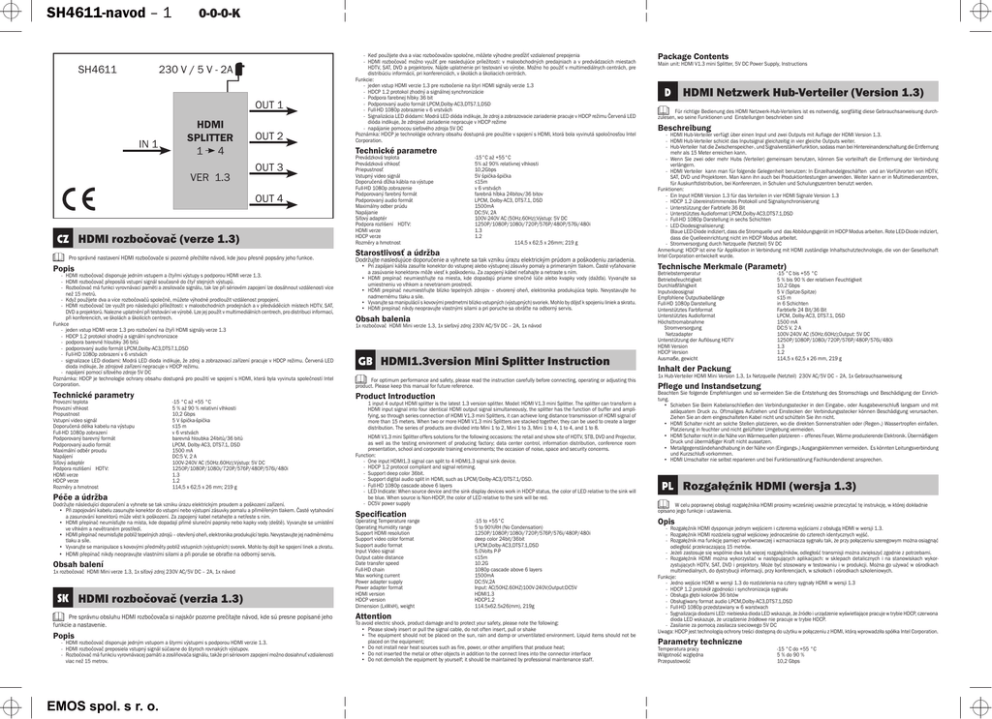 SH4611-navod – 1 0-0-0-K 230 V / 5 V - 2A SH4611 OUT 1 IN 1 HDMI SPLITTER 1 4 VER 1.3 OUT 2 Technické parametre OUT 3 OUT 4 CZ HDMI rozbočovač (verze 1.3) Pro správné nastavení HDMI rozbočovače si pozorně přečtěte návod, kde jsou přesně popsány jeho funkce. Popis - HDMI rozbočovač disponuje jedním vstupem a čtyřmi výstupy s podporou HDMI verze 1.3. - HDMI rozbočovač přeposílá vstupní signál současně do čtyř stejných výstupů. - Rozbočovač má funkci vyrovnávací paměti a zesilovače signálu, tak lze při sériovém zapojení lze dosáhnout vzdálenosti více než 15 metrů. - Když použijete dva a více rozbočovačů společně, můžete výhodně prodloužit vzdálenost propojení. - HDMI rozbočovač lze využít pro následující příležitosti: v maloobchodních prodejnách a v předváděcích místech HDTV, SAT, DVD a projektorů. Nalezne uplatnění při testování ve výrobě. Lze jej použít v multimediálních centrech, pro distribuci informací, při konferencích, ve školách a školících centrech. Funkce - jeden vstup HDMI verze 1.3 pro rozbočení na čtyři HDMI signály verze 1.3 - HDCP 1.2 protokol shodný a signální synchronizace - podpora barevné hloubky 36 bitů - podporovaný audio formát LPCM,Dolby-AC3,DTS7.1,DSD - Full-HD 1080p zobrazení v 6 vrstvách - signalizace LED diodami: Modrá LED dioda indikuje, že zdroj a zobrazovací zařízení pracuje v HDCP režimu. Červená LED dioda indikuje, že zdrojové zařízení nepracuje v HDCP režimu. - napájení pomocí síťového zdroje 5V DC Poznámka: HDCP je technologie ochrany obsahu dostupná pro použití ve spojení s HDMI, která byla vyvinuta společností Intel Corporation. Technické parametry Provozní teplota Provozní vlhkost Propustnost Vstupní video signál Doporučená délka kabelu na výstupu Full-HD 1080p zobrazení Podporovaný barevný formát Podporovaný audio formát Maximální odběr proudu Napájení Síťový adaptér Podpora rozlišení HDTV: HDMI verze HDCP verze Rozměry a hmotnost -15 °C až +55 °C 5 % až 90 % relativní vlhkosti 10,2 Gbps 5 V špička-špička ≤15 m v 6 vrstvách barevná hloubka 24bitů/36 bitů LPCM, Dolby-AC3, DTS7.1, DSD 1500 mA DC:5 V, 2 A 100V-240V AC (50Hz.60Hz);Výstup: 5V DC 1250P/1080P/1080i/720P/576P/480P/576i/480i 1.3 1.2 114,5 x 62,5 x 26 mm; 219 g Péče a údržba Dodržujte následující doporučení a vyhnete se tak vzniku úrazu elektrickým proudem a poškození zařízení. • Při zapojování kabelu zasunujte konektor do vstupní nebo výstupní zásuvky pomalu a přiměřeným tlakem. Časté vytahování a zasunování konektorů může vést k poškození. Za zapojený kabel netahejte a netřeste s ním. • HDMI přepínač neumísťujte na místa, kde dopadají přímé sluneční paprsky nebo kapky vody (deště). Vyvarujte se umístění ve vlhkém a nevětraném prostředí. • HDMI přepínač neumisťujte poblíž tepelných zdrojů – otevřený oheň, elektronika produkující teplo. Nevystavujte jej nadměrnému tlaku a síle. • Vyvarujte se manipulace s kovovými předměty poblíž vstupních (výstupních) svorek. Mohlo by dojít ke spojení linek a zkratu. • HDMI přepínač nikdy neopravujte vlastními silami a při poruše se obraťte na odborný servis. Obsah balení 1x rozbočovač HDMI Mini verze 1.3, 1x síťový zdroj 230V AC/5V DC – 2A, 1x návod SK HDMI rozbočovač (verzia 1.3) Pre správnu obsluhu HDMI rozbočovača si najskôr pozorne prečítajte návod, kde sú presne popísané jeho funkcie a nastavenie. Popis - HDMI rozbočovač disponuje jedným vstupom a štyrmi výstupmi s podporou HDMI verzie 1.3. - HDMI rozbočovač preposiela vstupný signál súčasne do štyroch rovnakých výstupov. - Rozbočovač má funkciu vyrovnávacej pamäti a zosilňovača signálu, takže pri sériovom zapojení možno dosiahnuť vzdialenosti viac než 15 metrov. EMOS spol. s r. o. - Keď použijete dva a viac rozbočovačov spoločne, môžete výhodne predĺžiť vzdialenosť prepojenia - HDMI rozbočovač možno využiť pre nasledujúce príležitosti: v maloobchodných predajniach a v predvádzacích miestach HDTV, SAT, DVD a projektorov. Nájde uplatnenie pri testovaní vo výrobe. Možno ho použiť v multimediálnych centrách, pre distribúciu informácií, pri konferenciách, v školách a školiacich centrách. Funkcie: - jeden vstup HDMI verzie 1.3 pre rozbočenie na štyri HDMI signály verzie 1.3 - HDCP 1.2 protokol zhodný a signálnej synchronizácie - Podpora farebnej hĺbky 36 bit - Podporovaný audio formát LPCM,Dolby-AC3,DTS7.1,DSD - Full-HD 1080p zobrazenie v 6 vrstvách - Signalizácia LED diódami: Modrá LED dióda indikuje, že zdroj a zobrazovacie zariadenie pracuje v HDCP režimu Červená LED dióda indikuje, že zdrojové zariadenie nepracuje v HDCP režime - napájanie pomocou sieťového zdroja 5V DC Poznámka: HDCP je technológie ochrany obsahu dostupná pre použitie v spojení s HDMI, ktorá bola vyvinutá spoločnosťou Intel Corporation. Prevádzková teplota Prevádzková vlhkosť Priepustnosť Vstupný video signál Doporučená dĺžka kábla na výstupe Full-HD 1080p zobrazenie Podporovaný farebný formát Podporovaný audio formát Maximálny odber prúdu Napájanie Síťový adaptér Podpora rozlišení HDTV: HDMI verze HDCP verze Rozměry a hmotnost -15°C až +55°C 5% až 90% relatívnej vlhkosti 10,2Gbps 5V špička-špička ≤15m v 6 vrstvách farebná hĺbka 24bitov/36 bitov LPCM, Dolby-AC3, DTS7.1, DSD 1500mA DC:5V, 2A 100V-240V AC (50Hz.60Hz);Výstup: 5V DC 1250P/1080P/1080i/720P/576P/480P/576i/480i 1.3 1.2 114,5 x 62,5 x 26mm; 219 g Starostlivosť a údržba Dodržujte nasledujúce doporučenie a vyhnete sa tak vzniku úrazu elektrickým prúdom a poškodeniu zariadenia. • Pri zapájaní kábla zasuňte konektor do vstupnej alebo výstupnej zásuvky pomaly a primeraným tlakom. Časté vyťahovanie a zas