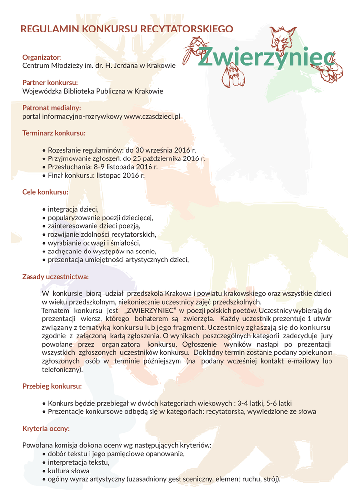 A UZwierzyniec P Q REGULAMIN KONKURSU RECYTATORSKIEGO Organizator: Centrum M³odzie¿y im. dr. H. Jordana w Krakowie Partner konkursu: Wojewódzka Biblioteka Publiczna w Krakowie Patronat medialny: portal informacyjno-rozrywkowy www.czasdzieci.pl Terminarz konkursu: • Rozes³anie regulaminów: do 30 wrzeœnia 2016 r. • Przyjmowanie zg³oszeñ: do 25 paŸdziernika 2016 r. • Przes³uchania: 8-9 listopada 2016 r. • Fina³ konkursu: listopad 2016 r. Cele konkursu: • integracja dzieci, • popularyzowanie poezji dzieciêcej, • zainteresowanie dzieci poezj¹, • rozwijanie zdolnoœci recytatorskich, • wyrabianie odwagi i œmia³oœci, • zachêcanie do wystêpów na scenie, • prezentacja umiejêtnoœci artystycznych dzieci, Zasady uczestnictwa: W konkursie bior¹ udzia³ przedszkola Krakowa i powiatu krakowskiego oraz wszystkie dzieci w wieku przedszkolnym, niekoniecznie uczestnicy zajêæ przedszkolnych. Tematem konkursu jest „ZWIERZYNIEC” w poezji polskich poetów. Uczestnicy wybieraj¹ do prezentacji wiersz, którego bohaterem s¹ zwierzêta. Ka¿dy uczestnik prezentuje 1 utwór zwi¹zany z tematyk¹ konkursu lub jego fragment. Uczestnicy zg³aszaj¹ siê do konkursu zgodnie z za³¹czon¹ kart¹ zg³oszenia. O wynikach poszczególnych kategorii zadecyduje jury powo³ane przez organizatora konkursu. Og³oszenie wyników nast¹pi po prezentacji wszystkich zg³oszonych uczestników konkursu. Dok³adny termin zostanie podany opiekunom zg³oszonych osób w terminie póŸniejszym (na podany wczeœniej kontakt e-mailowy lub telefoniczny). Przebieg konkursu: • Konkurs bêdzie przebiega³ w dwóch kategoriach wiekowych : 3-4 latki, 5-6 latki • Prezentacje konkursowe odbêd¹ siê w kategoriach: recytatorska, wywiedzione ze s³owa Kryteria oceny: Powo³ana komisja dokona oceny wg nastêpuj¹cych kryteriów: • dobór tekstu i jego pamiêciowe opanowanie, • interpretacja tekstu, • kultura s³owa, • ogólny wyraz artystyczny (uzasadniony gest sceniczny, element ruchu, strój). Nagrody: • zwyciêzcy konkursu otrzymuj¹ dyplomy oraz nagrody • dyplomy otrzymuj¹ równie¿ opiekunowie laureatów • o iloœci nagród decyduj¹ organizatorzy i jurorzy Zg³oszenia: Centrum M³odzie¿y im. dr. H. Jordana, ul. Krupnicza 38, 31-123 Kraków Dodatkowe informacje mo¿na uzyskaæ: adres jw., tel. 430 00 15 w. 245, Anna Ziêba, e-mail: [email protected] Anna Dranka-Szot, e-mail: [email protected] Zg³oszenie DZIECKA do konkursu jest równoznaczne ze zgod¹ na przetwarzanie danych osobowych (publikacja nazwiska w protokole jury oraz na stronie internetowej CM) oraz udostêpnianie wizerunku na zdjêciach z fina³u konkursu (publikowanych równie¿ na stronie www.cmjordan.krakow.pl) Zg³oszenia do 25 paŸdziernika 2016 r. KARTA ZG£OSZENIA KONKURS RECYTATORSKI dla dzieci w wieku przedszkolnym „ZWIERZYNIEC” Organizator: Centrum M³odzie¿y im. dr. H. Jordana w Krakowie Partner konkursu: Wojewódzka Biblioteka Publiczna w Krakowie Patronat medialny: portal informacyjno-rozrywkowy www.czasdzieci.pl 1. Imiê i nazwisko uczestnika, wiek ……………………………………………………………………………………............................... 2. Przedszkole, adres ……………………………………………………………………………………............................... 3. Opiekun, telefon kontaktowy, e-mail ……………………………………………………………………………………............................... 4. Prezentowany utwór ……………………………………………………………………………………............................... 5. Rodzaj kategorii prezentacji ……………………………………………………………………………………...............................