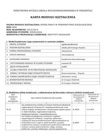 PAŃSTWOWA WYŻSZA SZKOŁA WSCHODNIOEUROPEJSKA W PRZEMYŚLU KARTA MODUŁU KSZTAŁCENIA NAZWA MODUŁU KSZTAŁCENIA: RYNEK PRACY W PERSPEKTYWIE SOCJOLOGICZNEJ KOD: M50 ROK AKADEMICKI: 2013/2014 KIERUNEK STUDIÓW: SOCJOLOGIA JEDNOSTKA PROWADZĄCA KIERUNEK: INSTYTUT SOCJOLOGII I. Moduł kształcenia i jego usytuowanie w systemie studiów 1. PROFIL STUDIÓW ogólnoakademicki 2. POZIOM KSZTAŁCENIA studia pierwszego stopnia 3. FORMA PROWADZENIA STUDIÓW stacjonarne 4. STATUS MODUŁU obowiązkowy 5. KATEGORIA MODUŁU kształcenia kierunkowego 6. USYTUOWANIE MODUŁU W PLANIE STUDIÓW semestr III 7. JĘZYK WYKŁADOWY polski 8. LICZBA PUNKTÓW ECTS PRZYPISANA MODUŁOWI 2 9. FORMA I WYMIAR ZAJĘĆ DYDAKTYCZNYCH Konserwatorium – 20 godz. 10. FORMA ZAKOŃCZENIA ZAJĘĆ DYDAKTYCZNYCH Zaliczenie z oceną 11. KOORDYNATOR MODUŁU dr Grzegorz Kubiński 12. PROWADZĄCY MODUŁ dr Grzegorz Kubiński II. Modułowe efekty kształcenia z odniesieniem do kierunku i obszaru efektów kształcenia Kod modułowe efekty kształcenia 1 Opis efektów kształcenia dla modułu Odniesienie do kierunkowych efektów kształcenia Odniesienie do obszarowych efektów kształcenia 2 3 4 W_01 ma podstawową wiedzę na temat instytucji lokalnych, regionalnych, krajowych i międzynarodowych oraz relacji między strukturami i instytucjami społecznymi w skali lokalnej, regionalnej krajowej, międzynarodowej i międzykulturowej K_W03 S1A_W03 W_02 ma wiedzę socjologiczną o normach i regułach organizujących struktury i instytucje społeczne i rządzących nimi prawidłowościach odpowiedzialnych za transmisję norm i reguł w społeczeństwie, posiada podstawową wiedzę o instytucjach społecznych takich jak rodzina i system pokrewieństwa, religia, systemy polityczne, systemy edukacyjne, systemy gospodarcze, K_W07 S1A_W07 nauka itp. zna i rozumie podstawowe zasady etyki zawodowej, w tym zasady poszanowania własności przemysłowej K_W10 i intelektualnej wykorzystuje zdobytą wiedzę do formułowania sądów na temat ludzkiego działania oraz K_U06 przewidywania jego społecznych konsekwencji prawidłowo identyfikuje i rozstrzyga dylematy zawodowe, cechuje go wrażliwość etyczna, K_K04 odpowiedzialność i zainteresowanie problematyką społeczną W_03 U_01 K_01 S1A_W10 S1A_U06 S1A_K04 III. Treści kształcenia – oddzielnie dla każdej formy zajęć dydaktycznych (W – wykład; C - ćwiczenia; K – konwersatorium; L - laboratorium; PR – projekt, PKZ - praktyka zawodowa; WT – Warsztat) Kod form zajęć dydaktycznych K1. Szczegółowy opis treści realizowanych w ramach zajęć wg form zajęć dydaktycznych SOCJOLOGICZNE KONCEPCJE I UJĘCIA PROBLEMATYKI PRACY Praca w ujęciach makrosystemowych, socjologia pracy, problematyka pracy w koncepcjach rozwijanych w ramach teorii zarządzania, praca w systemie realnego socjalizmu. Liczba godzin 1 1 K2. RYNEK PRACY W KAPITALIŹMIE PONOWOCZESNYM Rozwój technik i technologii wytwarzania, dezindustrializacja gospodarek, wzrost bezzatrudnieniowy, wiodąca rola kapitału intelektualnego, globalizacja gospodarki i społeczeństw a rynek pracy, Wiodąca rola kapitału intelektualnego, globalizacja gospodarki i społeczeństw a rynek pracy K3. PODSTAWOWE KATEGORIE RYNKU PRACY Zatrudnienie i jego funkcje, definicje rynku pracy, podaż i popyt na rynku pracy, funkcja rynku pracy i jego główne podmioty. K4. SEGMENTACJA RYNKU PRACY Zawodowe rynki pracy, wewnętrzny i zewnętrzny rynek pracy, lokalne rynki pracy, nieformalny rynek pracy czyli praca na czarno. 1 1 1 K5. ELASTYCZNE FORMY ZATRUDNIENIA I ORGANIZACJI PRACY Kontraktowanie pracy, umowy o pracę na czas określony, zatrudnienie w częściowym wymiarze czasu pracy, samozatrudnienie, wypożyczanie pracowników, dzielenie pracy, praca w domu oraz telepraca 1 K6. FORMY I ZASIĘG PRAKTYK DYSKRYMINACYJNYCH NA RYNKU PRACY Dyskryminacja ze względu na płeć, dyskryminacja ze względu na wiek, dyskryminacja niepełnosprawnych 1 K7. BEZROBOCIE JAKO ZJAWISKO SPOŁECZNE Typy bezrobocia (bezrobocie długoterminowe, bezrobocie dobrowolne, bezrobocie utajone i podzatrudnienie), społeczny obraz bezrobocia w Polsce, zachowania bezrobotnych i reakcja na nie, społeczne skutki bezrobocia, zapobieganie bezrobociu i jego skutkom, kategorie społeczne zagrożone bezrobociem długotrwałym 1 K8. K9. MOBILNOŚĆ PRACOWNIKÓW NA RYNKU PRACY Mobilność przestrzenna, mobilność międzyzakładowa, mobilność zakładowa i edukacyjna, przepływy siły roboczej między zatrudnieniem, bezrobociem i biernością zawodową w Polsce, okresowe emigracje zarobkowe 1 EDUKACJA A RYNEK PRACY Zależności między rynkiem pracy i systemem edukacyjnym, edukacja dorosłych i poradnictwo zawodowe, ustawiczne kształcenie imperatywem rozwoju społecznogospodarczego, zasoby ludzkie a rynek pracy 1 K10. SYTUACJA NA POLSKIM RYNKU PRACY PO WSTĄPIENIU DO UNII EUROPEJSKIEJ Wielkość i struktura zatrudnienia, poziom i dynamika płac, wielkość i struktura bezrobocia, wykorzystanie funduszy strukturalnych na cele polityki rynku pracy w Unii Europejskiej i Polsce 1 K11 POLITYKI I STRATEGIE RYNKU PRACY Dwa modele przeciwdziałania bezrobociu (model polityki rynku pracy oraz model makroekonomicznej polityki prozatrudnieniowej), polityka rynku pracy w Polsce i Unii Europejskiej, tworzenie publiczno-niepublicznego modelu rynku pracy, zmiana sposobu aktywizacji zawodowej bezrobotnych, nowe strategie wspierające zatrudnienie bezrobotnych, polityka rynku pracy w Polsce i Unii Europejskiej, tworzenie publiczno-niepublicznego modelu rynku pracy, zmiana sposobu aktywizacji zawodowej bezrobotnych, nowe strategie wspierające zatrudnienie bezrobotnych 1 K12. K13 K14 K15 K16 K17 K18 K19 K20 K21 K22 RAZEM ŹRÓDŁA WIEDZY O RYNKU PRACY W POLSCE Źródła urzędowe, Badania Aktywności Ekonomicznej Ludności, socjologiczne badania rynku pracy RYNEK PRACY W GOSPODARKACH ŚWIATOWYCH 1 Ukazanie specyfiki gospodarki socjalistycznej. Problemy biurokratyzacji, planowania centralnego, interwencj